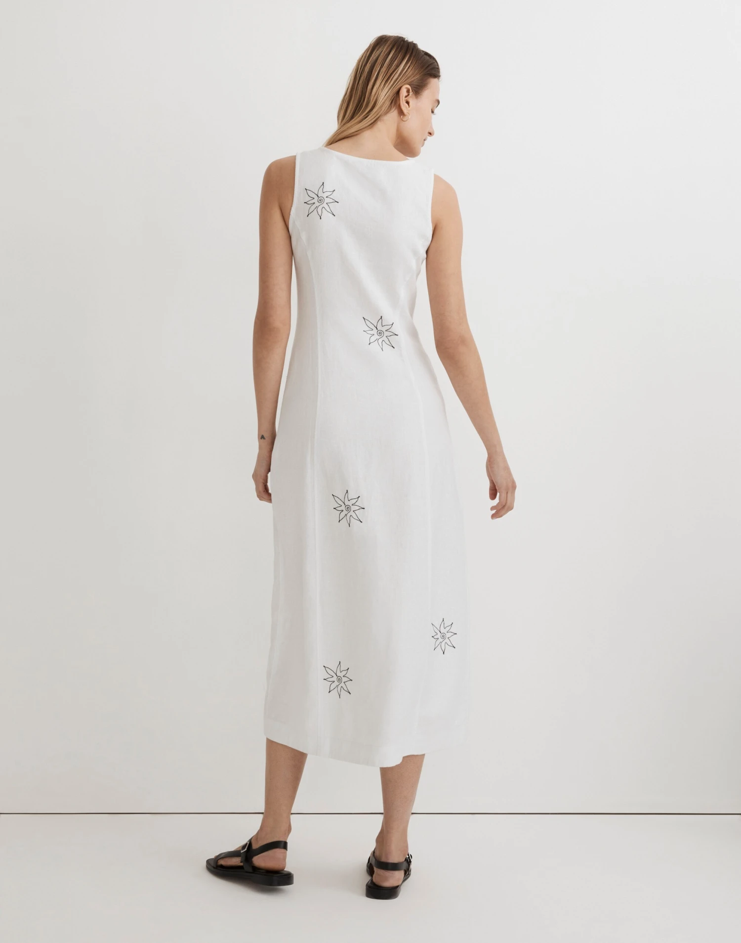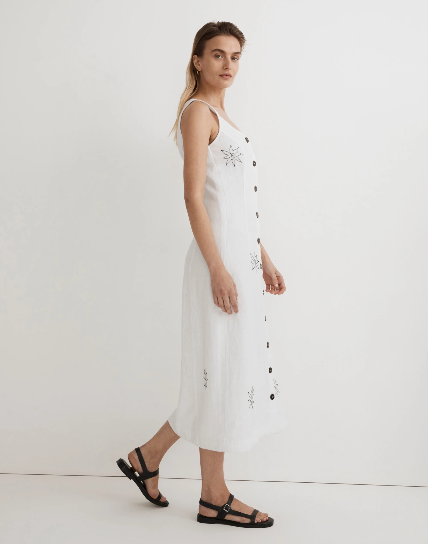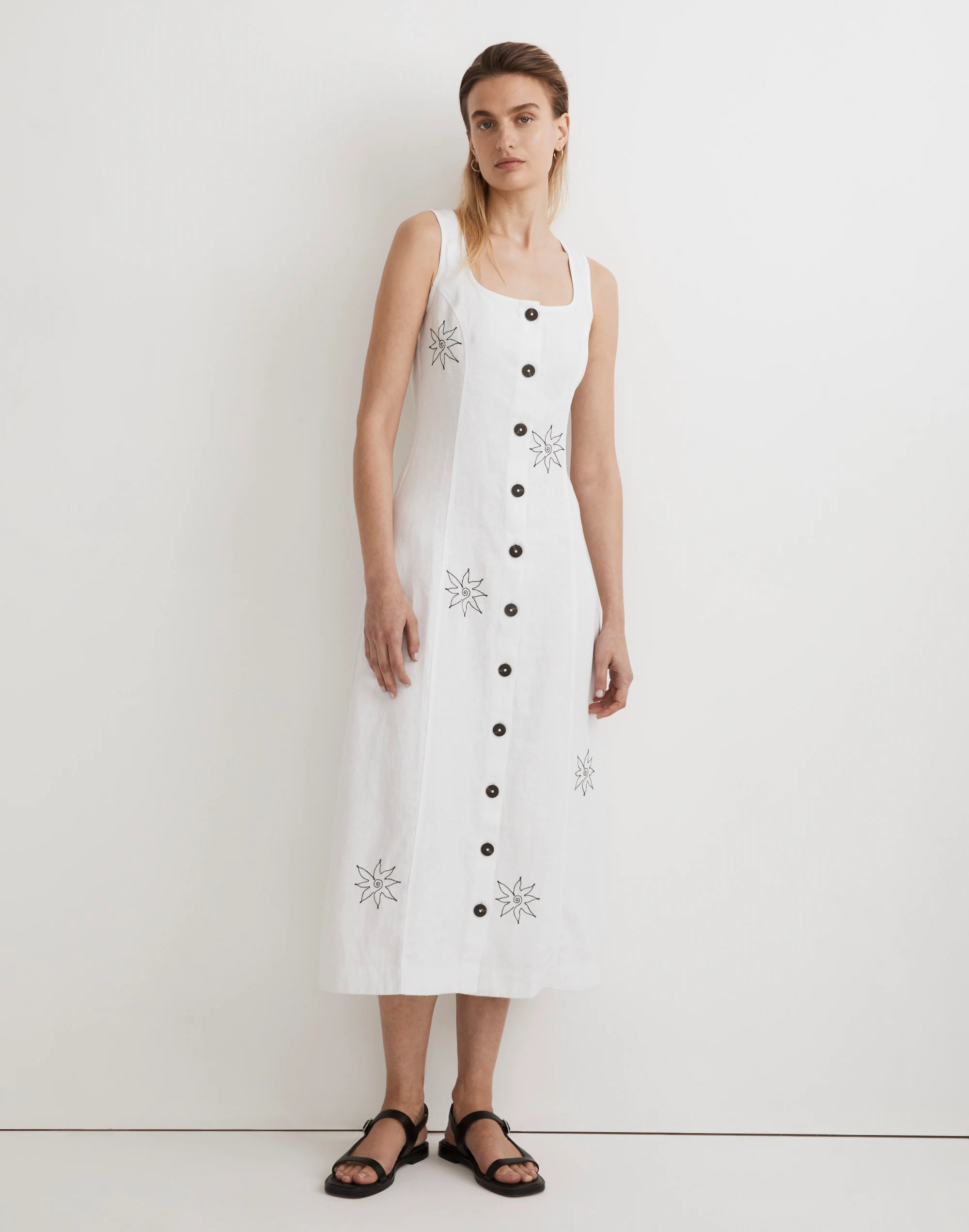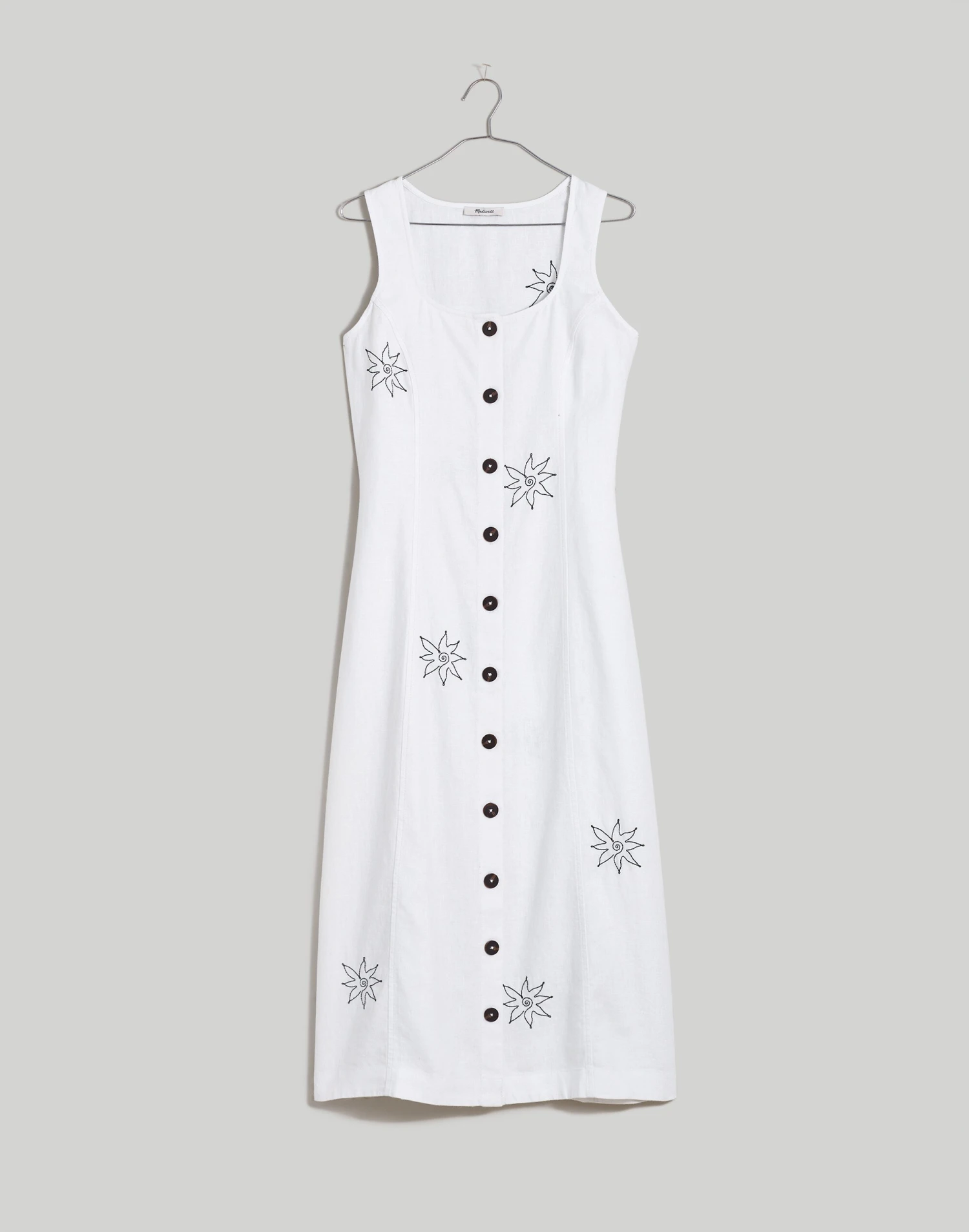 Embroidered with fun florals and flying friends, this 100 percent linen midi dress has a vintage-y squoval neckline and buttons running all down the front.