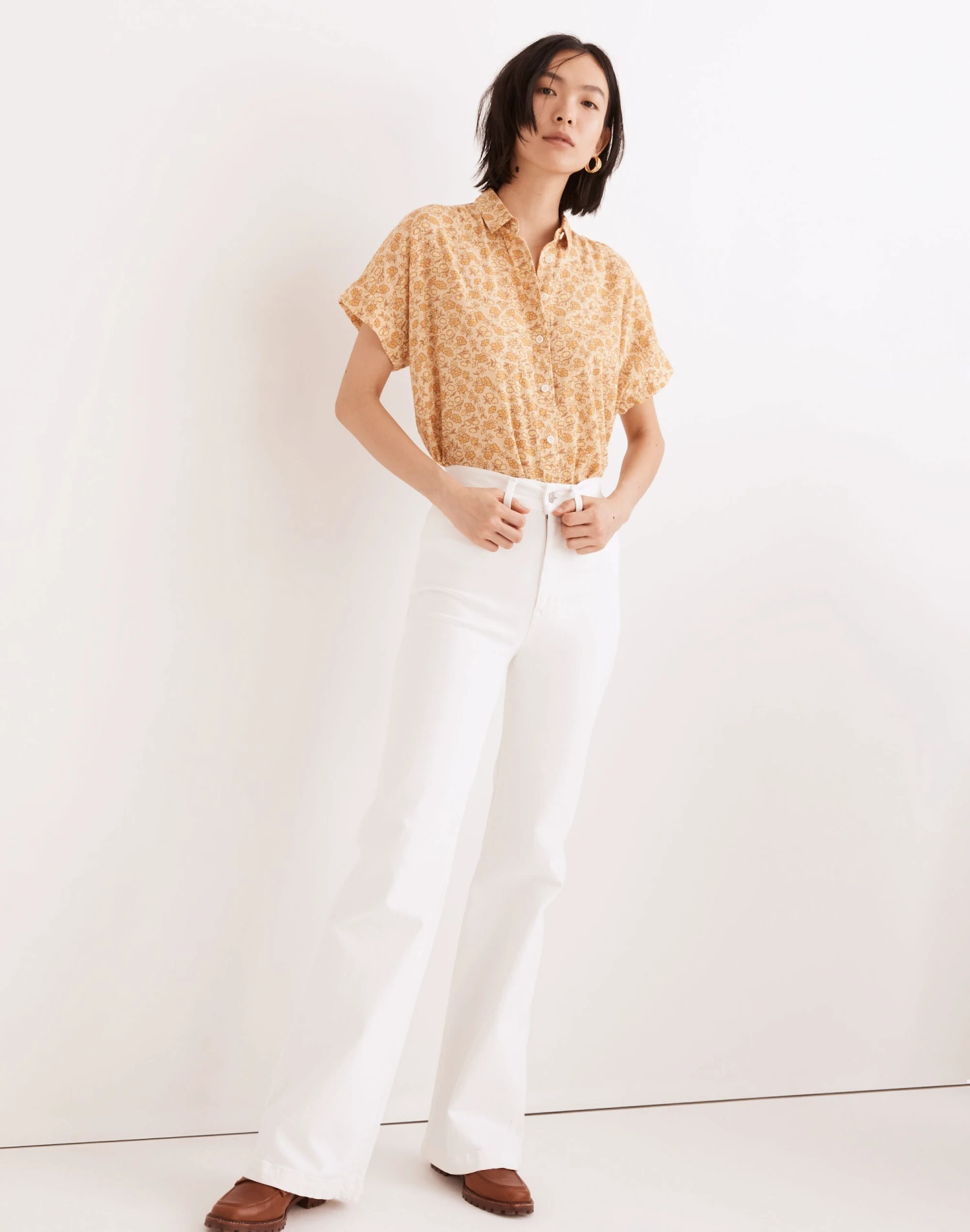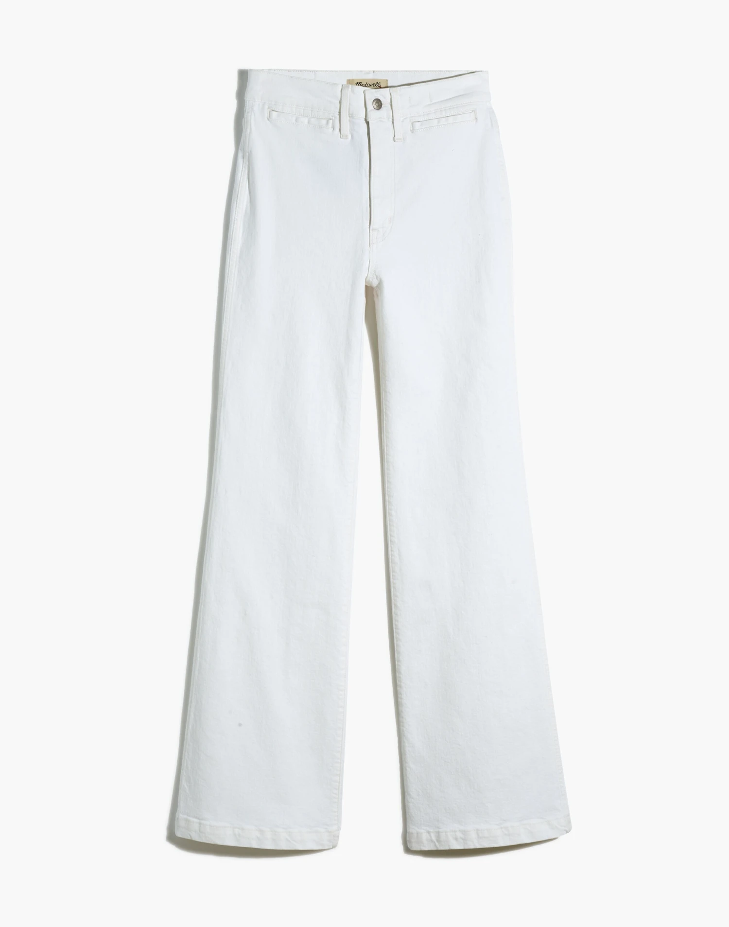 The cut: Complete with vintage-y (and office-friendly) welt pockets in front, these ’70s-inspired high-rise jeans have a slim fit through the hip and thigh before flaring at the knee. The fabric: Premium white denim with zero see-through and a touch of body-hugging stretch so it won’t bag out.