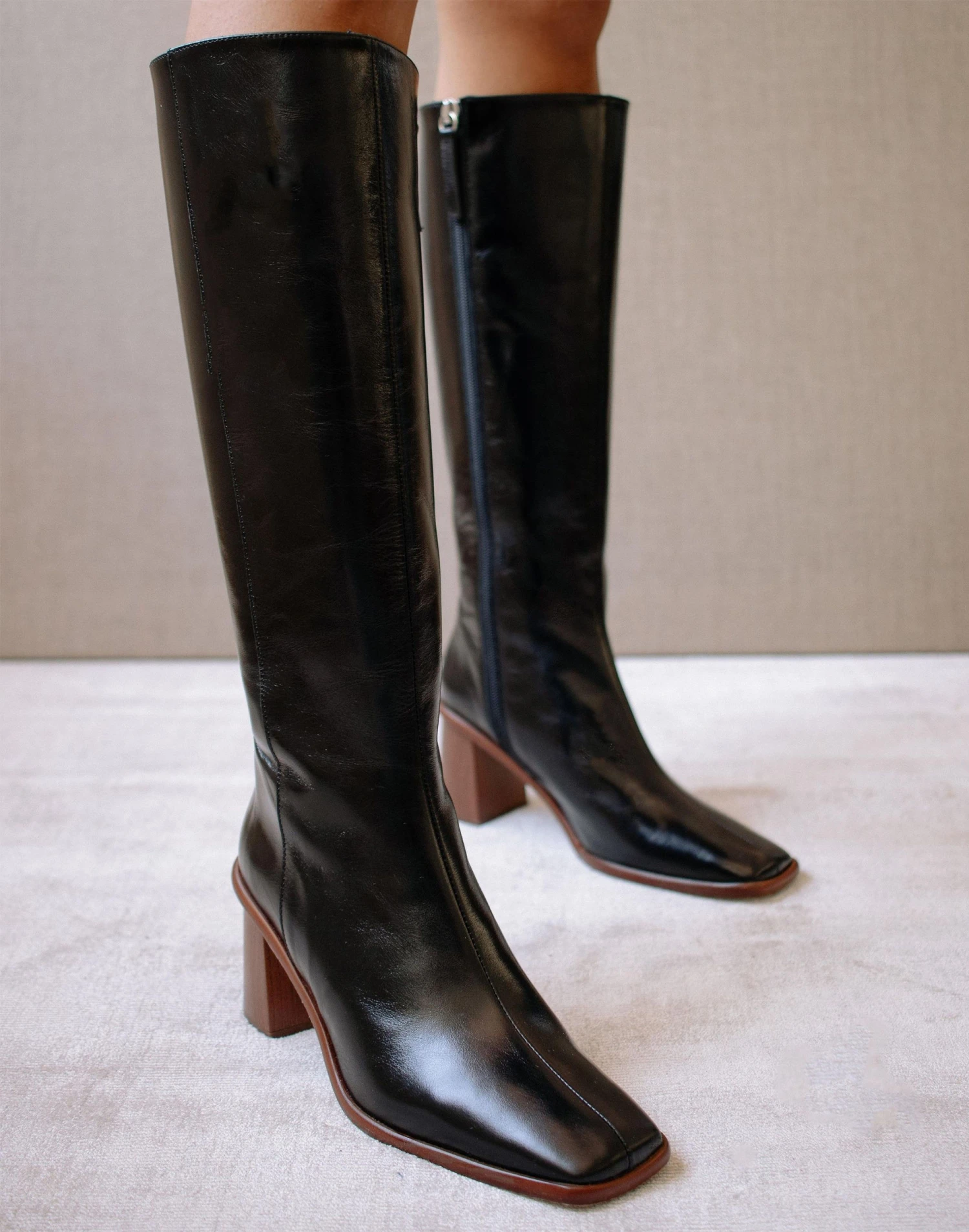 Based in Barcelona, this brand is all about sustainable footwear with a right-now look. Coming in real leather, these high boots have square toes and block heels.