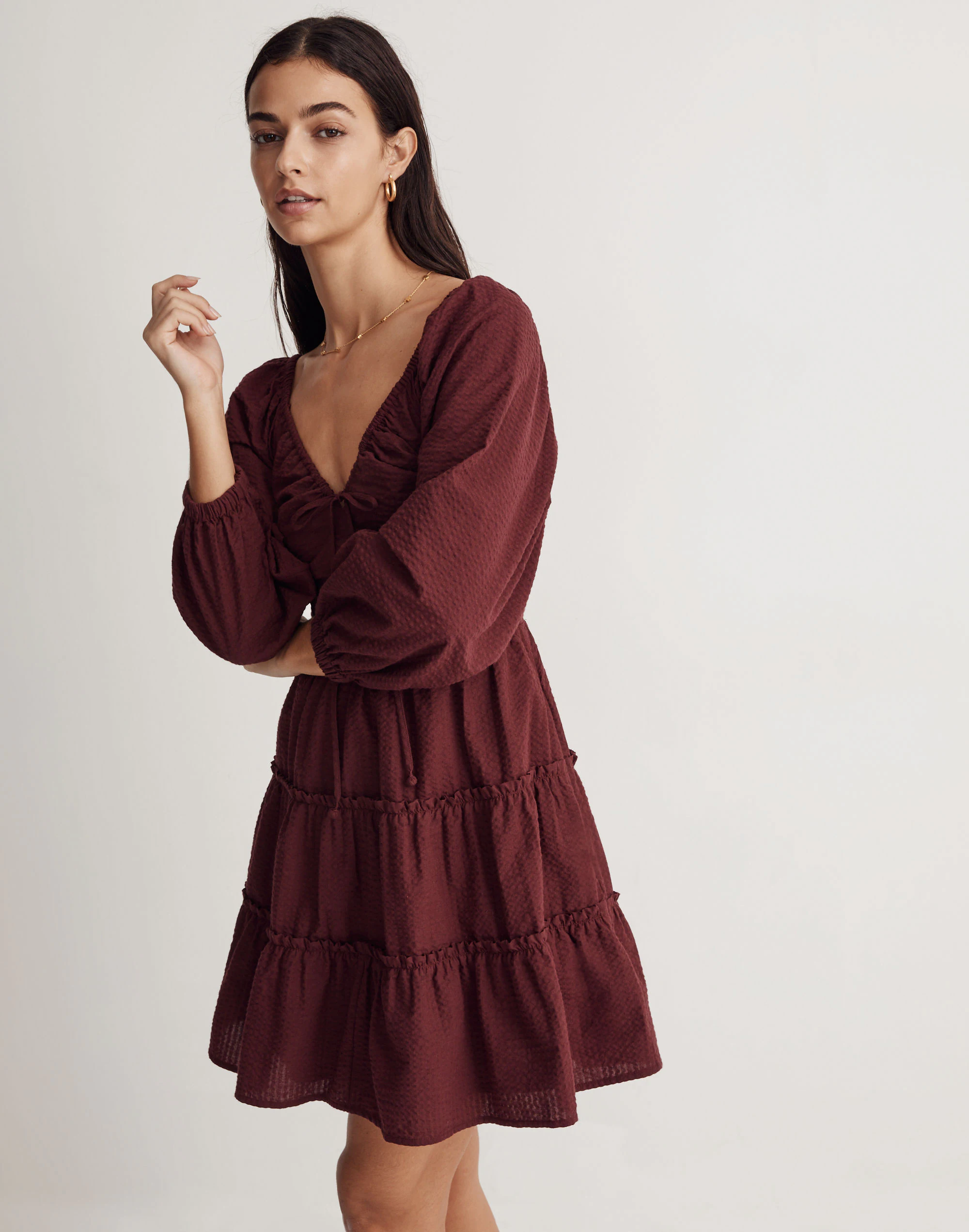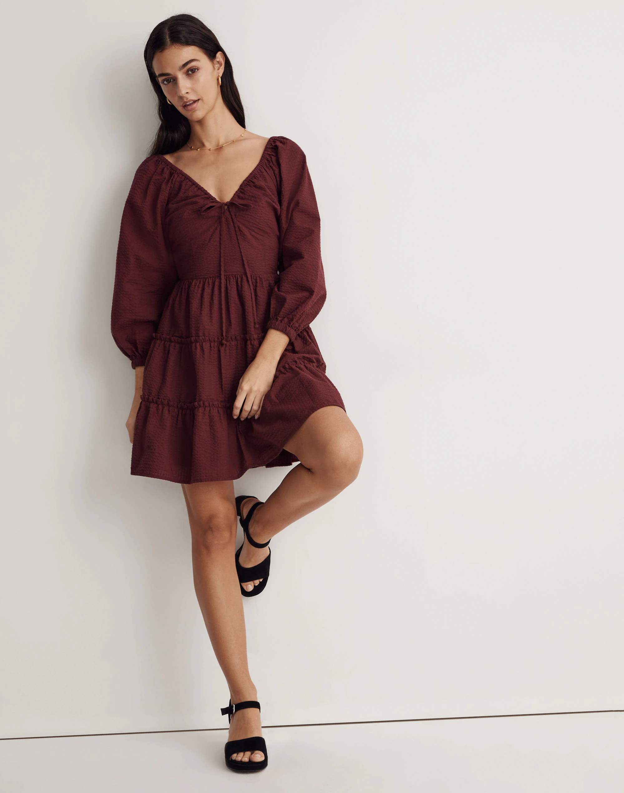 There’s lots of love for this pretty little mini dress at Madewell HQ. With a tie-front sweetheart neckline, fitted bodice and swingy tiers, it’s a sure-fire standout.