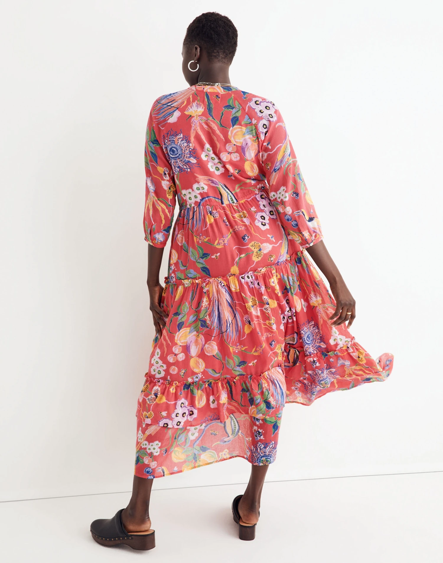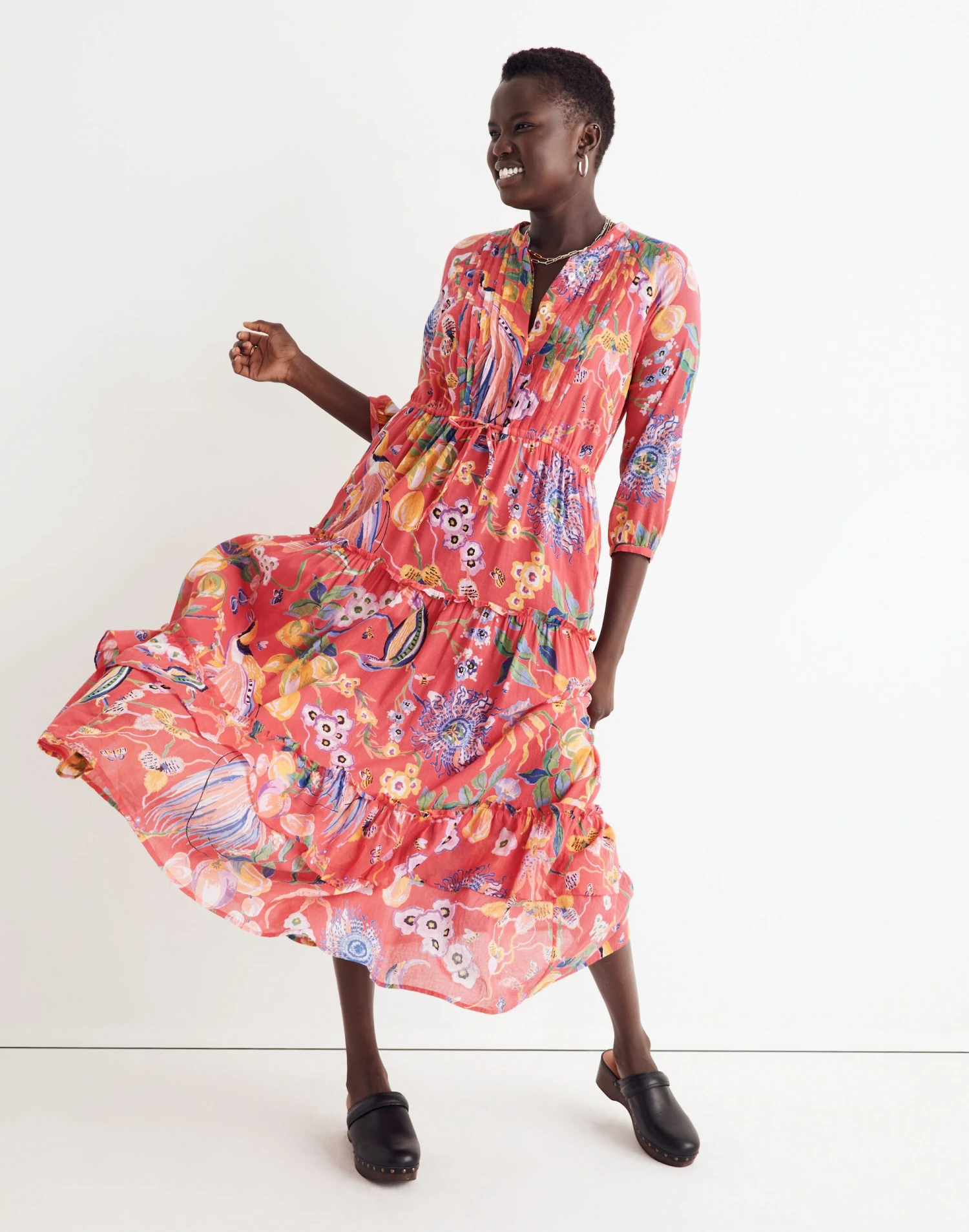 With a “joyous clothes, happy world” mantra, Jaipur-based Banjanan creates modern roam-the-world heirlooms that support the local textile community (fun fact: the brand’s name is a take on the Hindi word for wanderer). Made of light-as-air cotton voile, this easy, breezy button-front maxi dress has three-quarter sleeves and a tie at the waist.