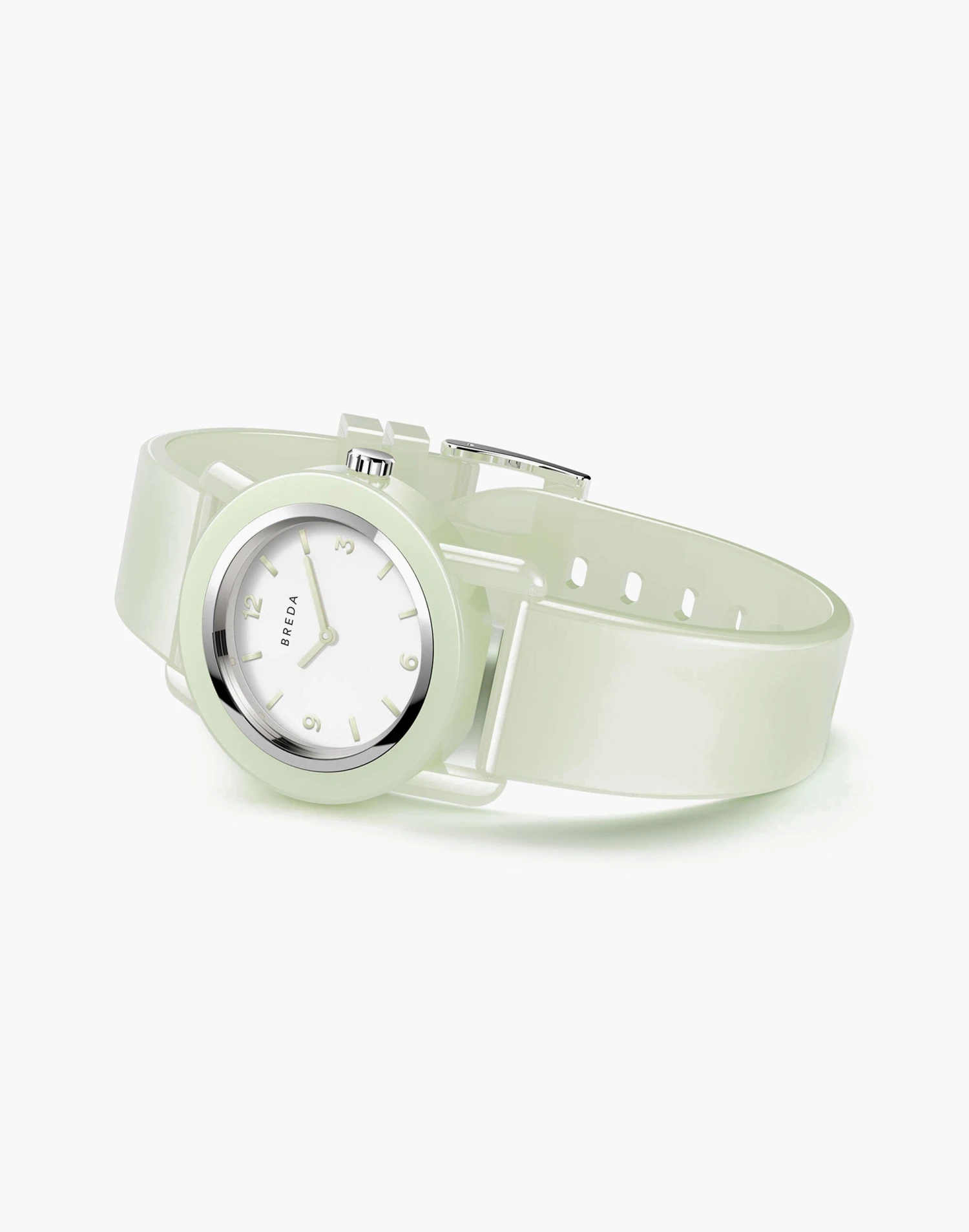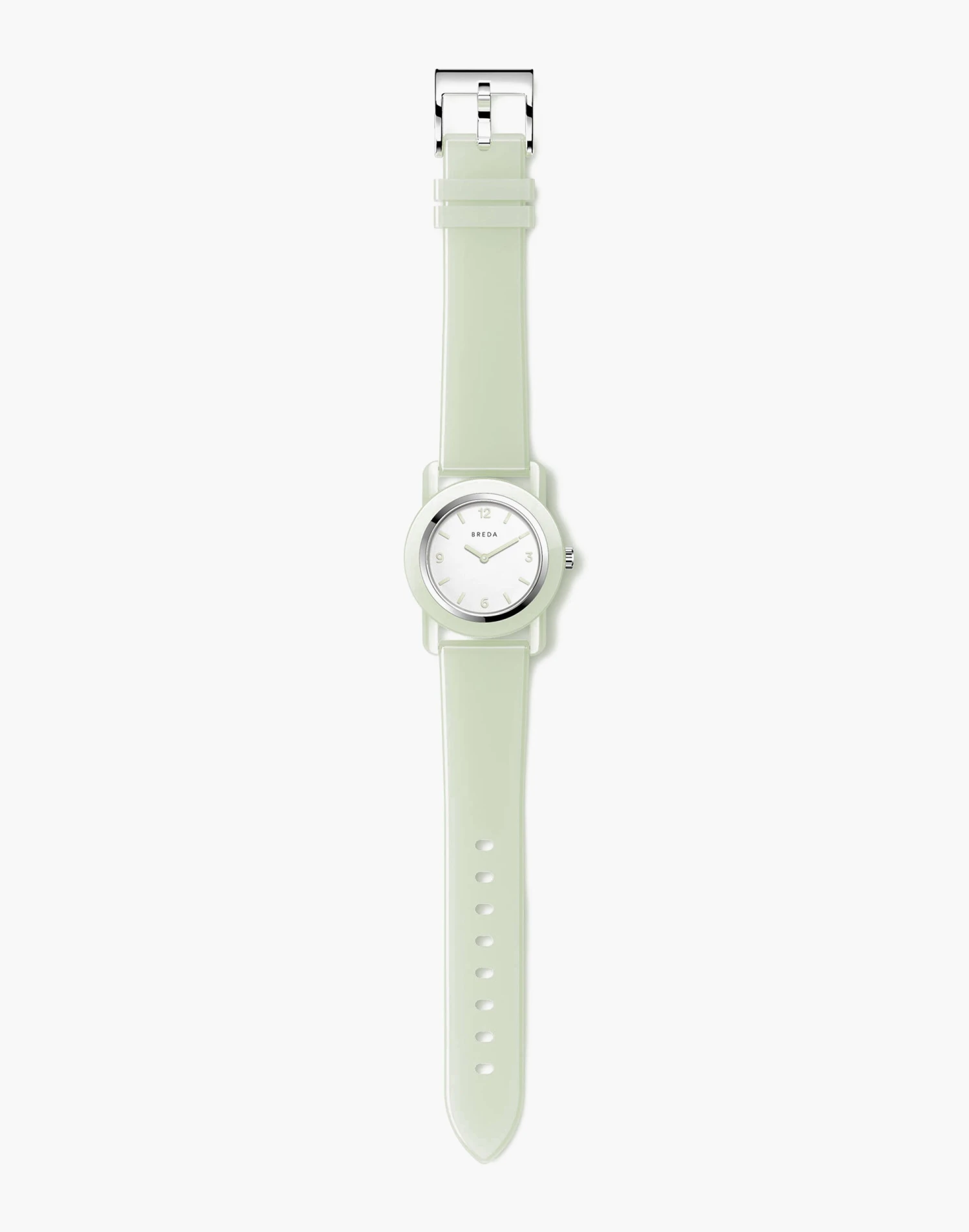 - Recycled thermoplastic polyurethane band with silver buckle closure.