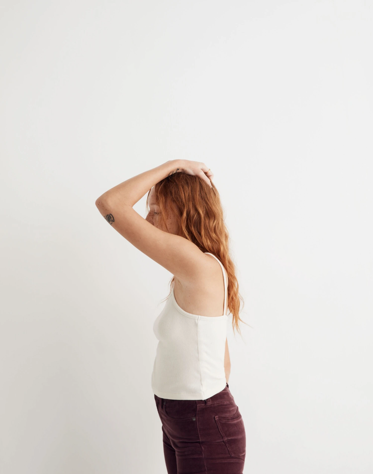 Cropped and fitted, this ribbed square-neck tank top is made of brushed organic cotton with a sweater-y feel. Try it with the matching cardigan for a modern take on a twinset.