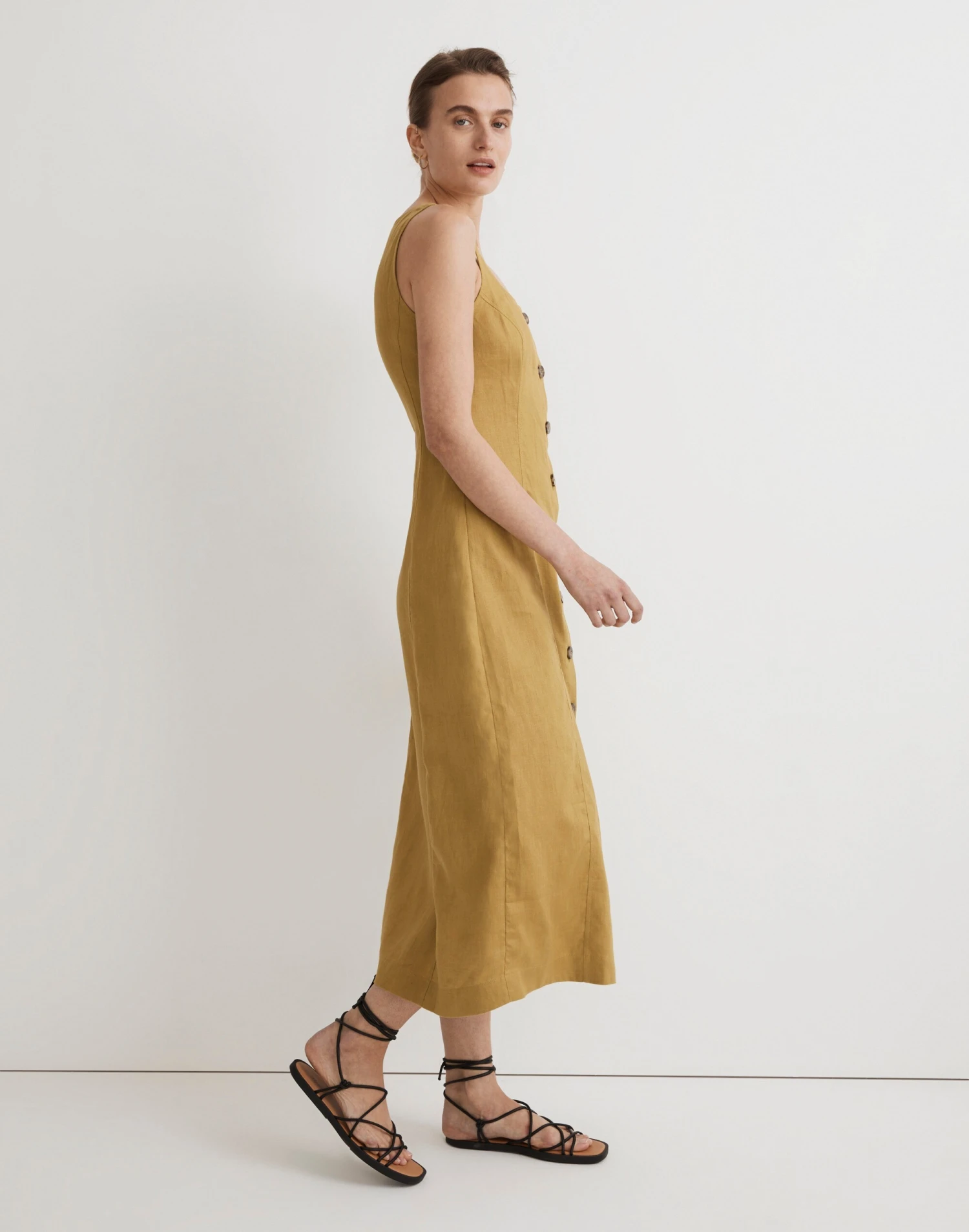 Coming in 100 percent linen, this throw-on-and-go midi dress has a vintage-y squoval neckline and buttons running all down the front.
