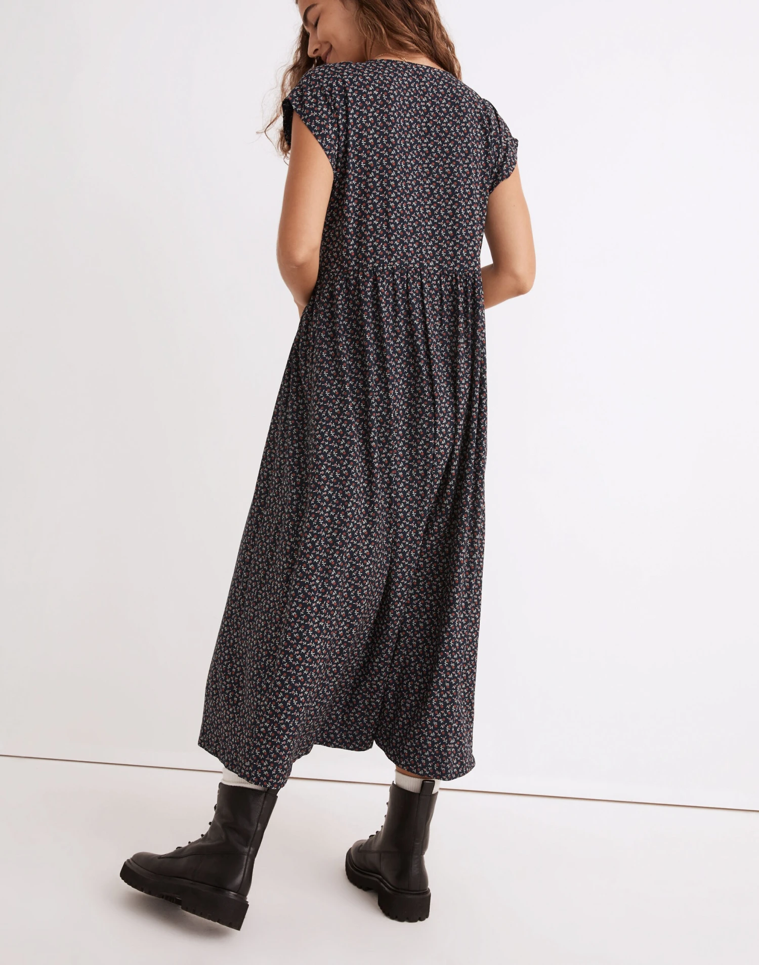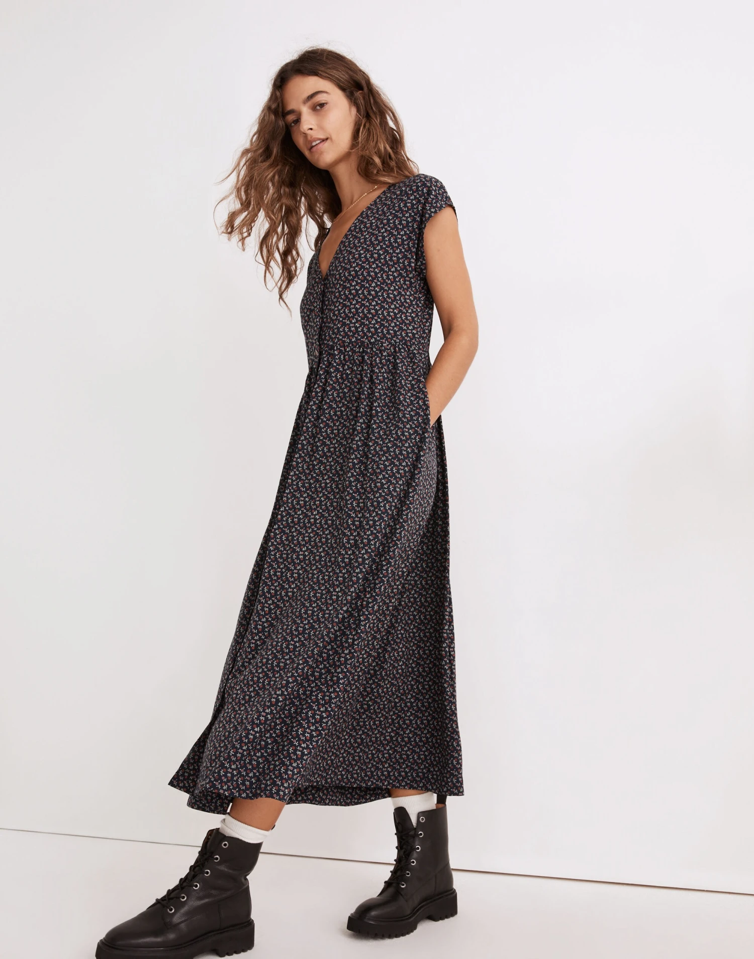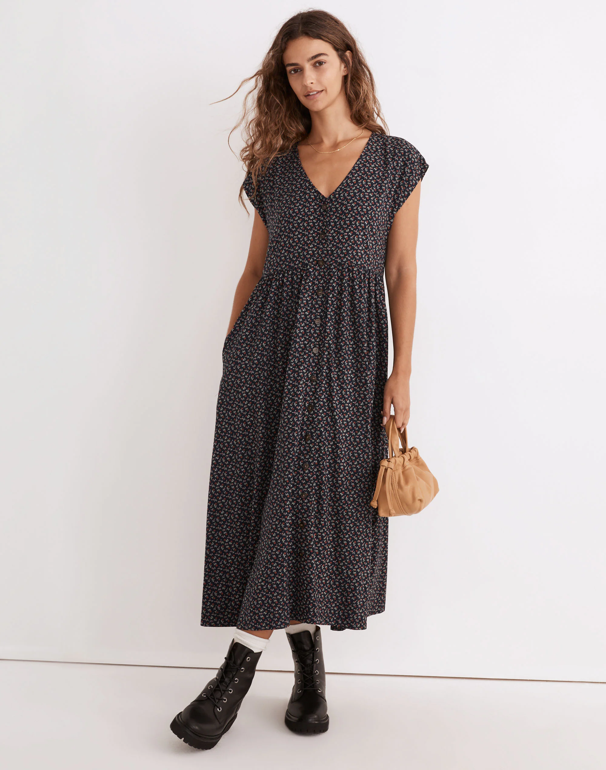 Made of supersoft (and sustainable) challis fabric in a tiny daisy print, this V-neck midi dress has short cap sleeves and buttons all down the front. Comfy and loose, it has a laid-back feel and a put-together look.