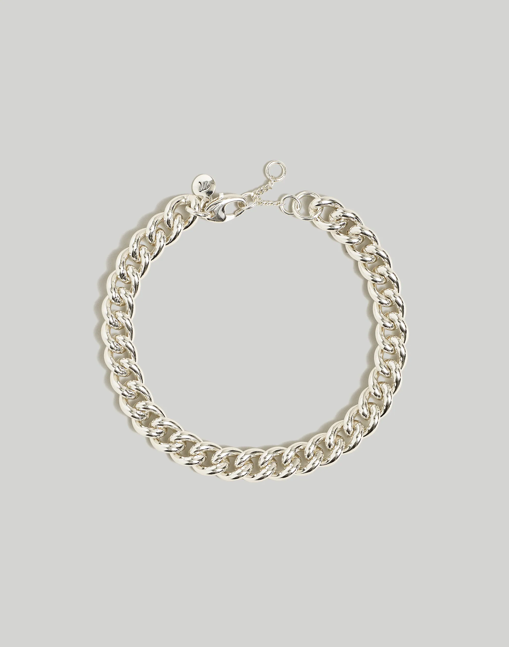 Chain-linked and chunky, this shiny, silver-plated bracelet is a bold, edgy addition to any arm stack.