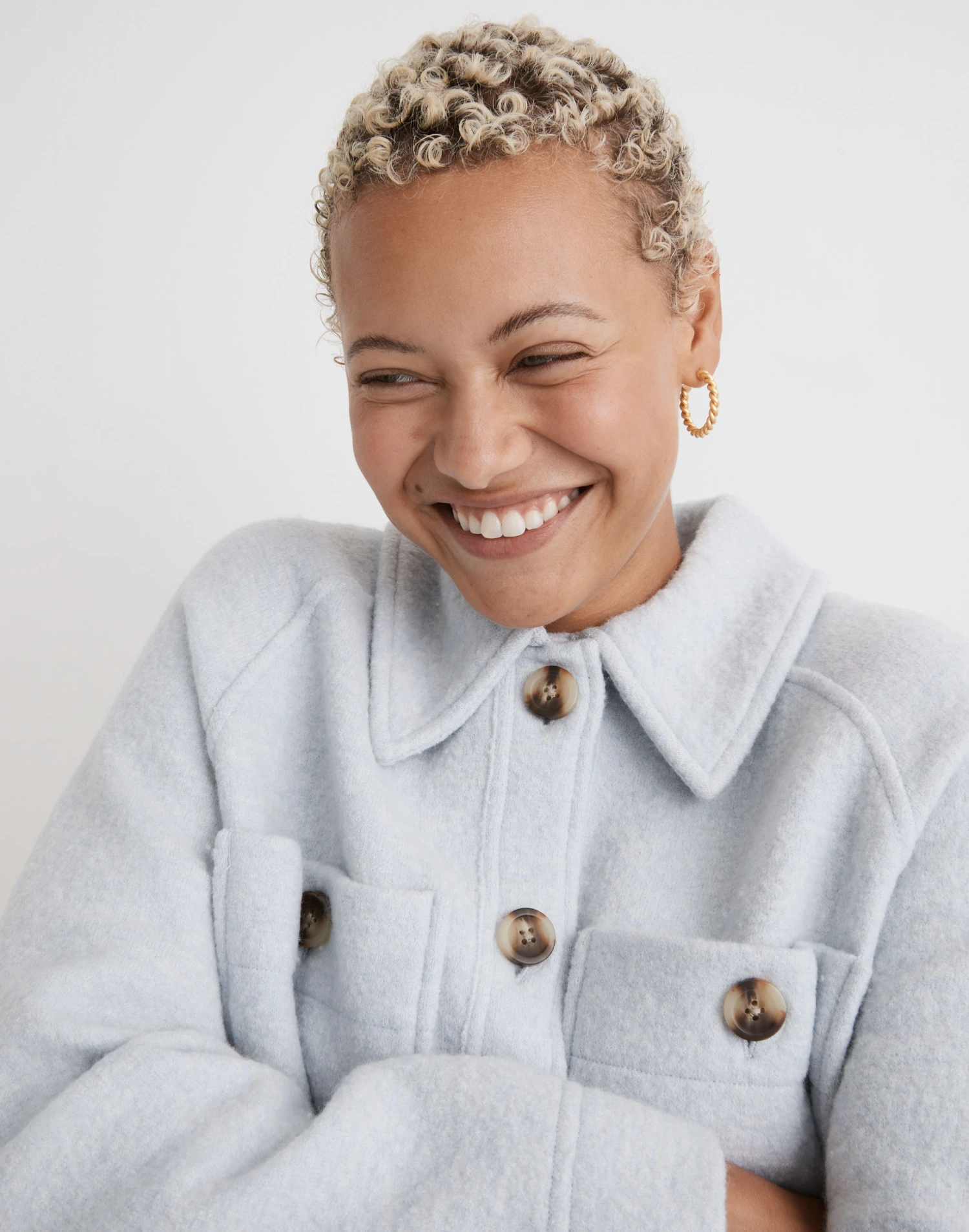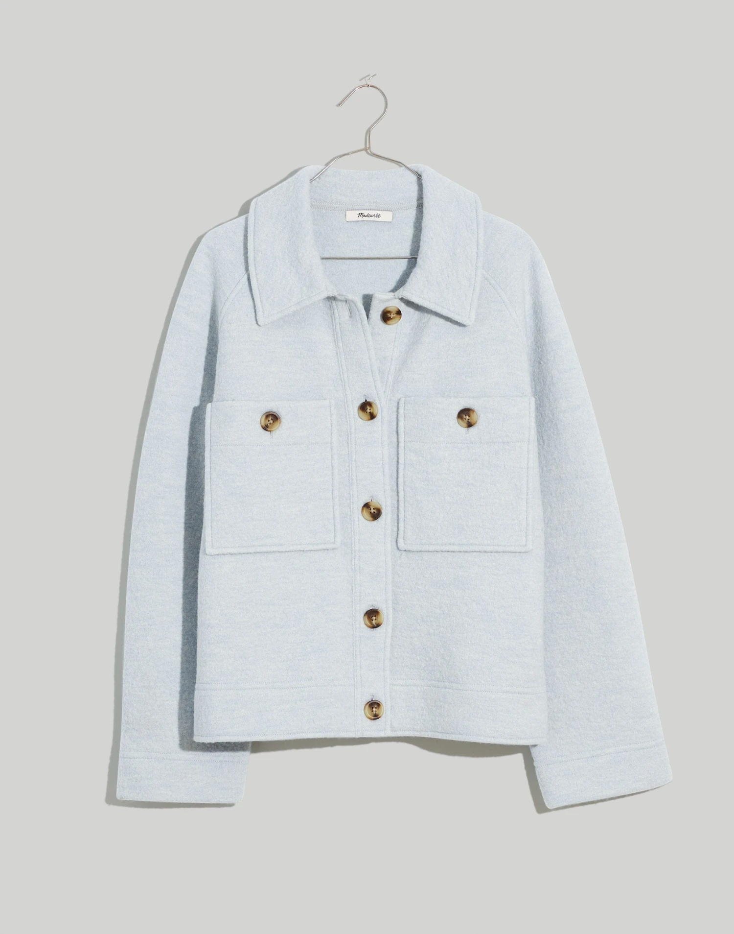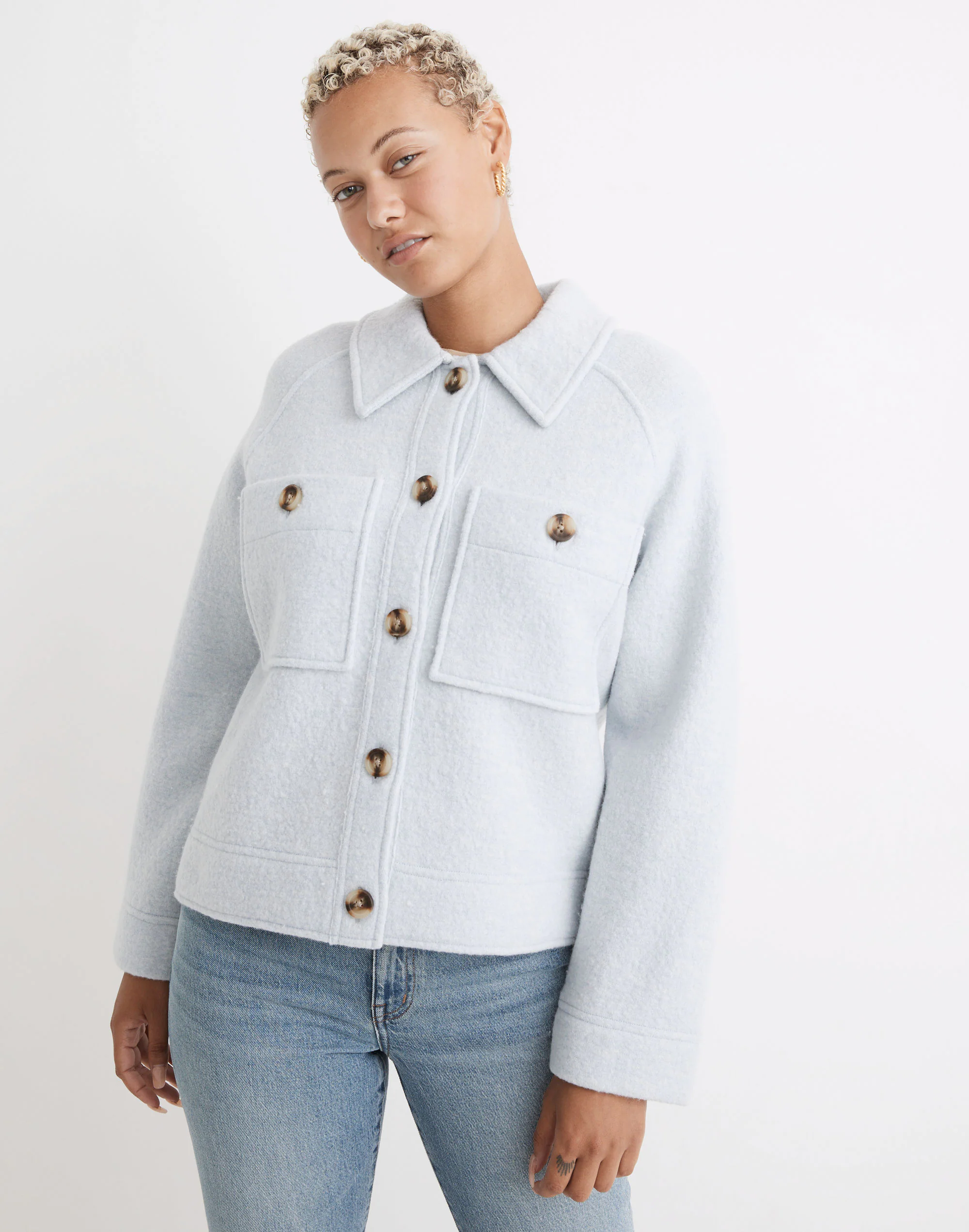 Crafted from a classic boiled wool, this is the boxy shirt-jacket your wardrobe needs. In a cropped fit made perfect for layering, it has patch pockets and wide bracelet-length sleeves.