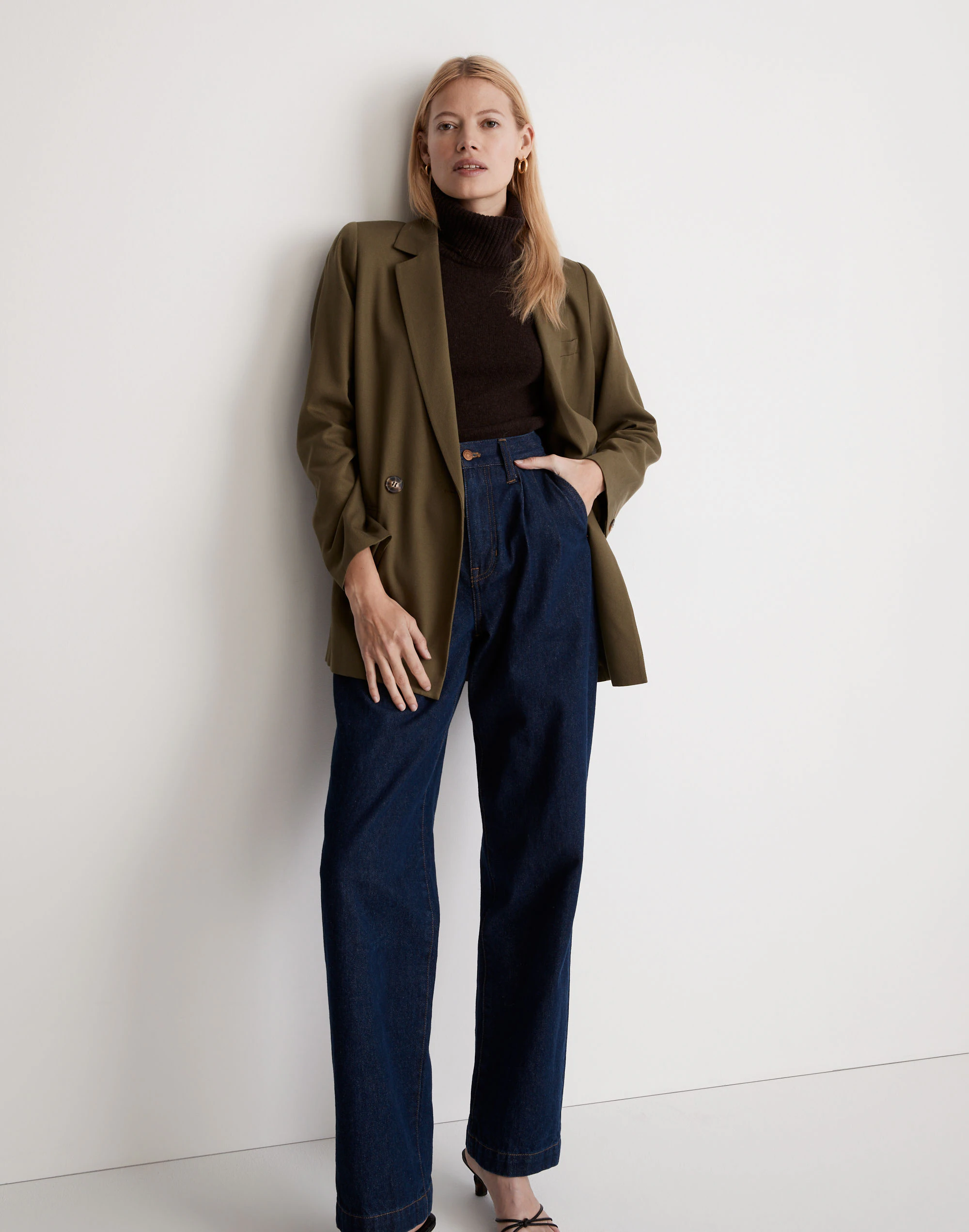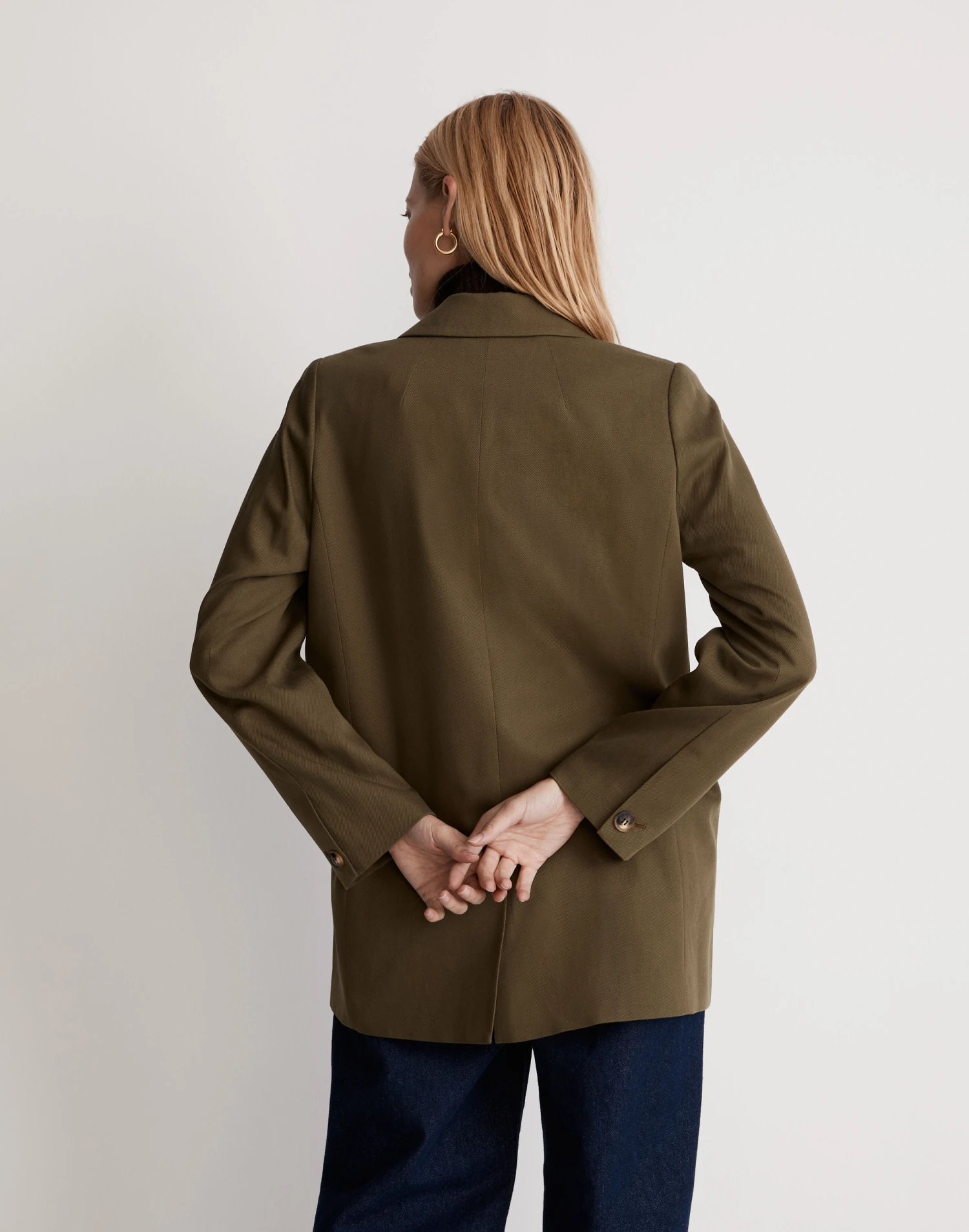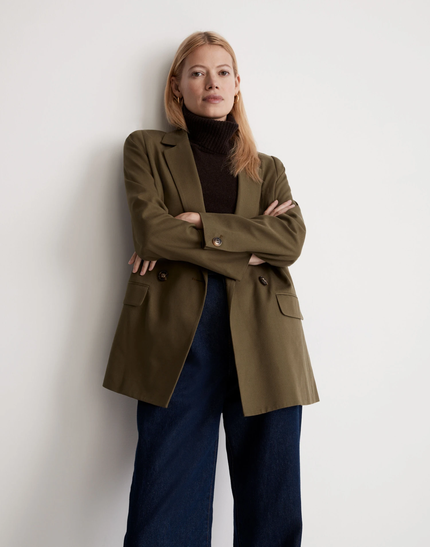 A fresh take on a best seller, this double-breasted blazer is slouchy, oversized and the perfect longer-than-average length. Made of Drapeweave TENCEL™ lyocell-blend twill, it’s the quickest way to a dressier, pulled-together look—particularly with the matching pants.