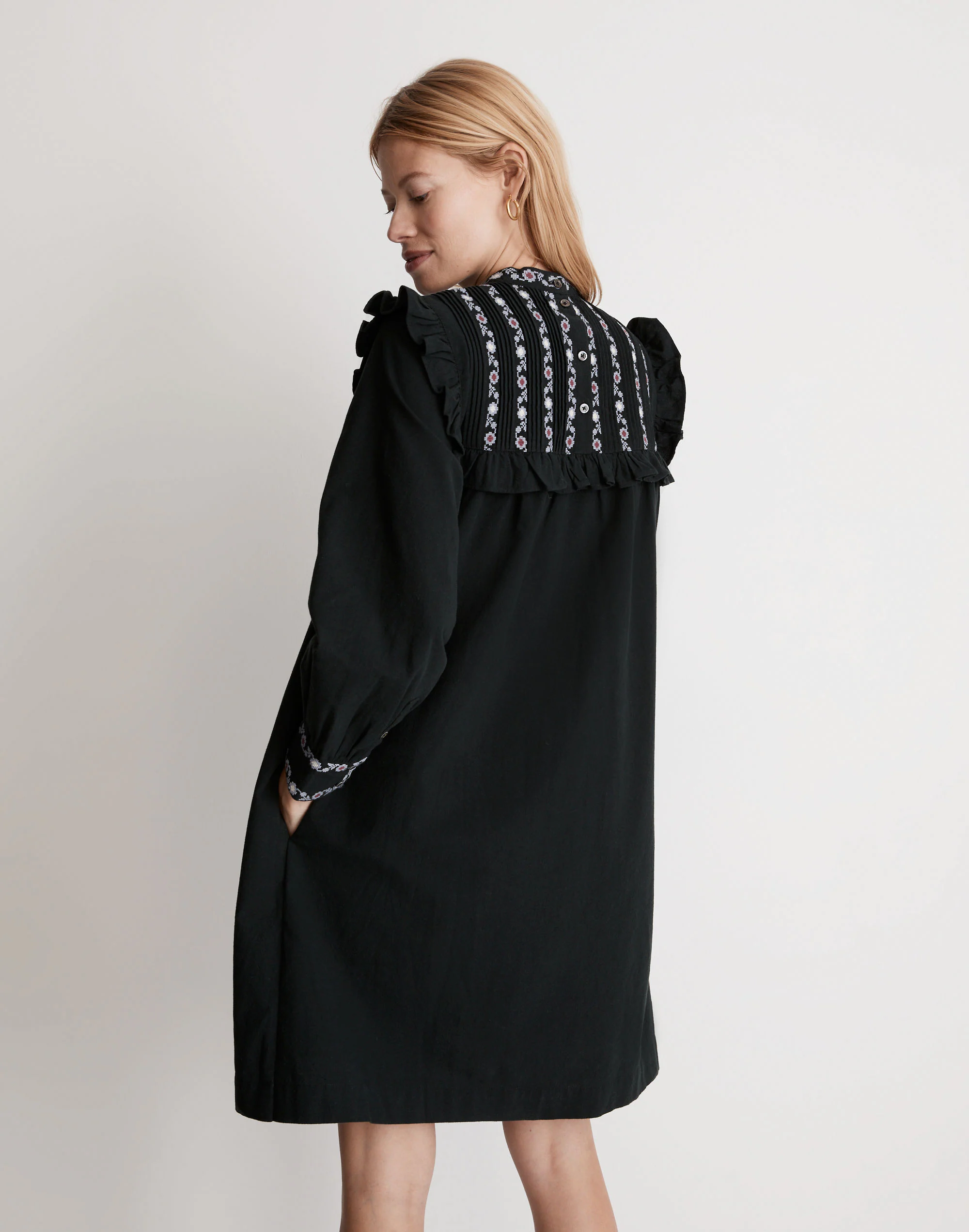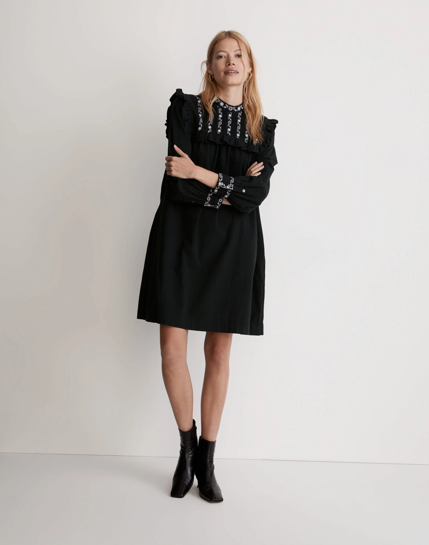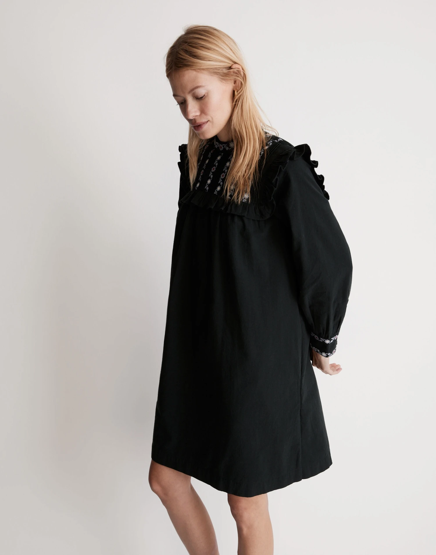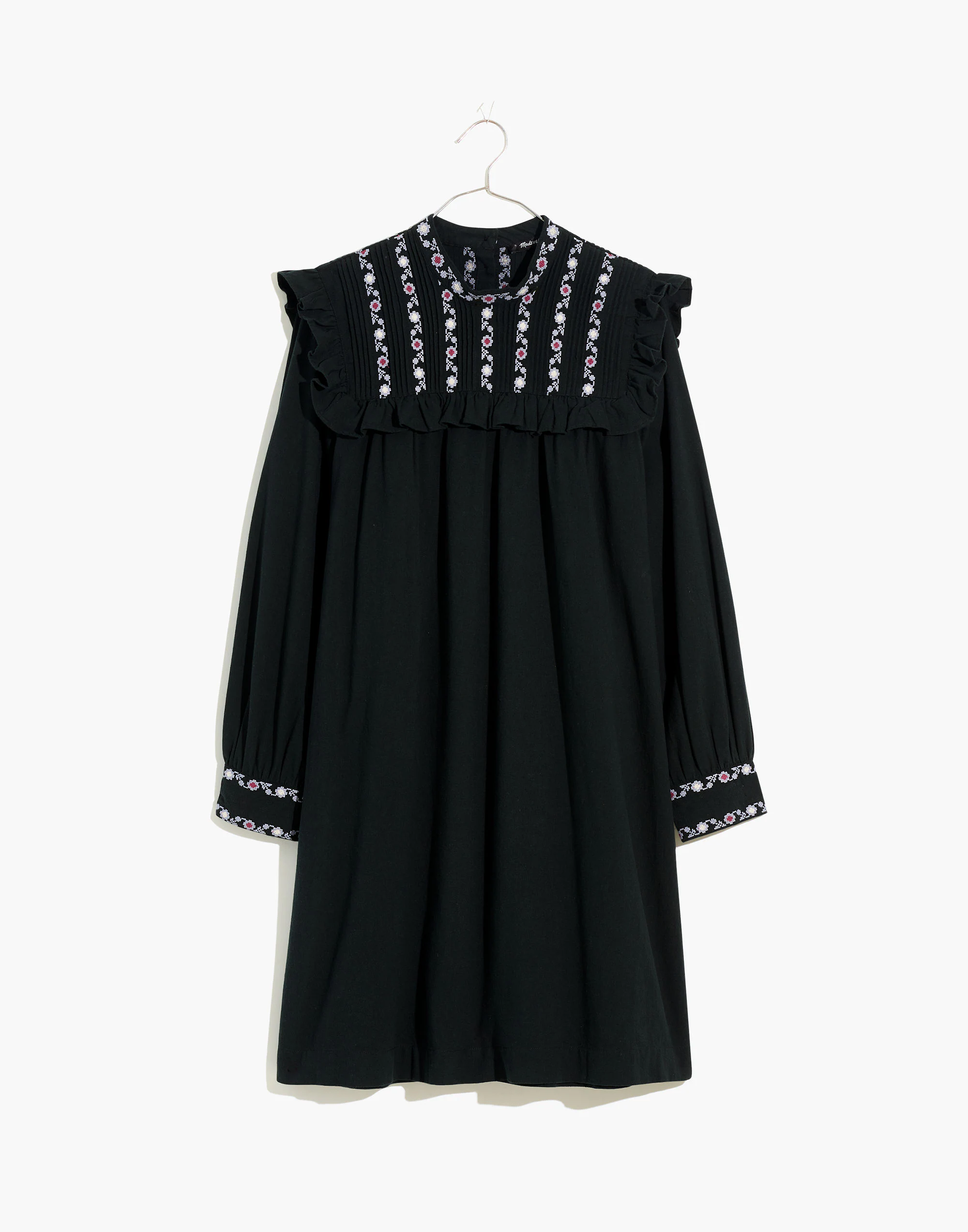 Crafted from heavyweight cotton crepe, this mini dress has a pretty pintucked bib lined with romantic ruffles. With embroidered details along the neckline and sleeve cuffs, it’s giving cottage chic.