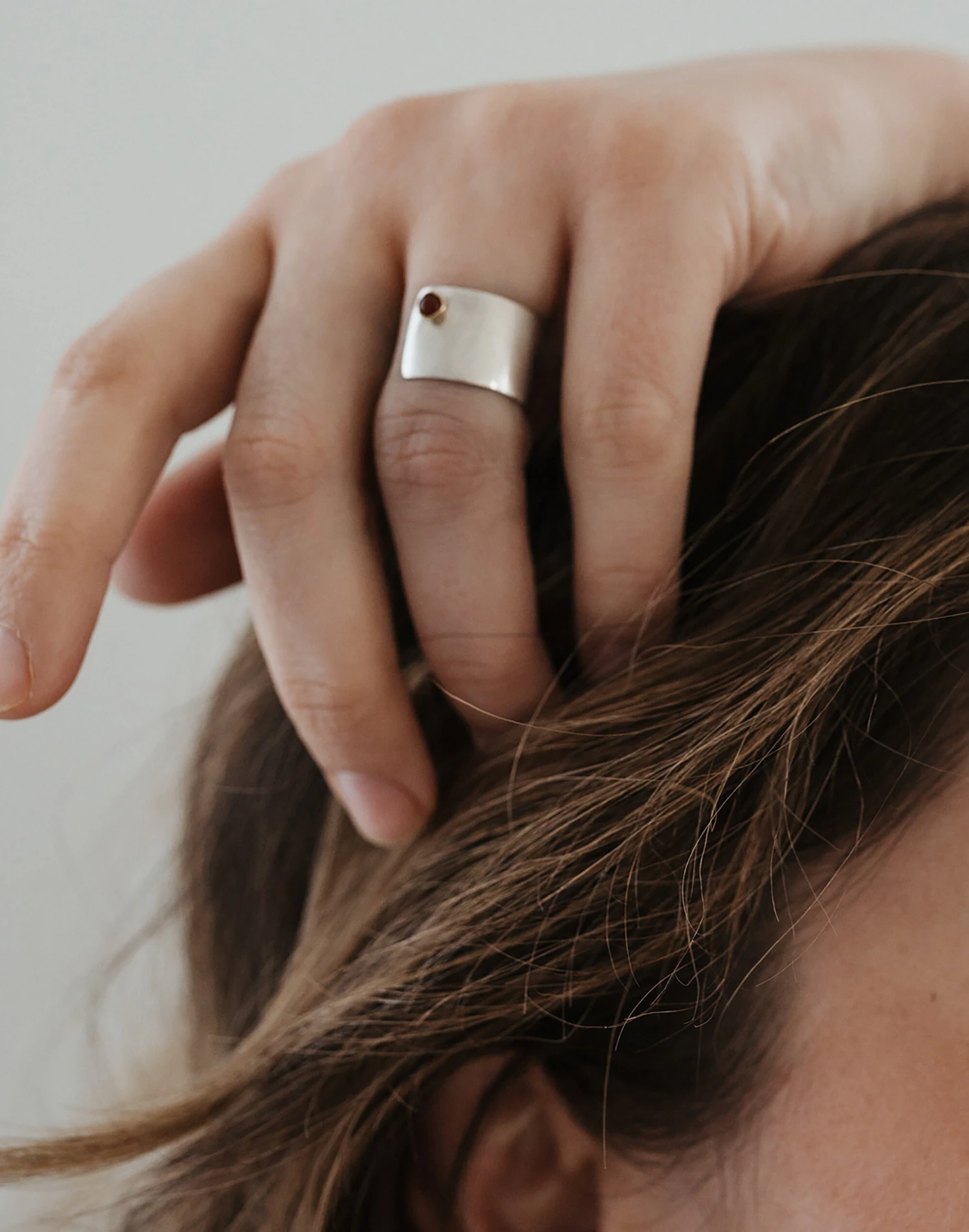 For our Hometown Heroes Collective, we team up with Nest to celebrate makers nationwide with all kinds of business-boosting support. Part of the class of 2023, Shana Bentley creates unique jewelry to brighten up your daily look. Inset with a touch of carnelian, this chunky silver band is a modern classic.