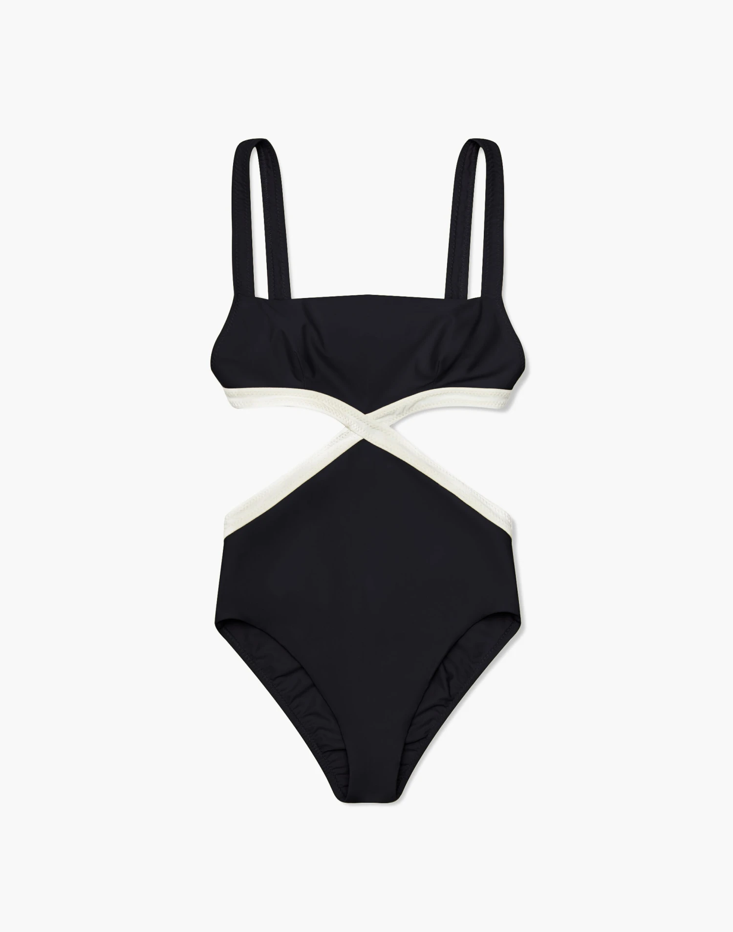 Modern and Mother Earth-friendly, GALAMAAR swimwear is produced in Los Angeles using sustainable nylon made from discarded fishing nets. Cool in colorblock, this flattering one-piece has sexy cutout sides for a bikini vibe.