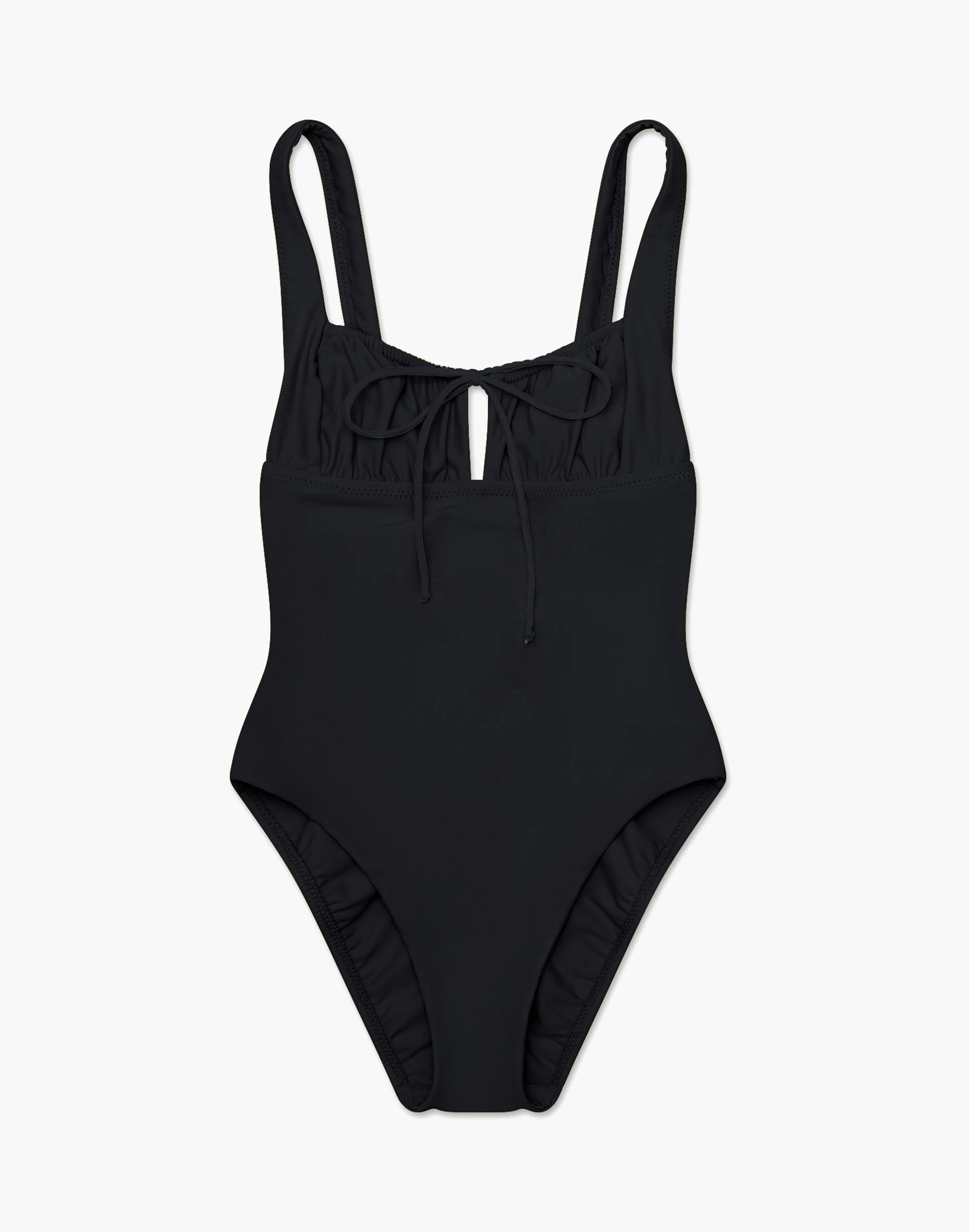 Modern and Mother Earth-friendly, GALAMAAR swimwear is produced in Los Angeles using sustainable nylon made from discarded fishing nets. Inspired by vintage lingerie but made to show off, this one-piece has a romantic ruched bust with an adjustable tie front for the perfect fit.