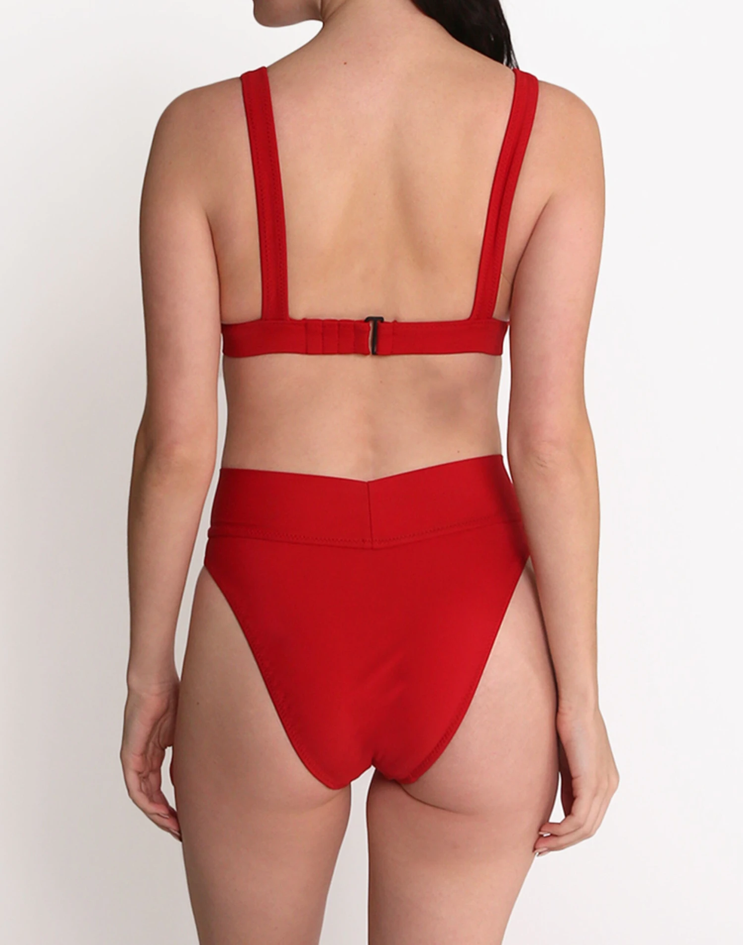 Modern and Mother Earth-friendly, GALAMAAR swimwear is produced in Los Angeles using sustainable nylon made from discarded fishing nets. With its to-the-belly-button wide waistband, this bikini bottom is cut high on the legs for a ’90s feel.
