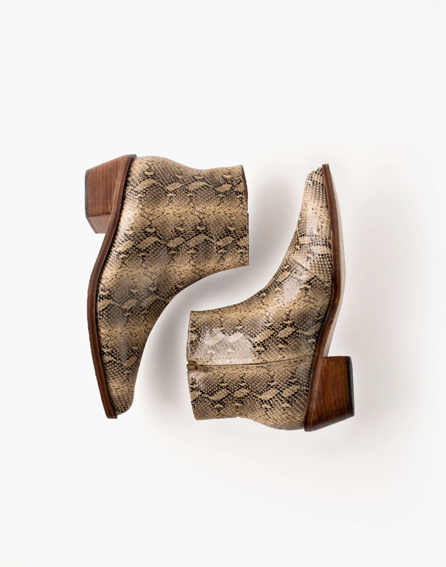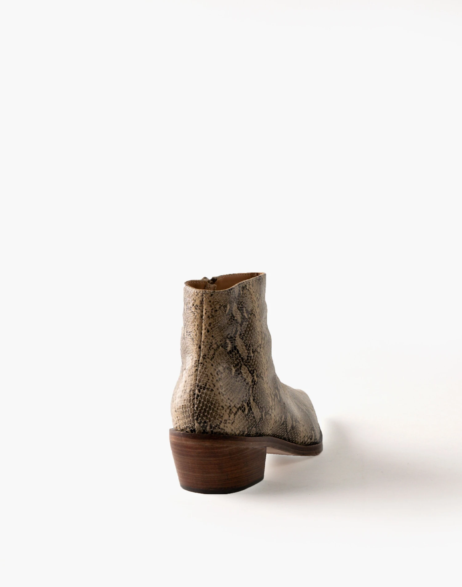 Handcrafted in Peru using ethical manufacturing, this woman-owned footwear line is designed by third-generation shoemaker Adriana Crocco. Cut from snake-patterned leather, these ankle boots are a low-key take on a western boot with pointed toes and low heels.