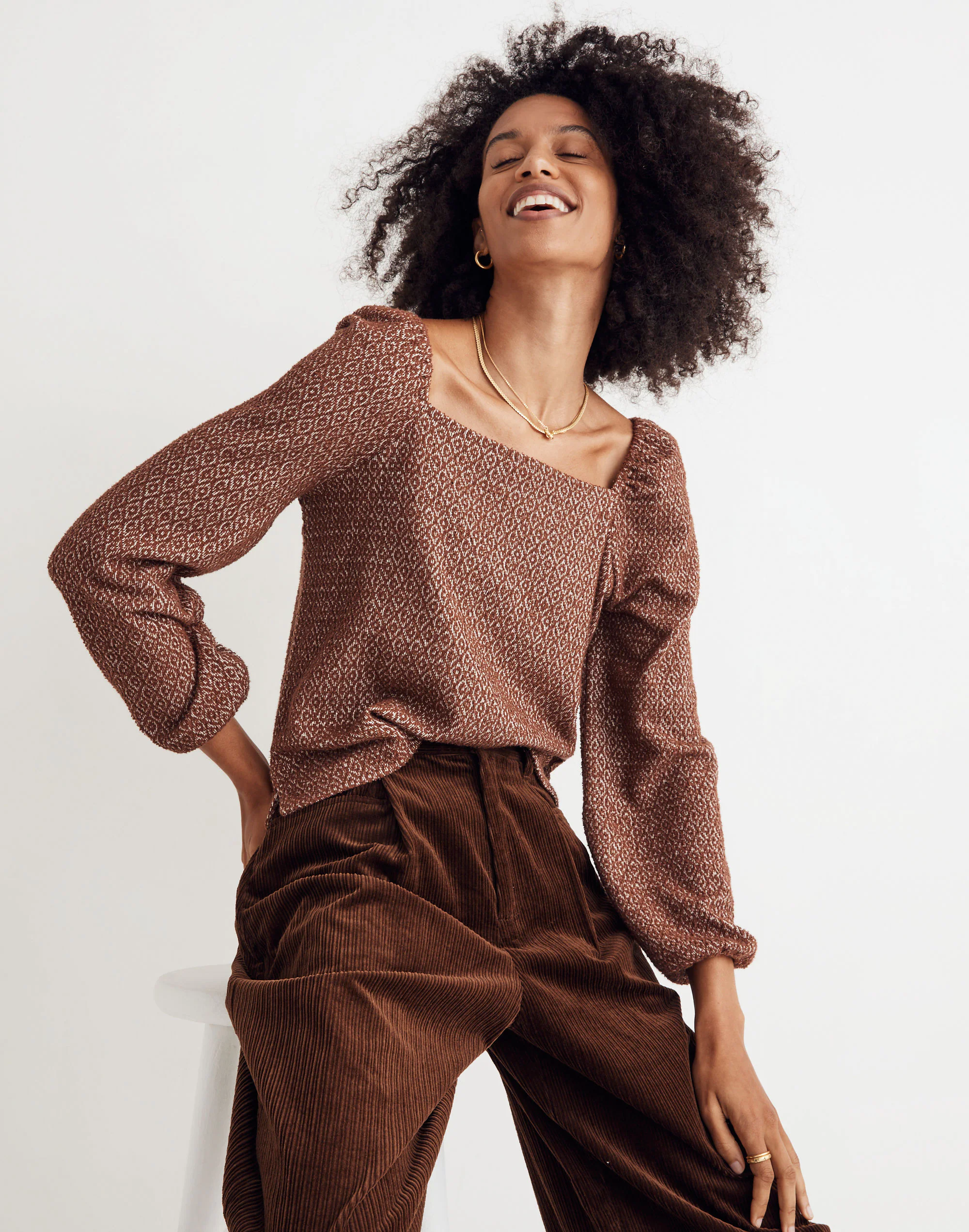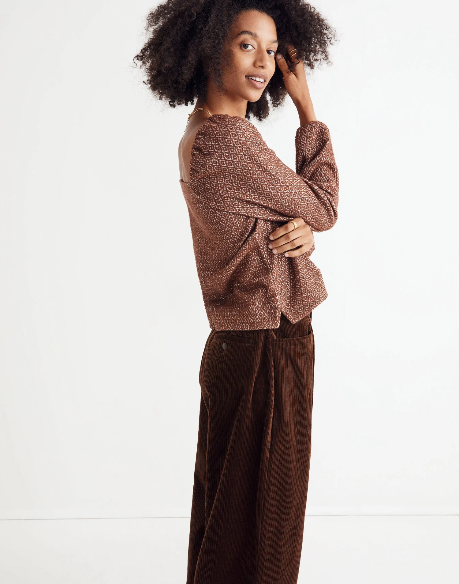 Made of textural jacquard, this best-selling cropped top has a romantic scoop neckline and pretty pleated sleeves.
