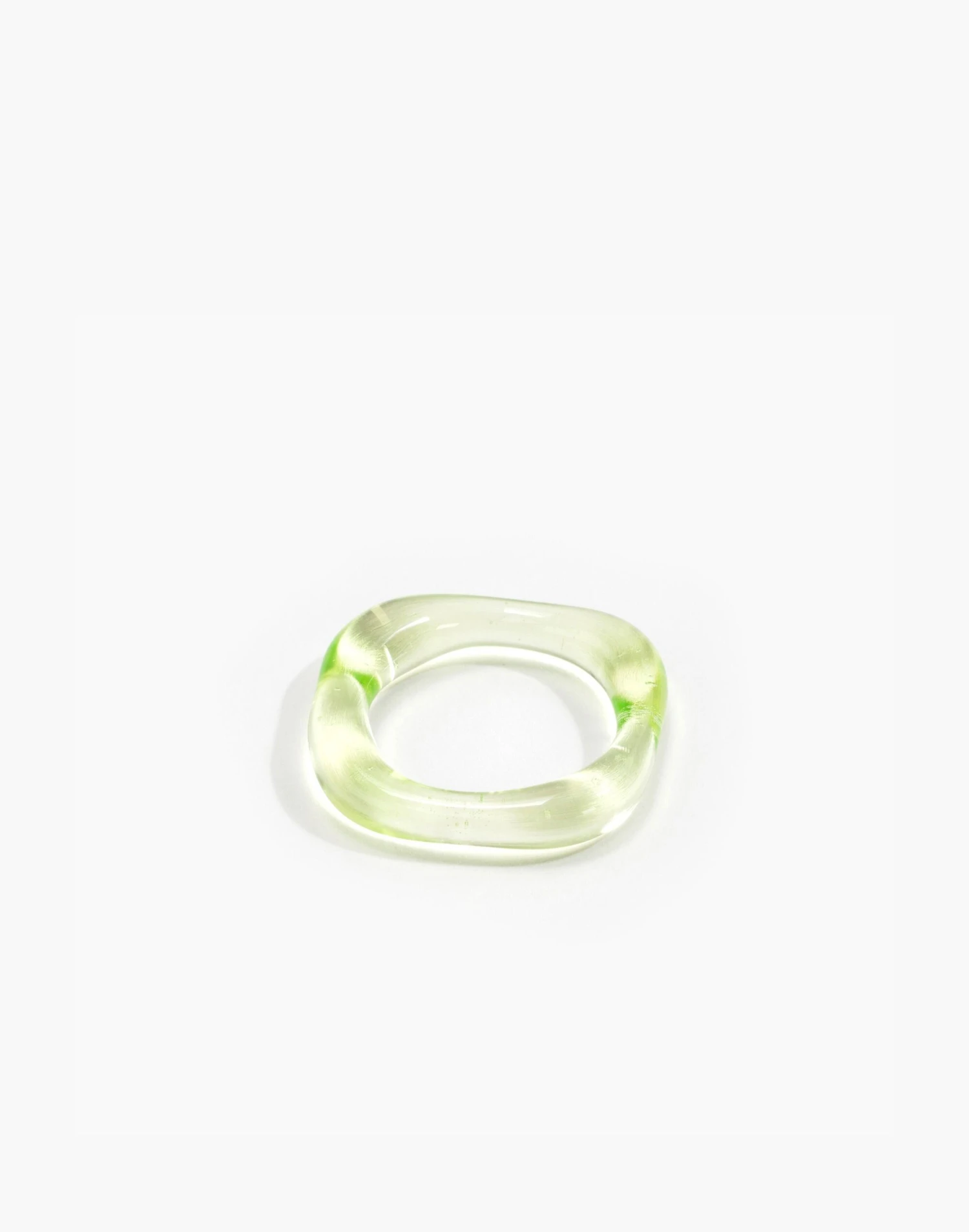 Airy and durable, this lime glass organic band has variation in thickness throughout and can be worn on its own or stacked. Unique, and comfortable to wear daily or for a special occasion. Brooklyn-based artist Jane D’Arensbourg hand-sculpts glass into light-catching jewelry (aka she’s very handy with a torch) Organic lime green glass band with variation in thickness throughout. Â