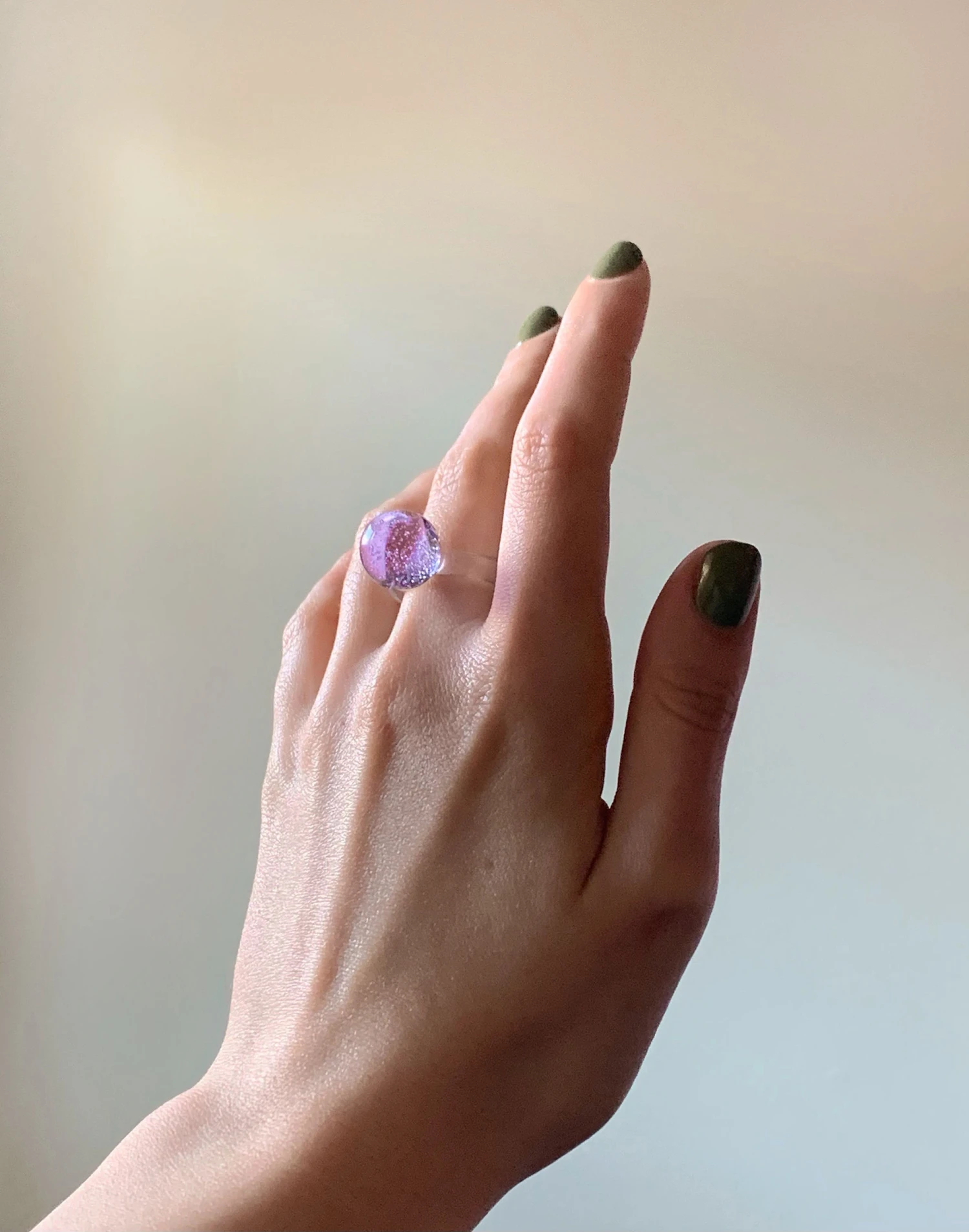 Airy and durable, this large lilac glass orb is like a crystal ball on your finger. Unique, and comfortable to wear daily or for a special occasion. Brooklyn-based artist Jane D’Arensbourg hand-sculpts glass into light-catching jewelry (aka she’s very handy with a torch) Lilac large glass orb, fused to clear glass band.
