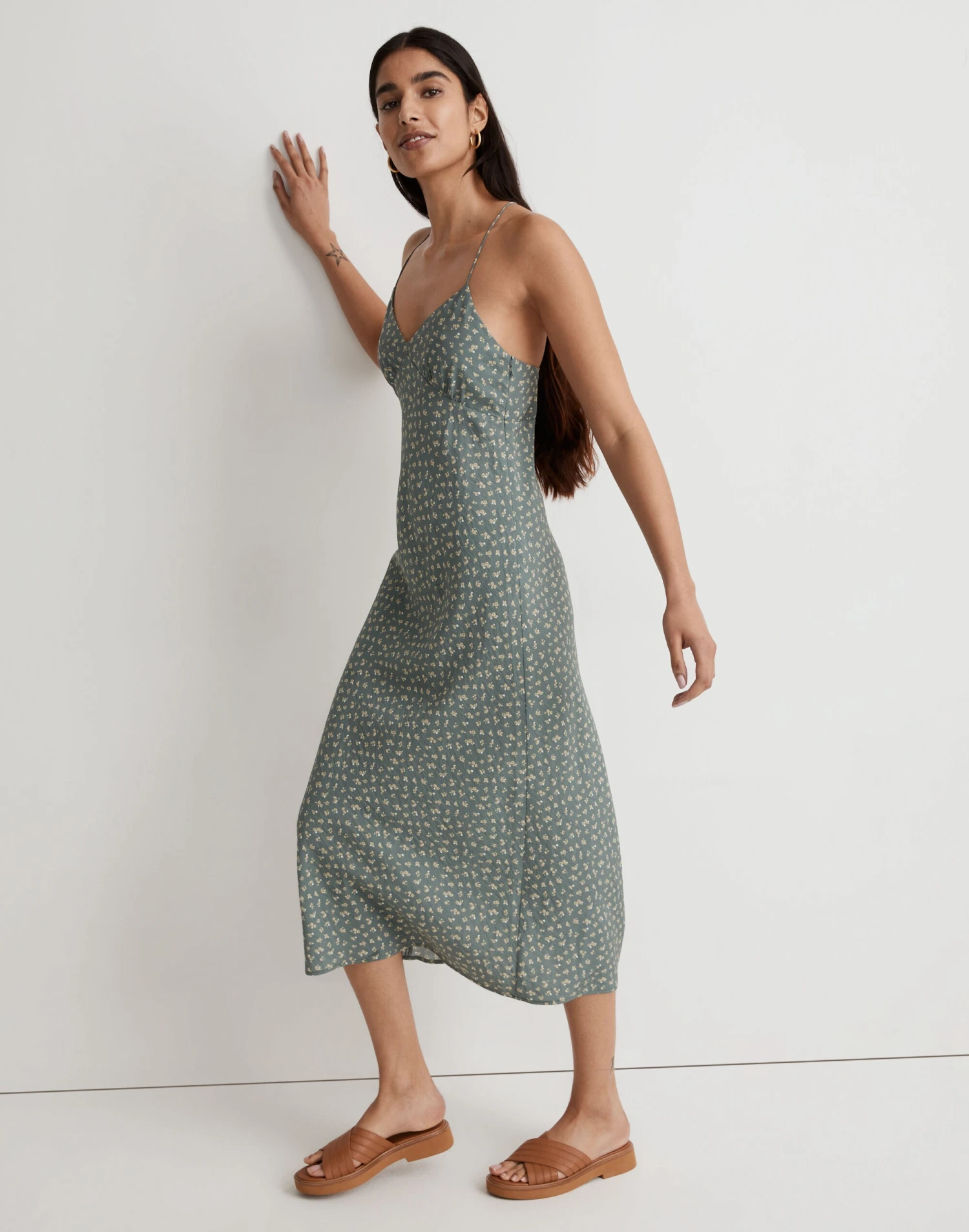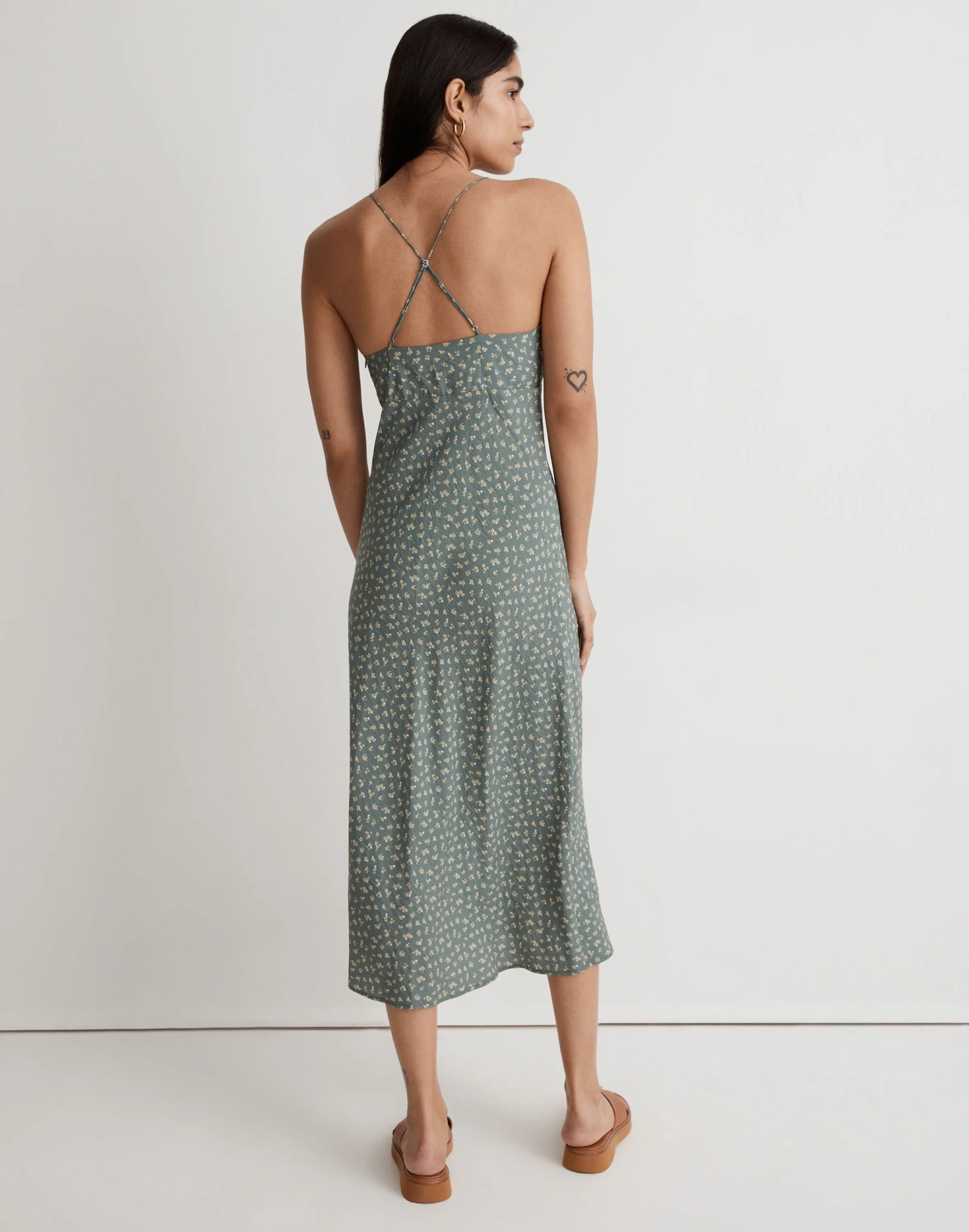 Woven with eco-friendly Lenzingâ„¢ Ecoveroâ„¢ fibers and print with tiny florals, this highly-anticipated midi slip dress drapes beautifully on the body. With thin cami straps, a sexy V-neckline and angular seaming at the bust, it’s the perfect one-and-done party piece, or wear it layered for an easy pared-down moment.