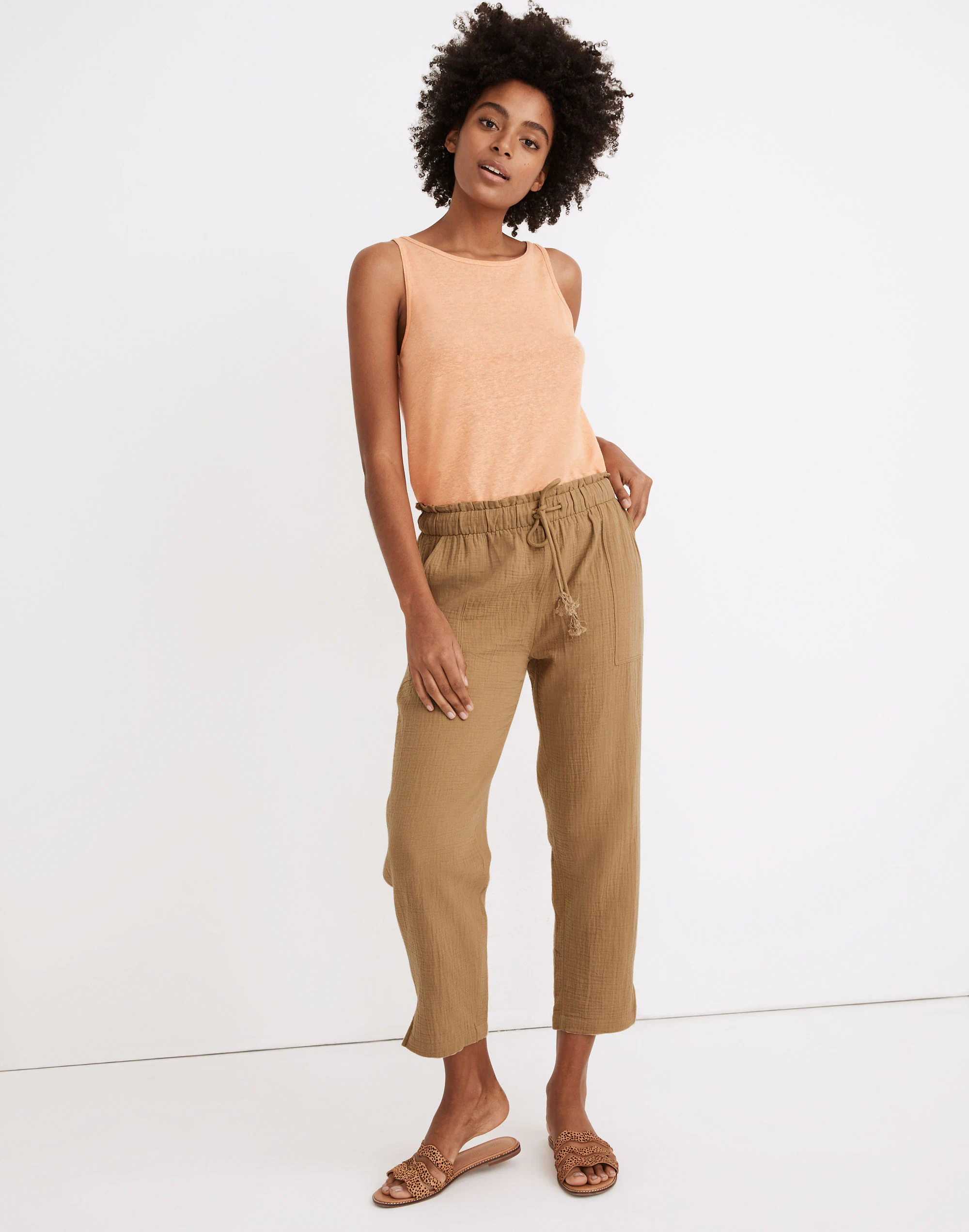 Made of soft and airy double gauze, these pull-on pants are a relaxed version of our signature track trousers. With a tasseled tie at the waist and plenty of pockets, they’re made for beach days, backyard days…every day.