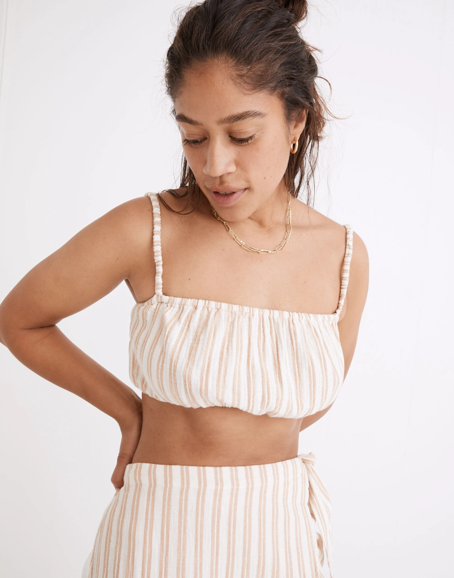 Made of a featherweight version of our supersoft Lightspun double-layered cotton gauze, this bubble top has delicate ruched straps and elasticized hems so it can be worn cropped or suuuuper cropped. Try it with the matching striped skirt.
