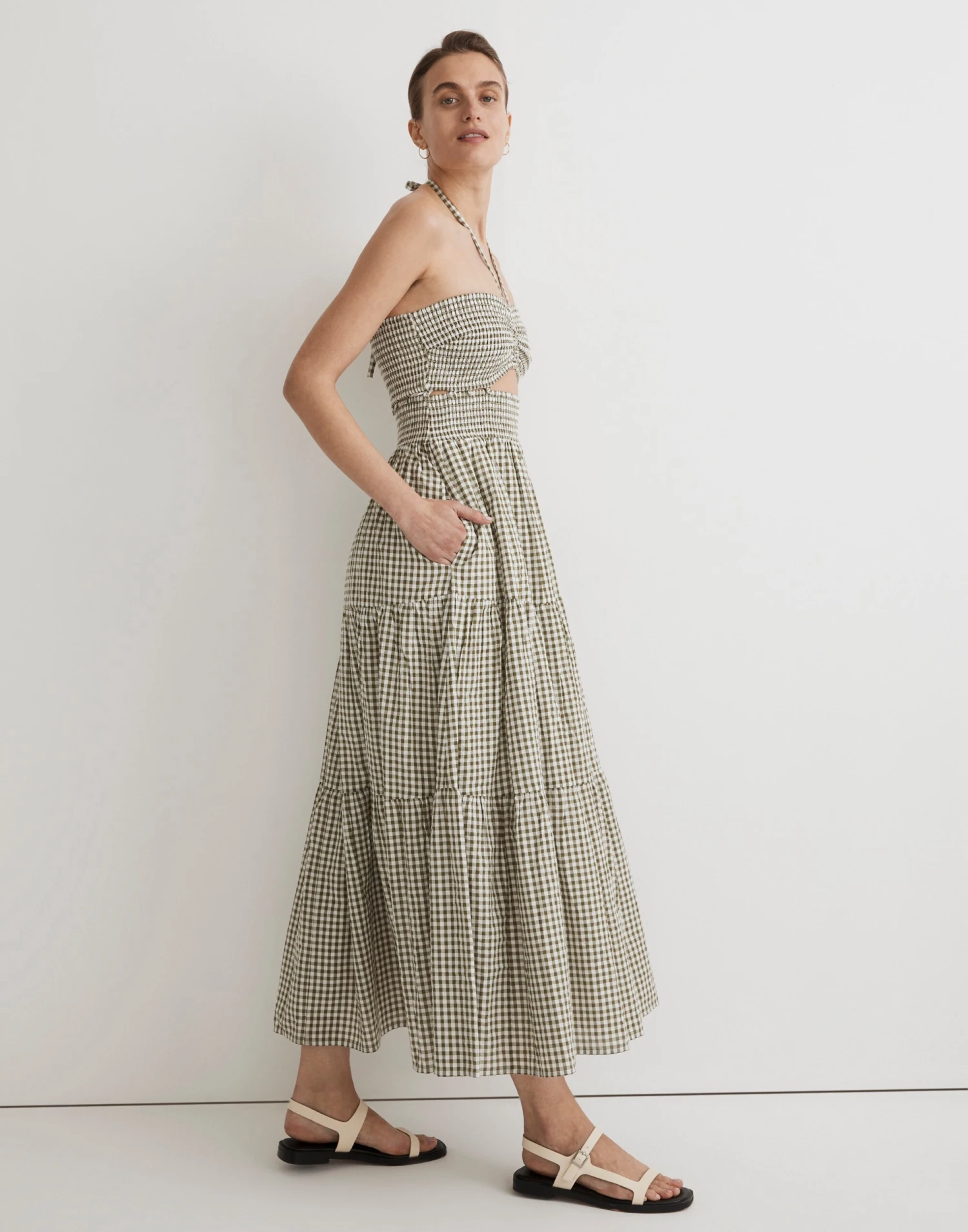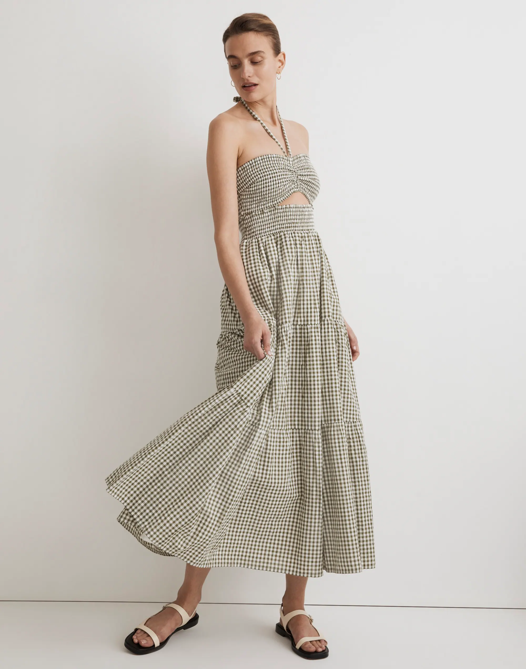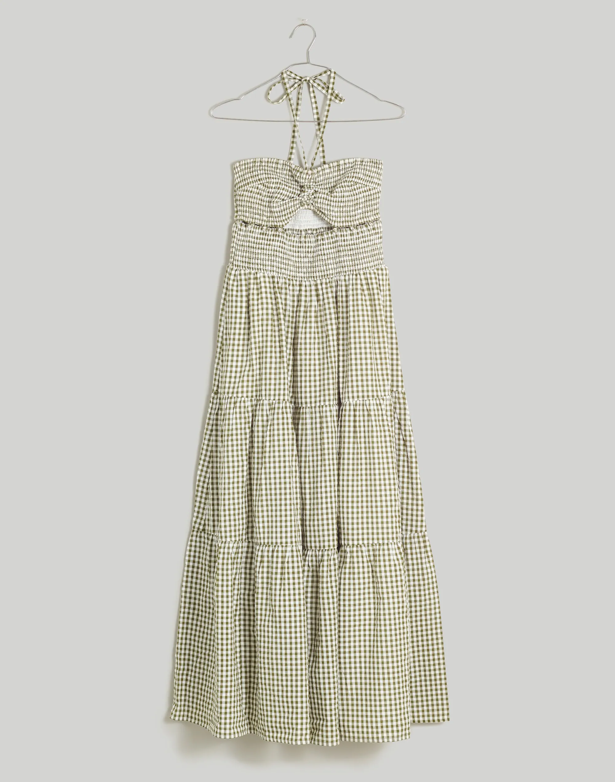 We love a three-fer, especially in yarn-dyed gingham cotton poplin. This bralette/skirt combo buttons together into the perfect summer midi dress with a halter strap at the sweetheart neckline, flirty front cutout and flowy tiered skirt.