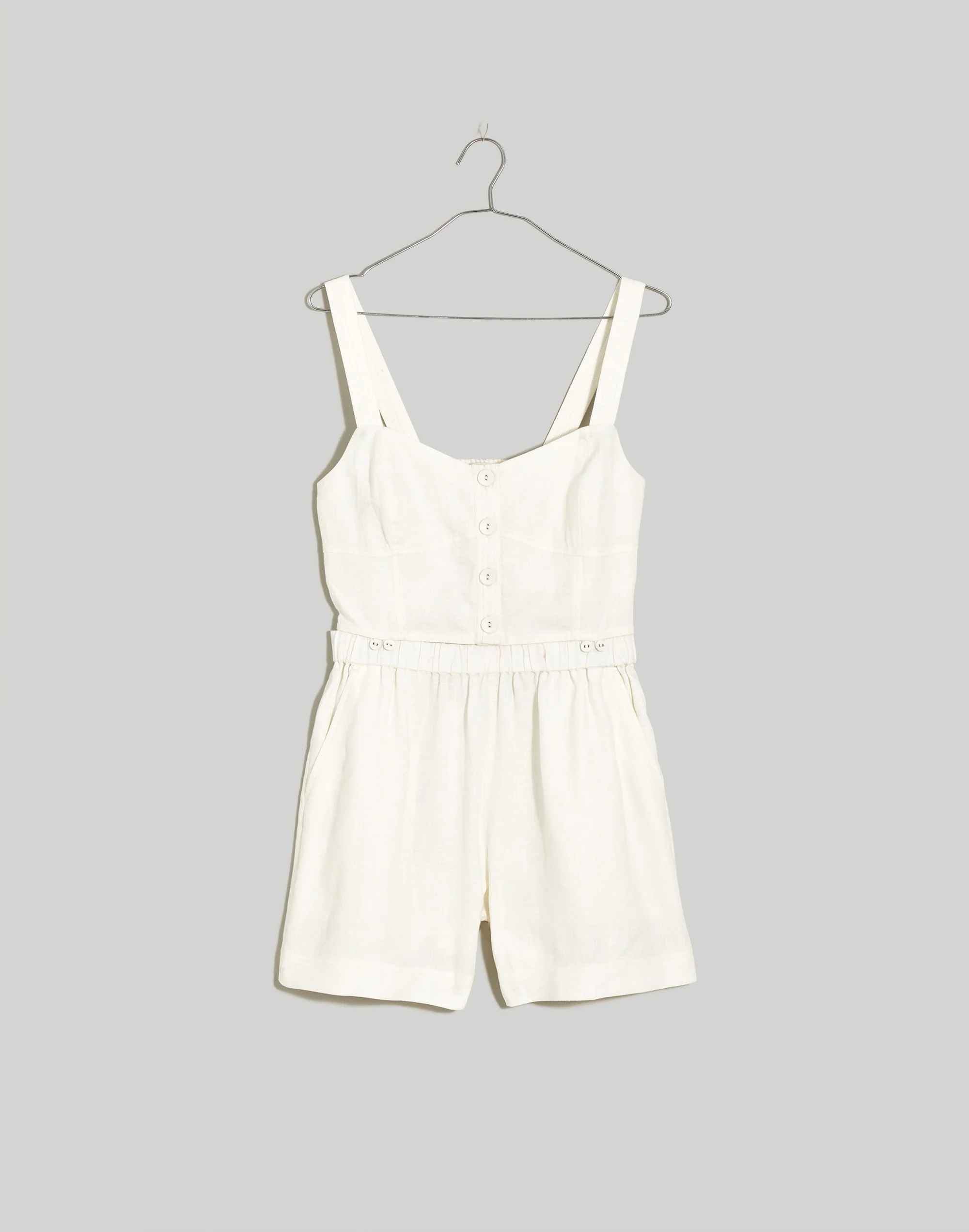 We love a three-fer, especially in 100 percent lightweight linen. This tank/short combo buttons together into the perfect summer romper with a square neckline and smocked back.