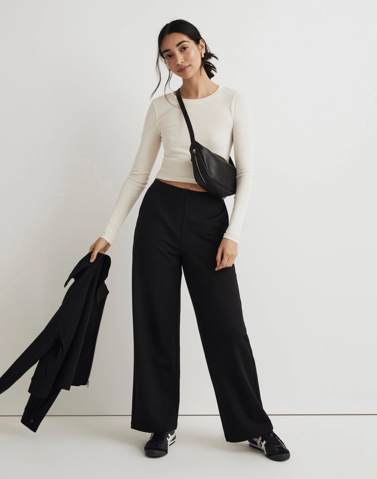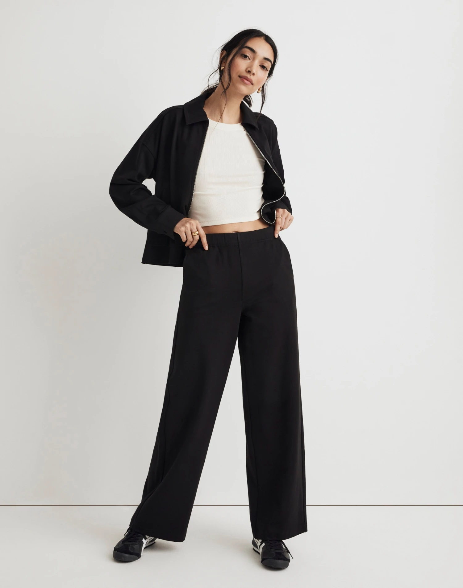 The fabric: sleek and structured, this ponte is polished enough to dress up or down. The fit: the perfect travel pant with a pull-on waist and wide legs.