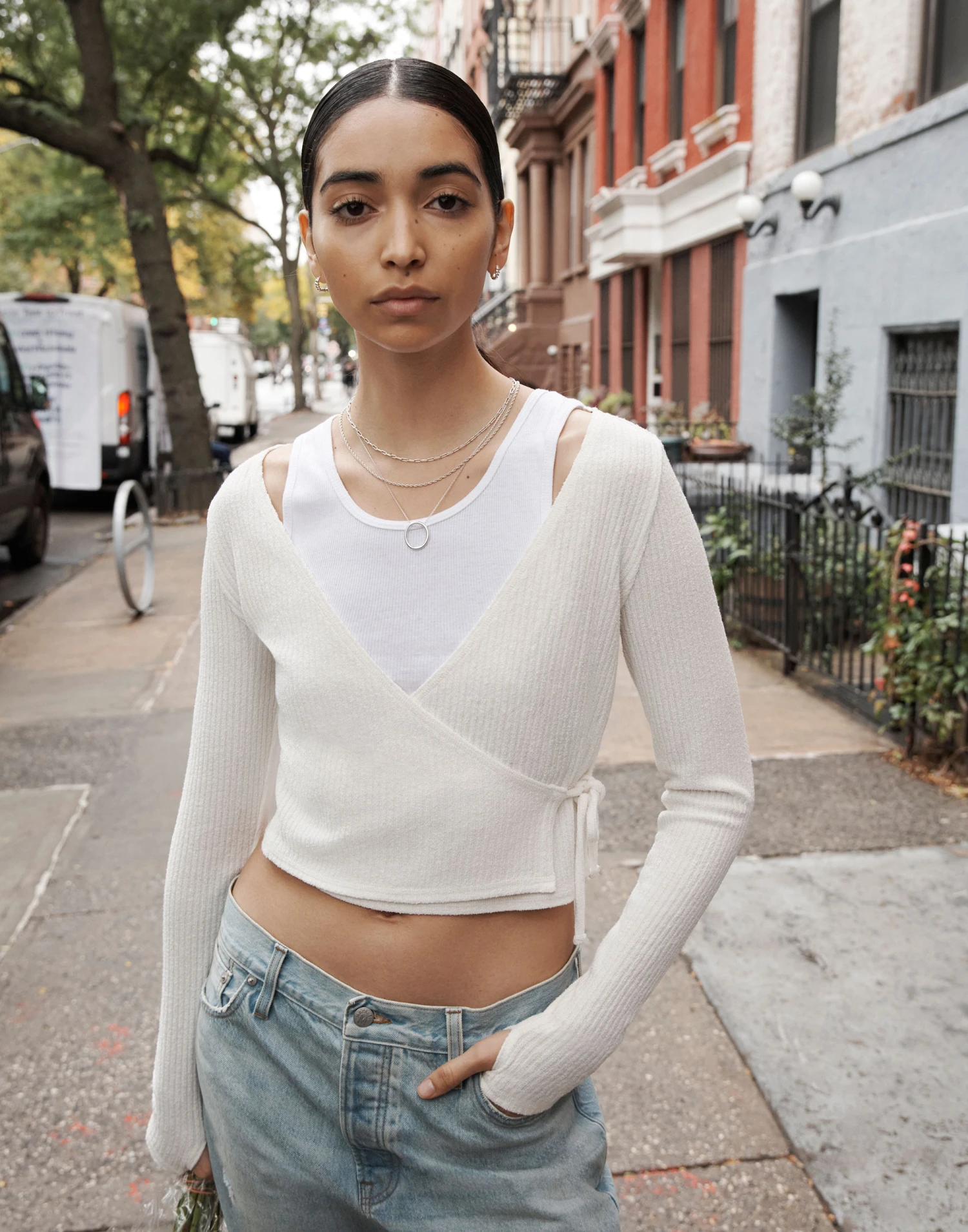 The fabric: lightweight and airy ribbed crepe that’s made using recycled polyester. The fit: ballet class all grown up, this tie-front wrap top is slightly cropped with romantic long sleeves.