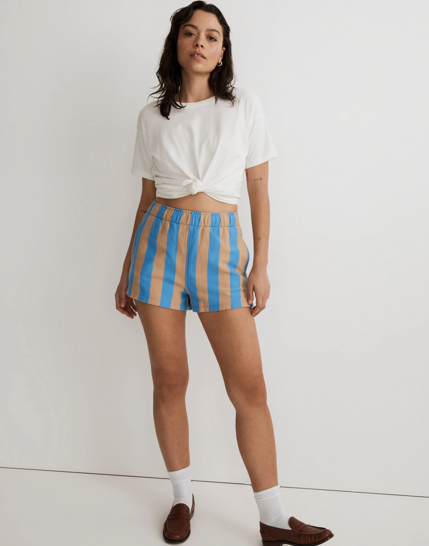 The fabric: striped and airy terry that’s made from a recycled cotton-polyester blend. The fit: easy, everyday sweatshorts with an interior drawstring waist (wear it folded over—or not) and roomy side pockets. The set: pairs perfectly with the matching tank.