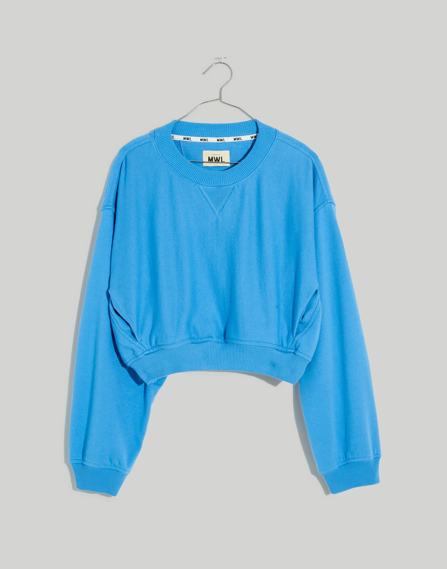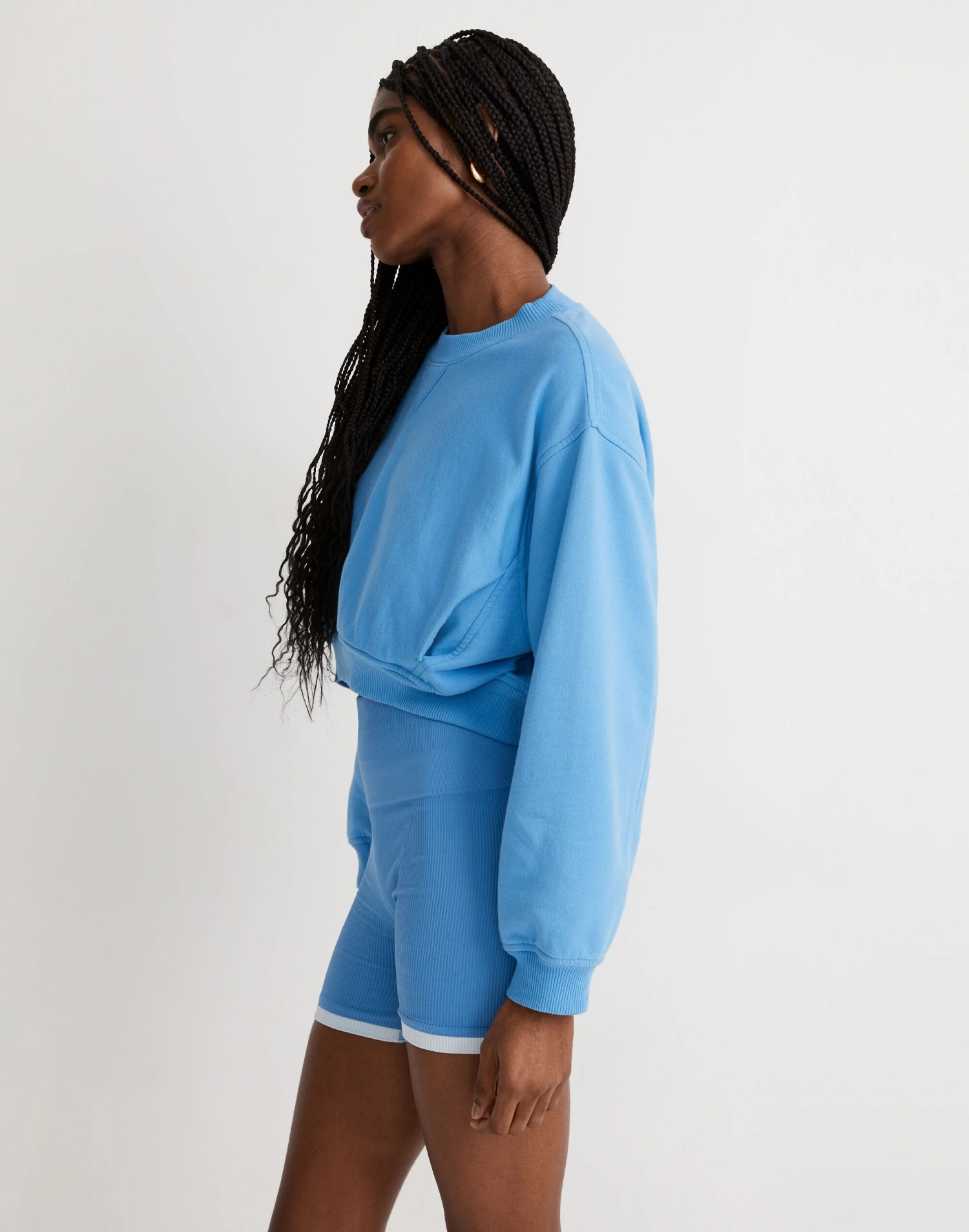 The fabric: lightweight and airy terry that’s made from a recycled cotton-poly blend. The fit: cropped with drop shoulder sleeves, this relaxed sweatshirt has side pockets and contrasting seam details. The set: try it with the matching sweatshorts.