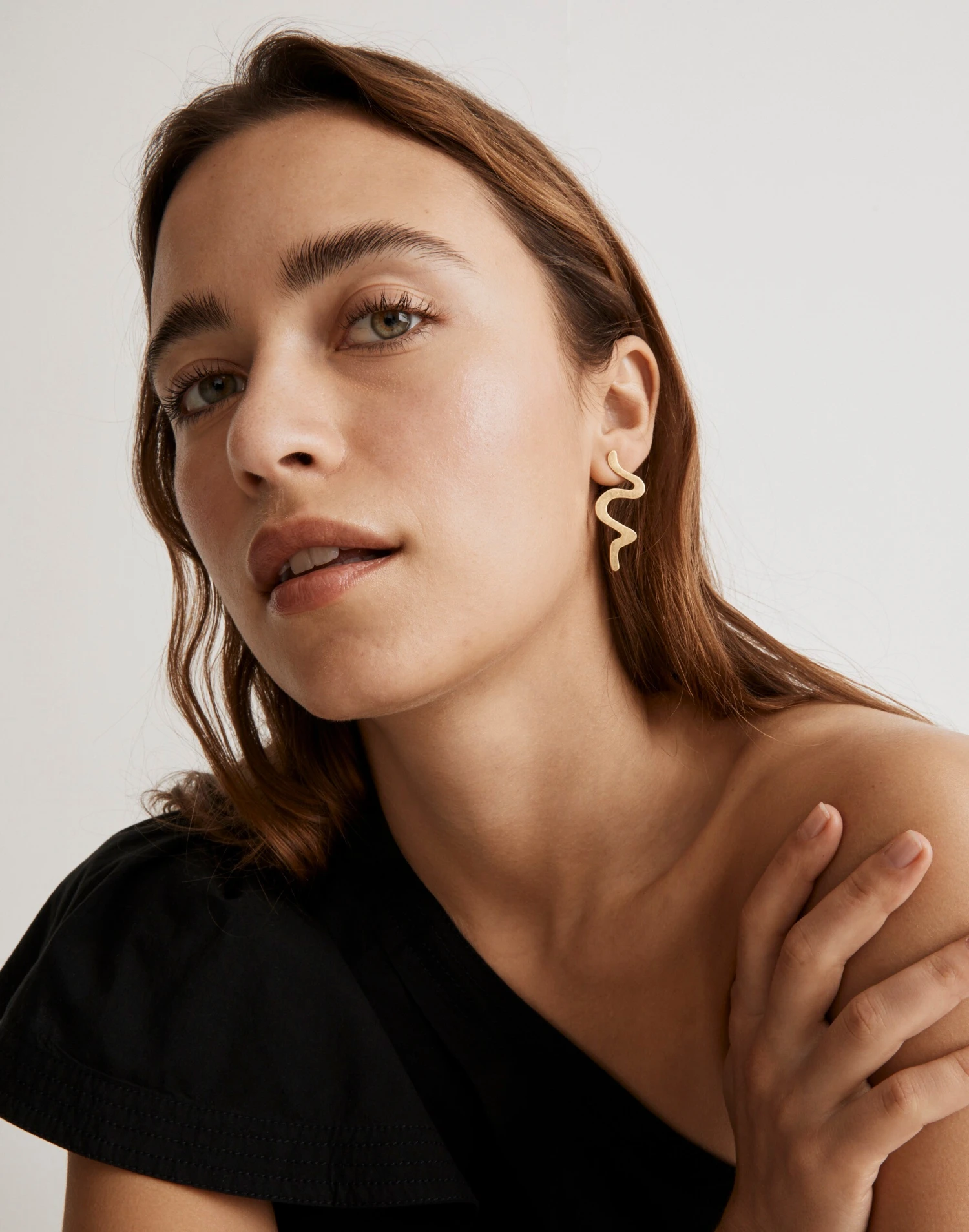 A serpentine-like statement in gold-plated brass, these organic-shaped earrings hang from a secure post back and look so chic with the matching necklace set.