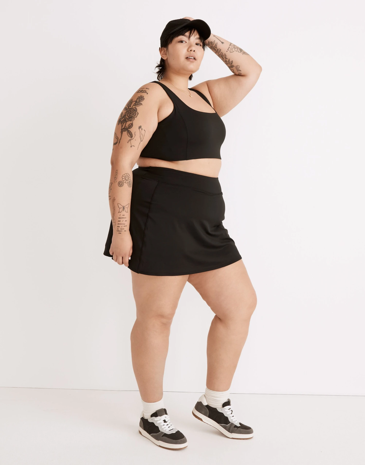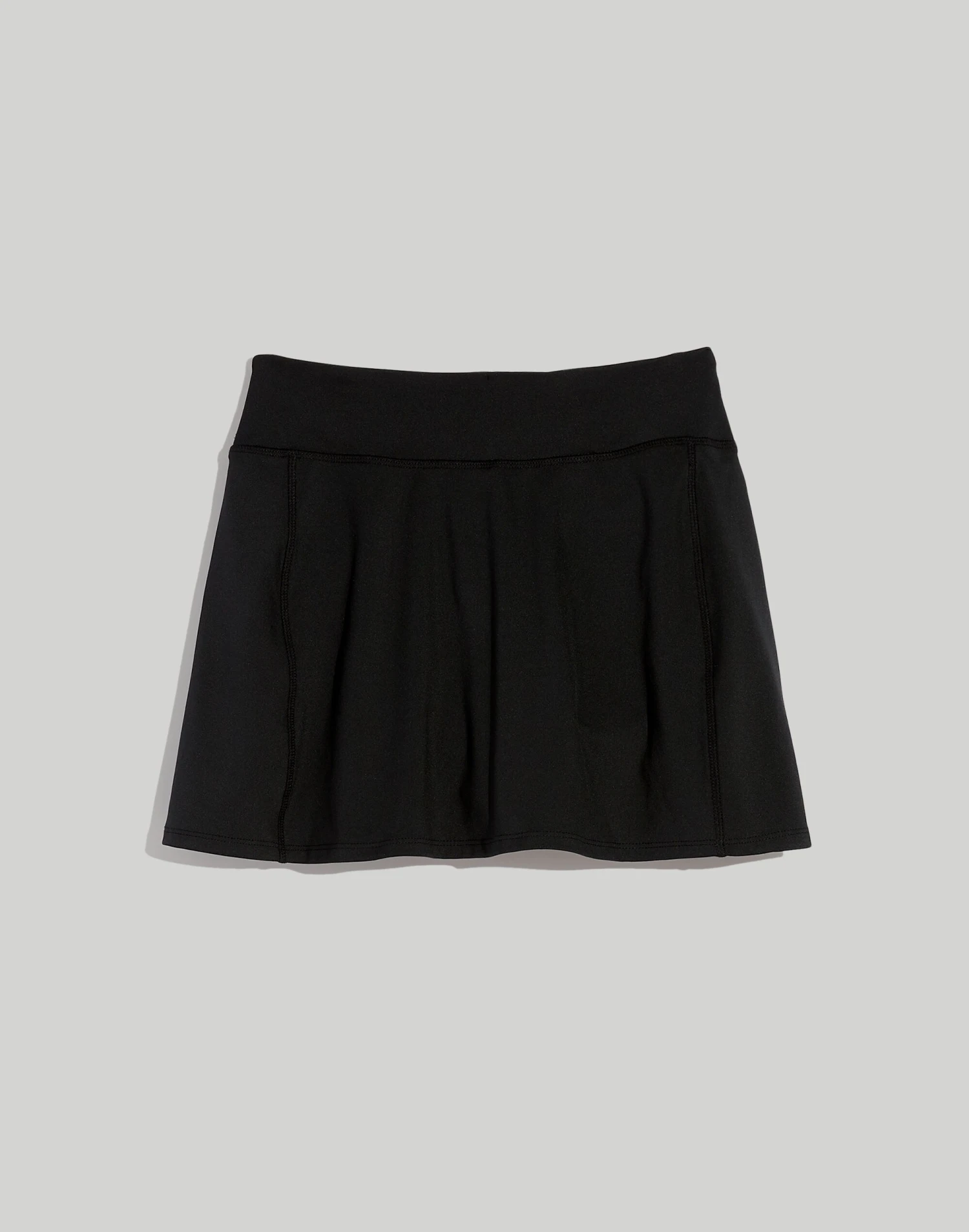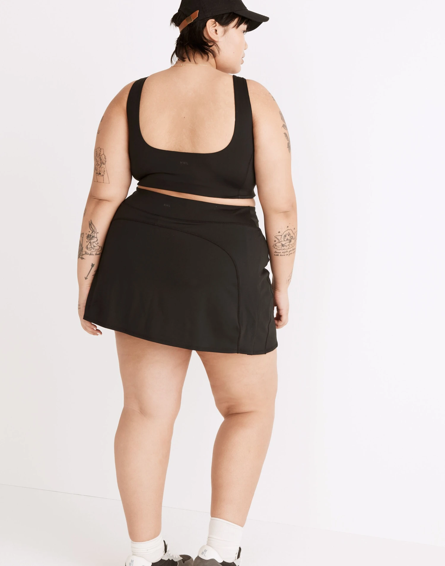 The fabric: engineered with four-way stretch, MWL Flex is supersoft, sweat-wicking and made using recycled materials (13 water bottles, in this case). The fit: seamed in the back for a booty-friendly rearview, this exercise mini skirt has built-in biker shorts, plus, tons of pockets including a special bottom-entry pocket to store your tennis ball.