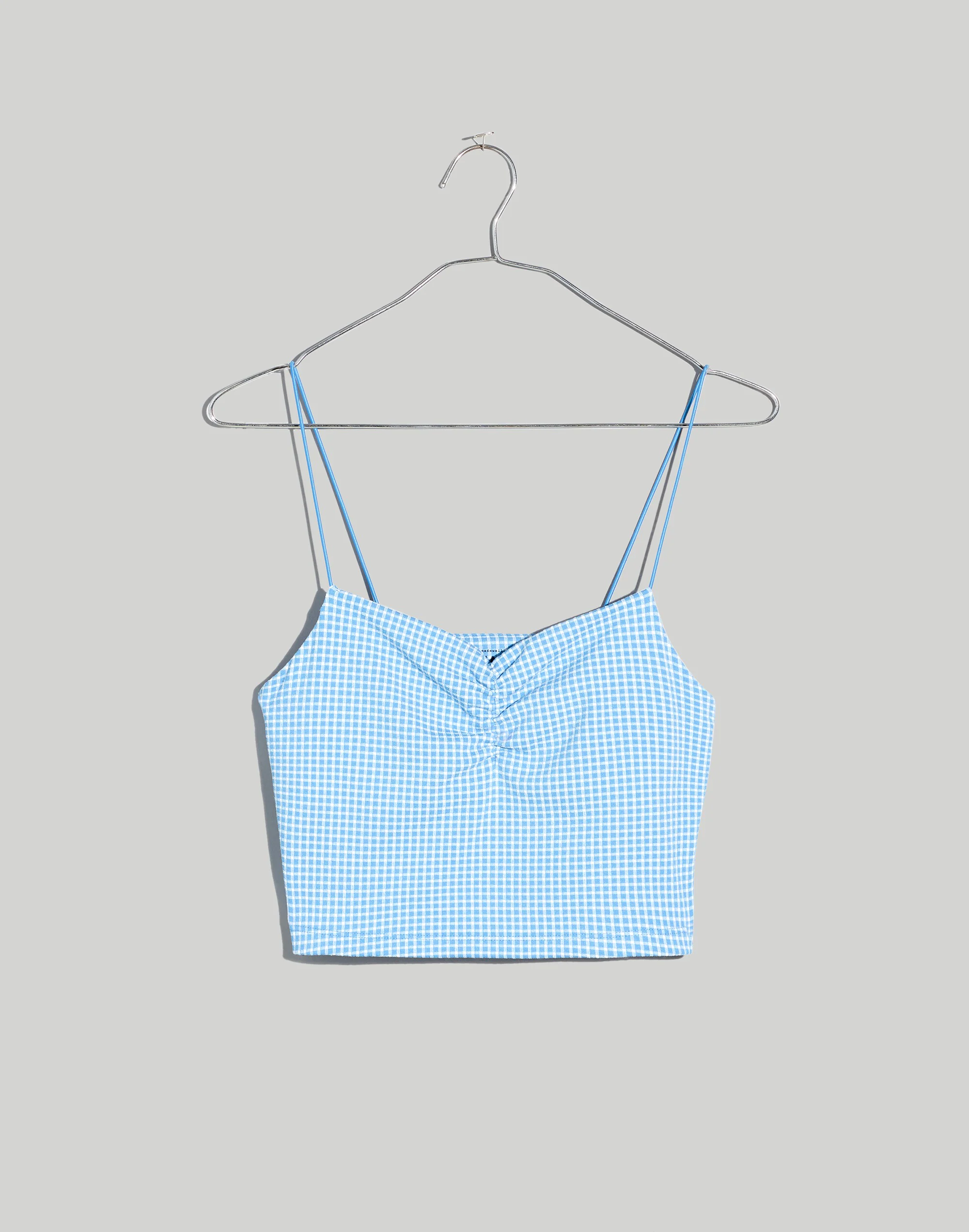 The fabric: engineered with four-way stretch and zero grin-through, MWL Flex is supersoft, sweat-wicking and made using recycled materials. The fit: a cropped tank with skinny bungee straps, a ruched sweetheart neckline and built-in shelf bra. The set: try it with the matching skort or your favorite high-rise jeans.