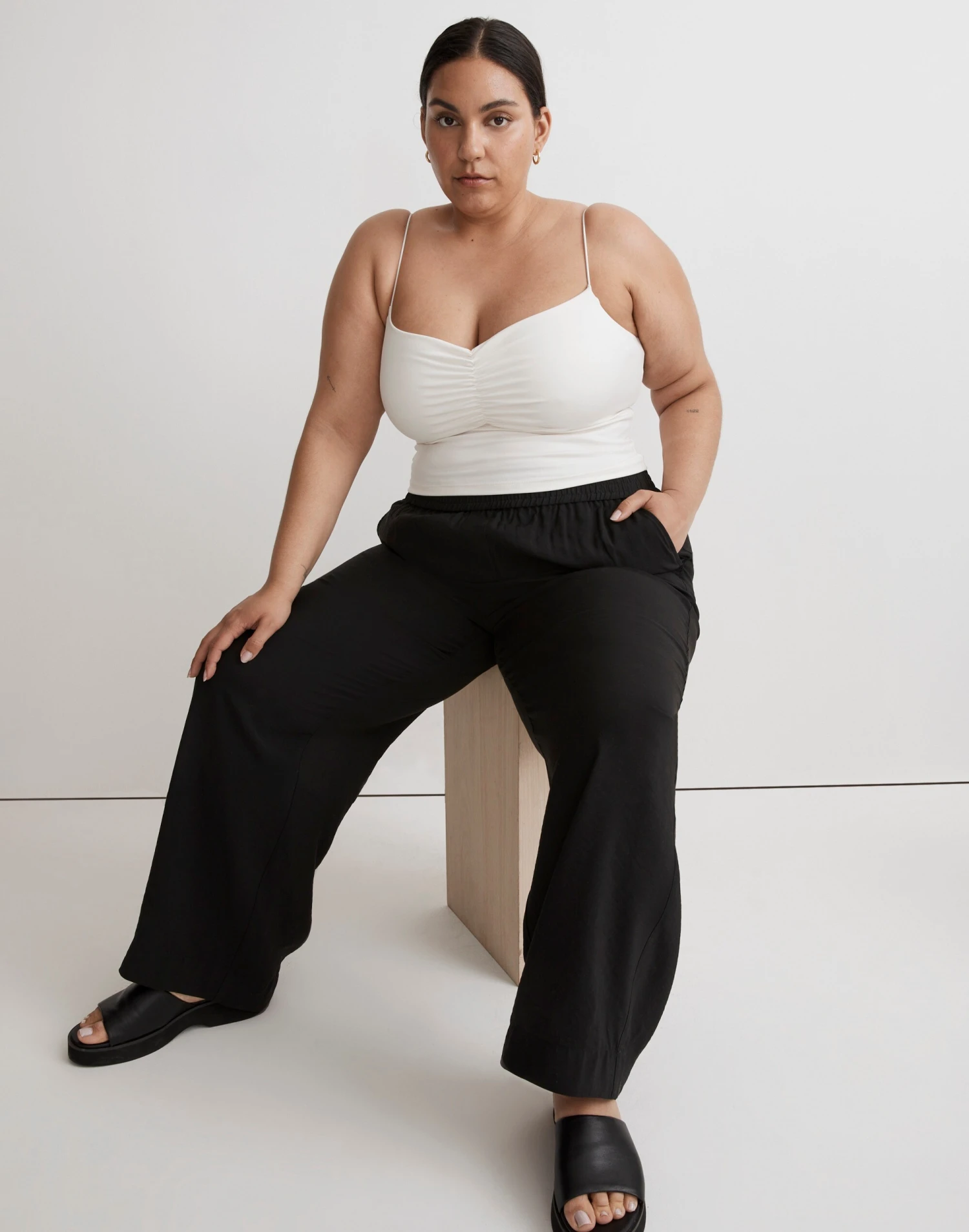 The fabric: engineered with four-way stretch, MWL Flex is supersoft, sweat-wicking and made using recycled materials. The fit: a cropped tank with skinny bungee straps, a ruched sweetheart neckline and built-in shelf bra. The set: try it with the matching skort or your favorite high-rise jeans.