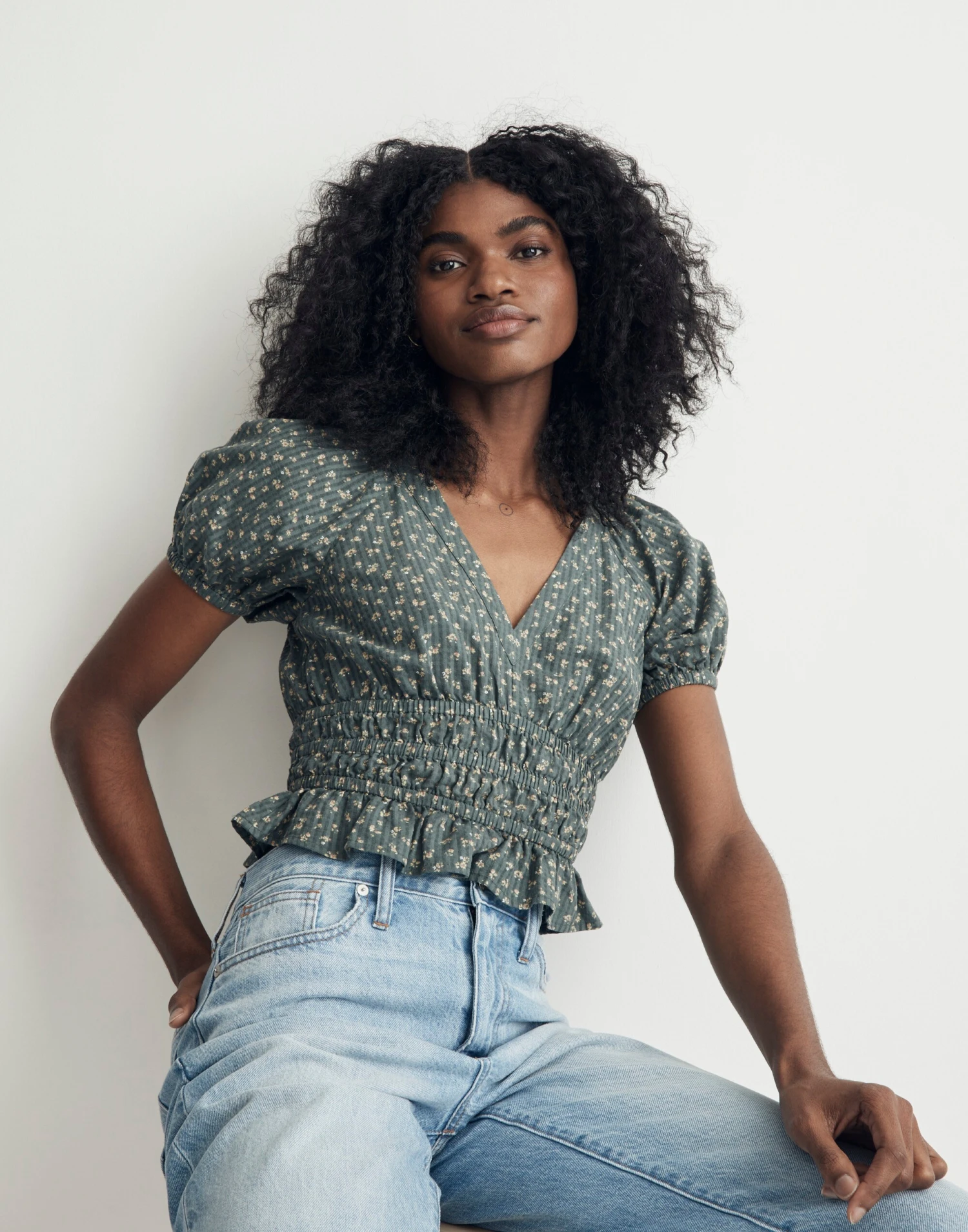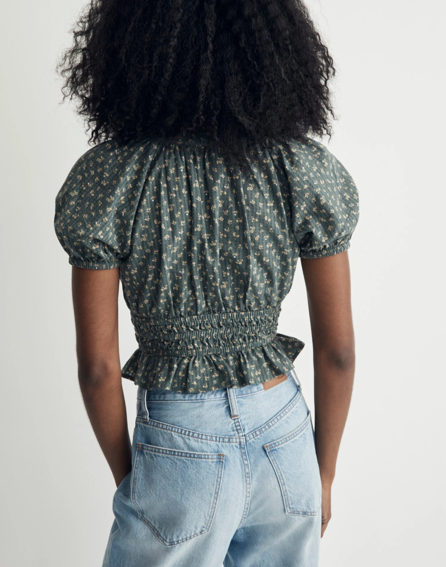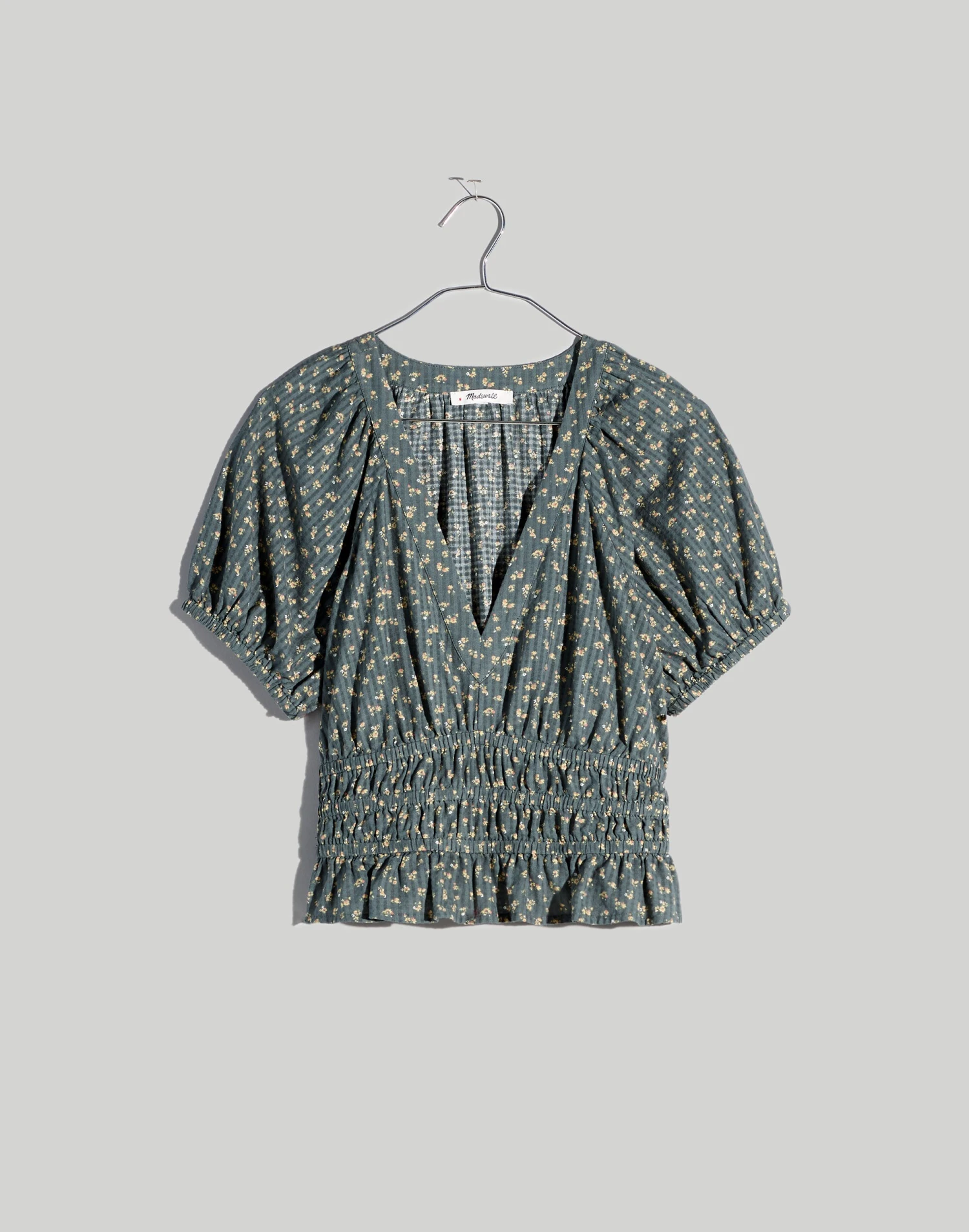 Coming in allover florals, this V-neck top has a romantic vibe thanks to the pretty puff sleeves, smocked waist and ruffled cropped hem.