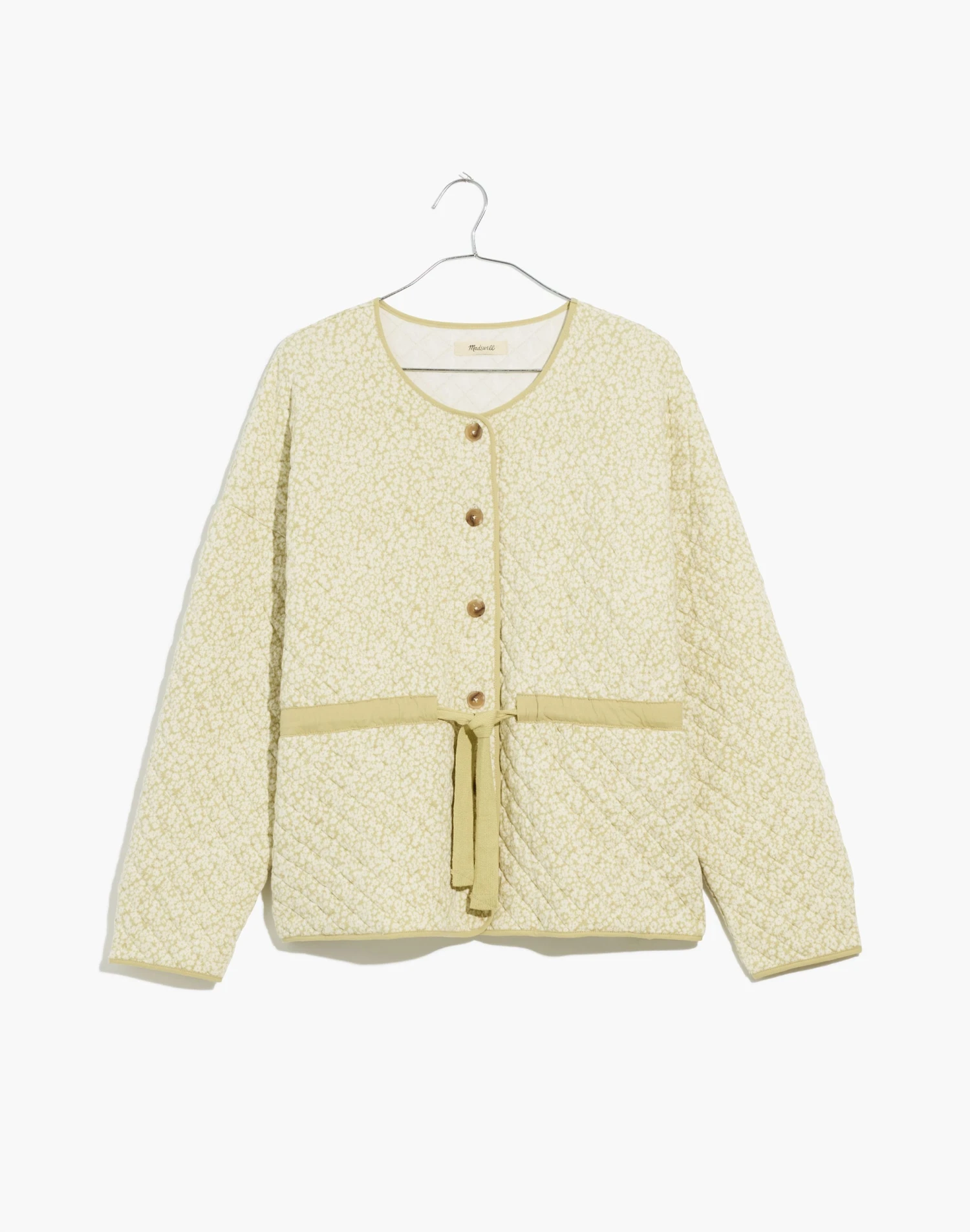 Coming in floral-print quilted jacquard, this collarless jacket has snaps along the front, a drawstring waist and contrasting twill trim. It’s the cute layer you’ll reach for on those weird in-between weather days.