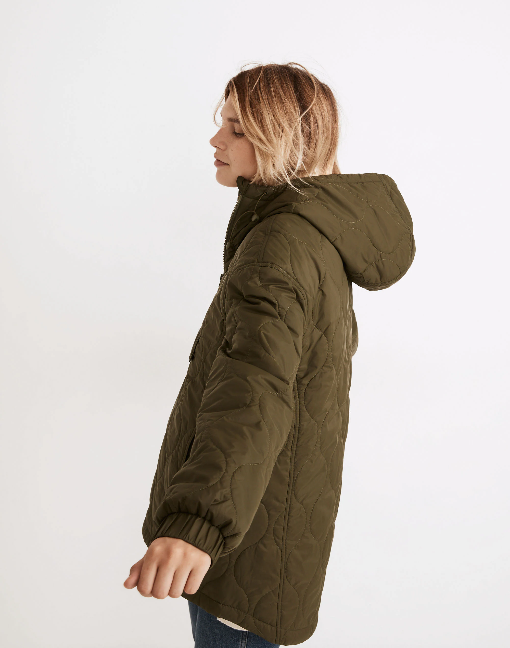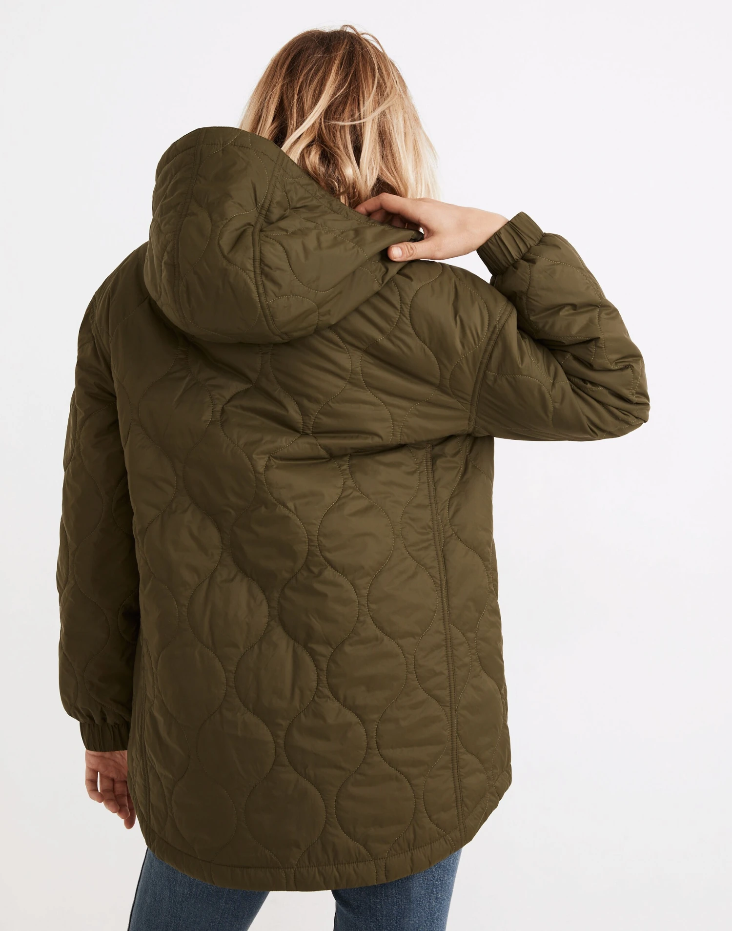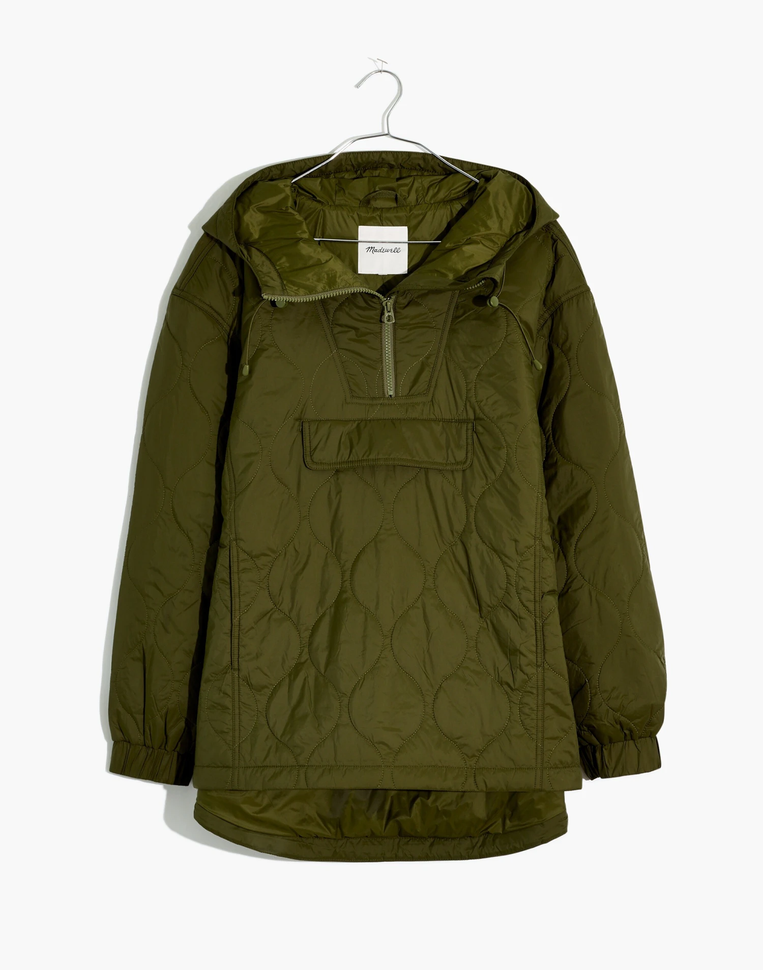 Crafted from quilted (and recycled) fabric, this popover puffer jacket is filled with PrimaLoft® insulation, a warm-as-down alternative made of 100 percent recycled content (aka we’re keeping plastic bottles out of landfills with this style). Complete with a cozy hood, it has elastic cuffs, an adjustable bungee hem and packs down into the hand-warming kangaroo pocket.
