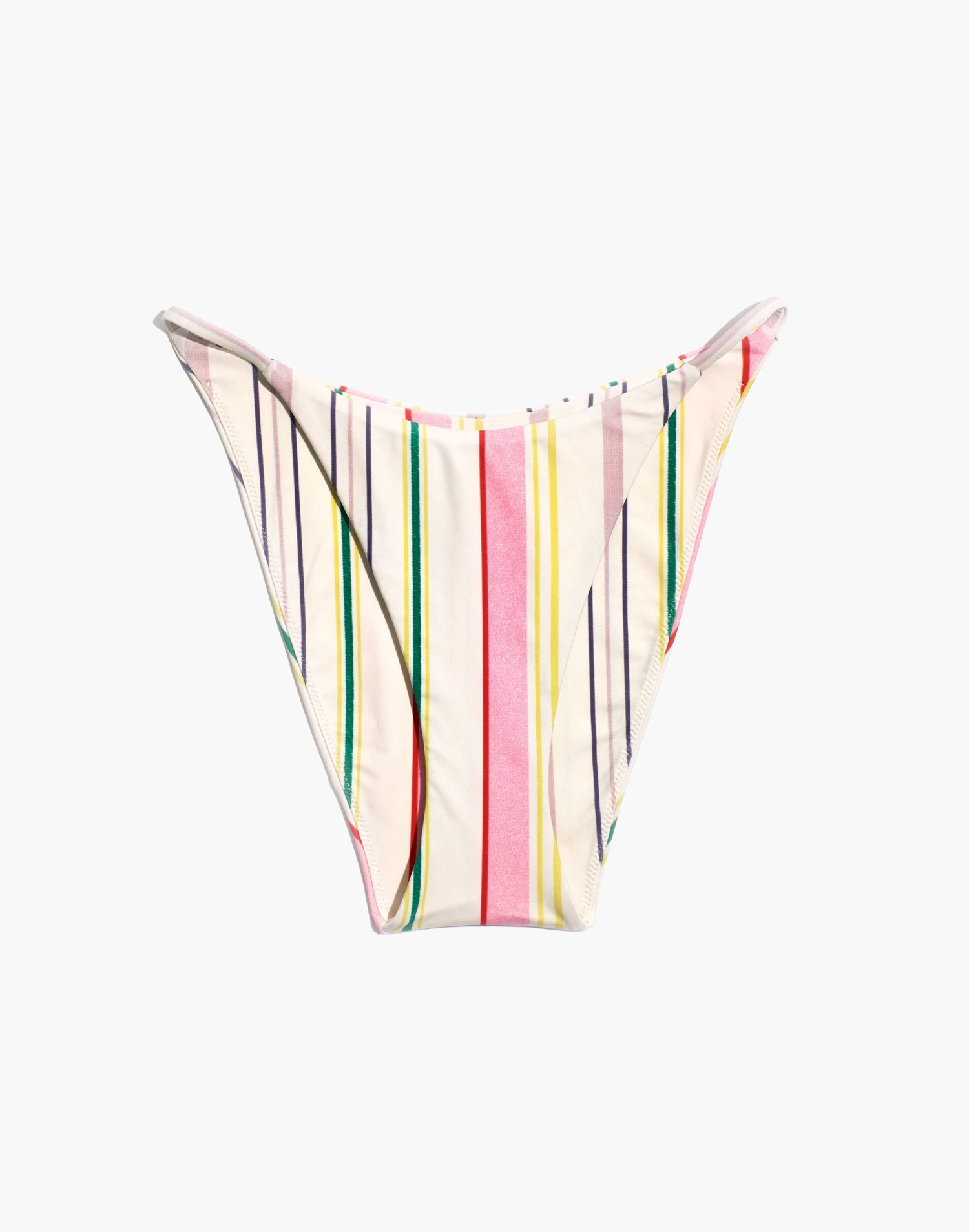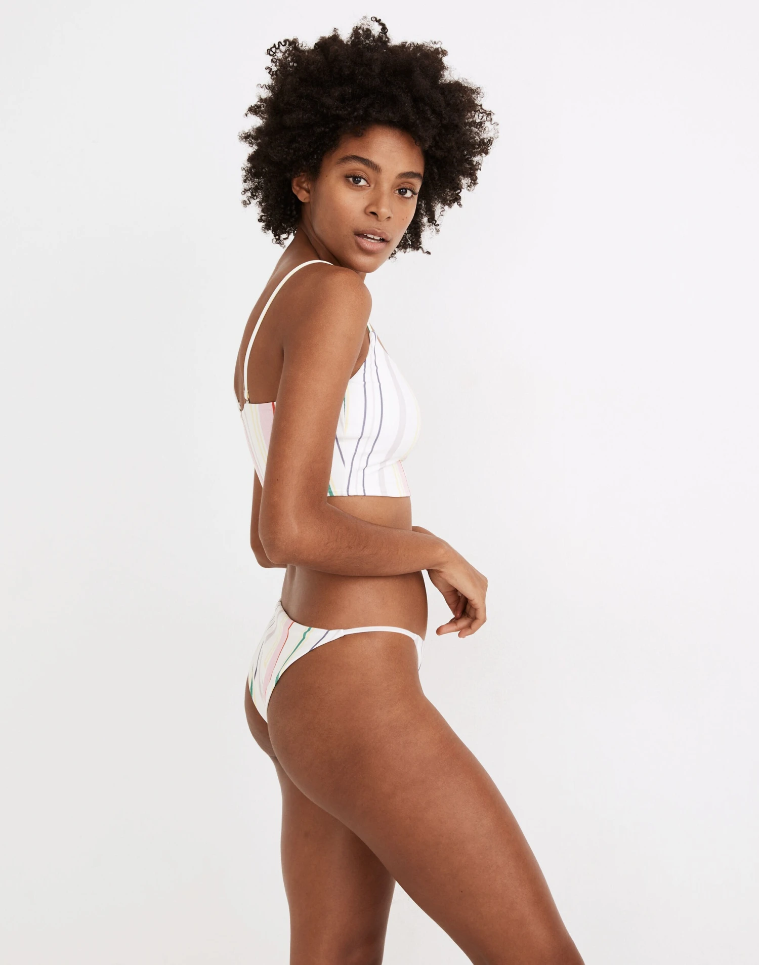 Our Madewell Second Wave swim collection has a built-in feel-good factor—the fabric was made from recycled material. Coming in our signature rainbow stripes, this slightly cheeky bikini bottom has narrow side straps and a curved waist that can be worn high or low. With sizes running from XXS to XXL, it’s an “everyone needs it” kinda deal.