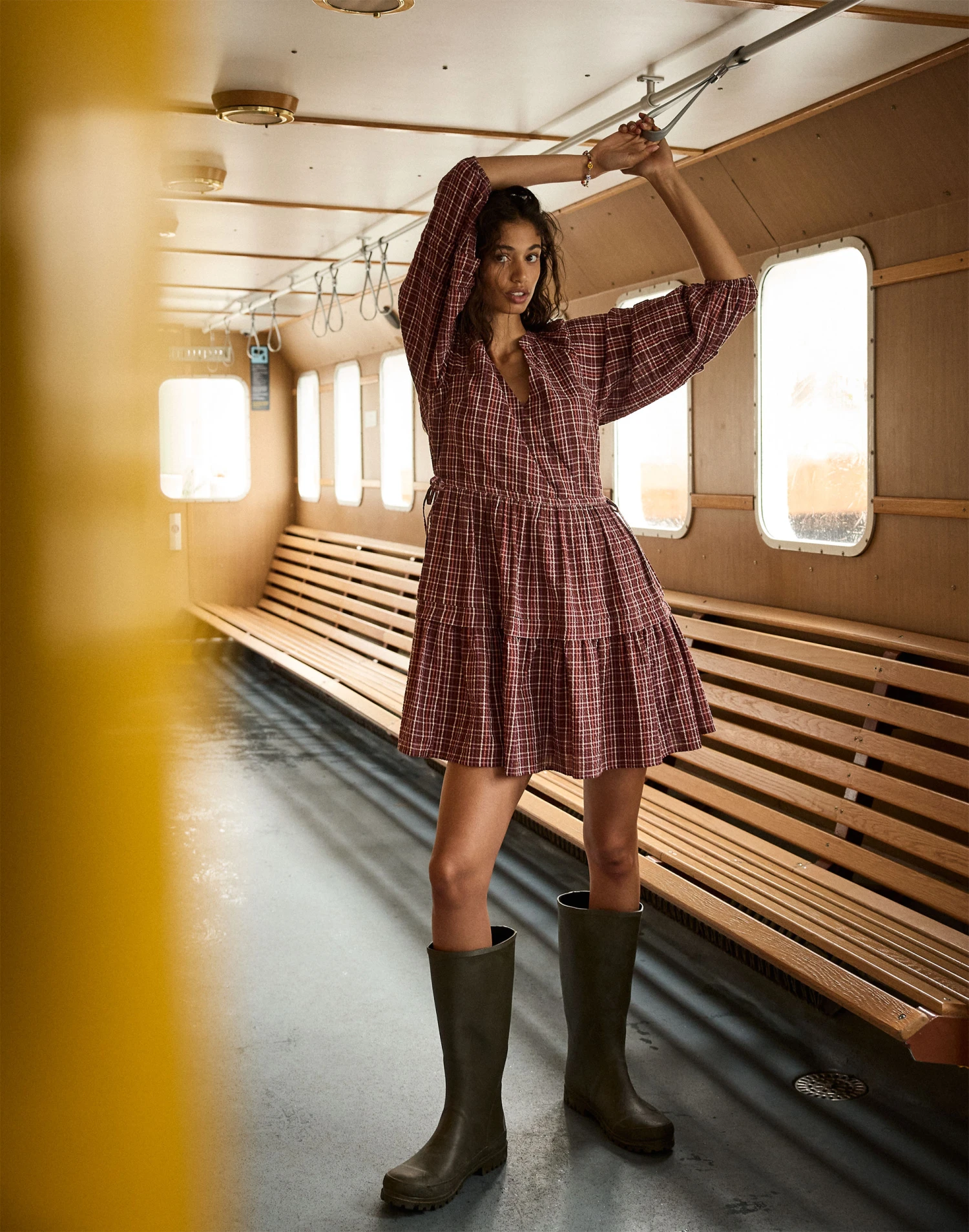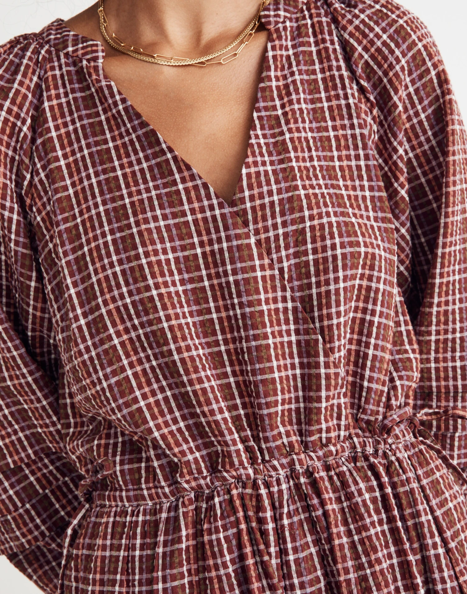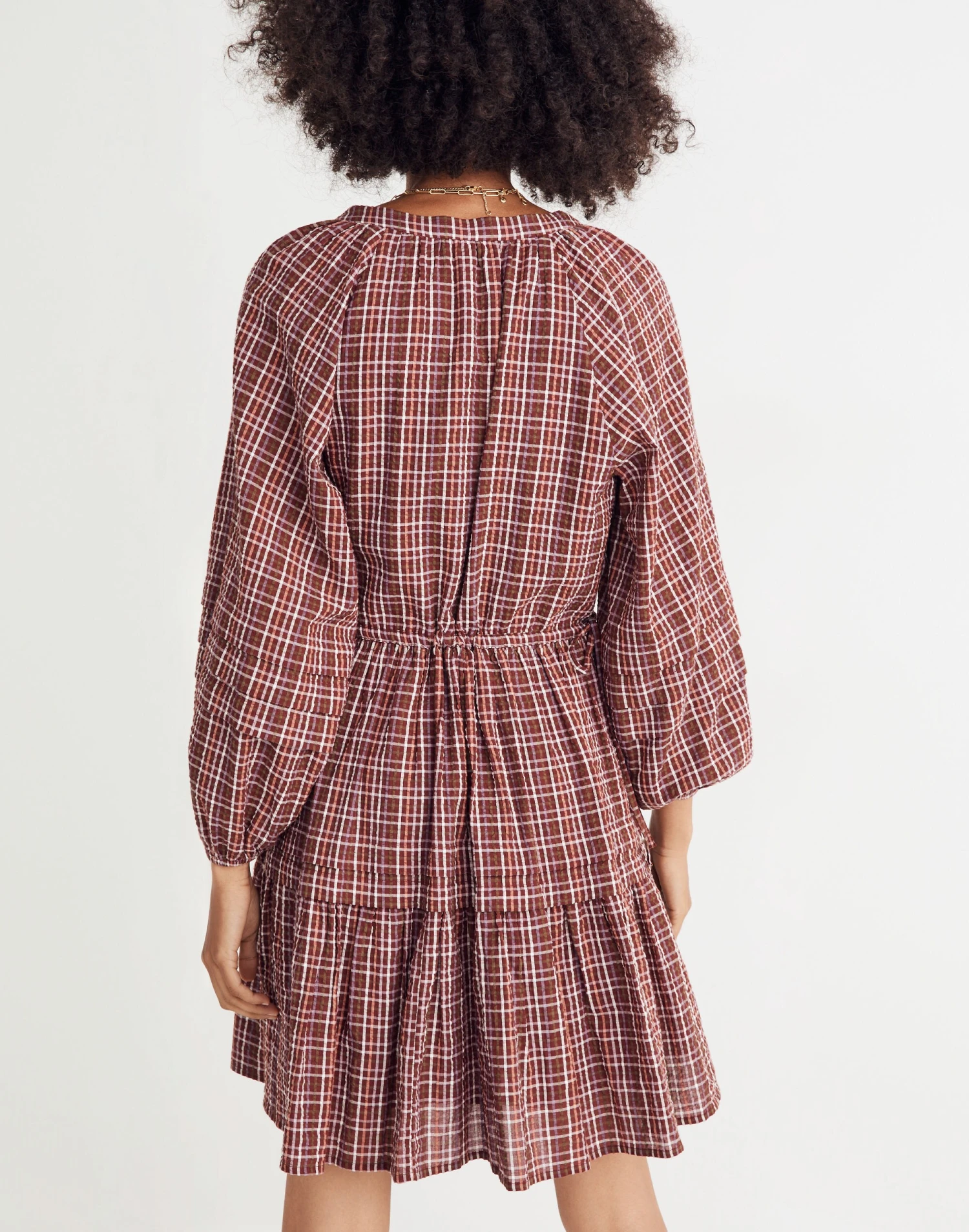 Made of a lightweight cotton seersucker, this mini dress has a wrap bodice, bracelet-length raglan sleeves and a tiered A-line skirt. With an adjustable tie at the comfy elastic waist, it’s a supercute style that’ll definitely turn heads. Â