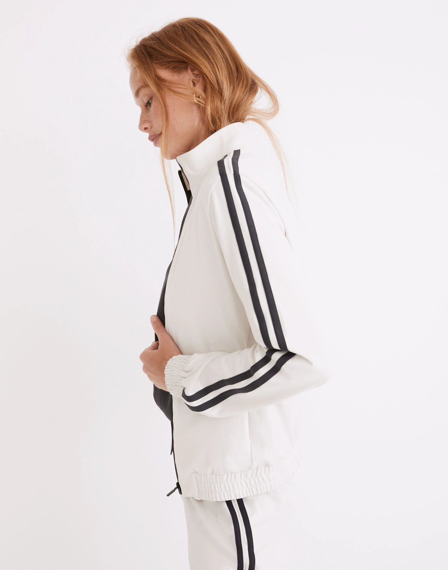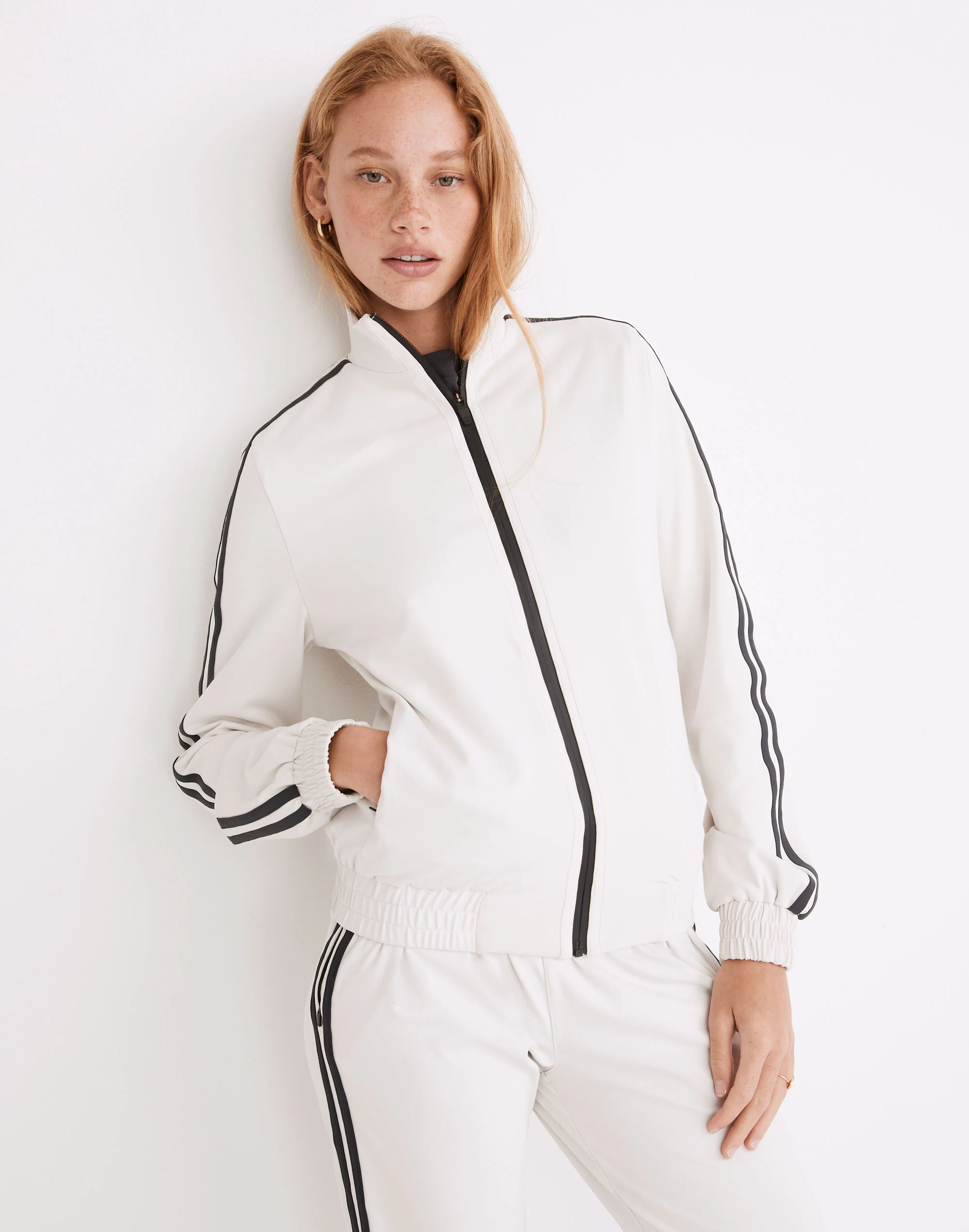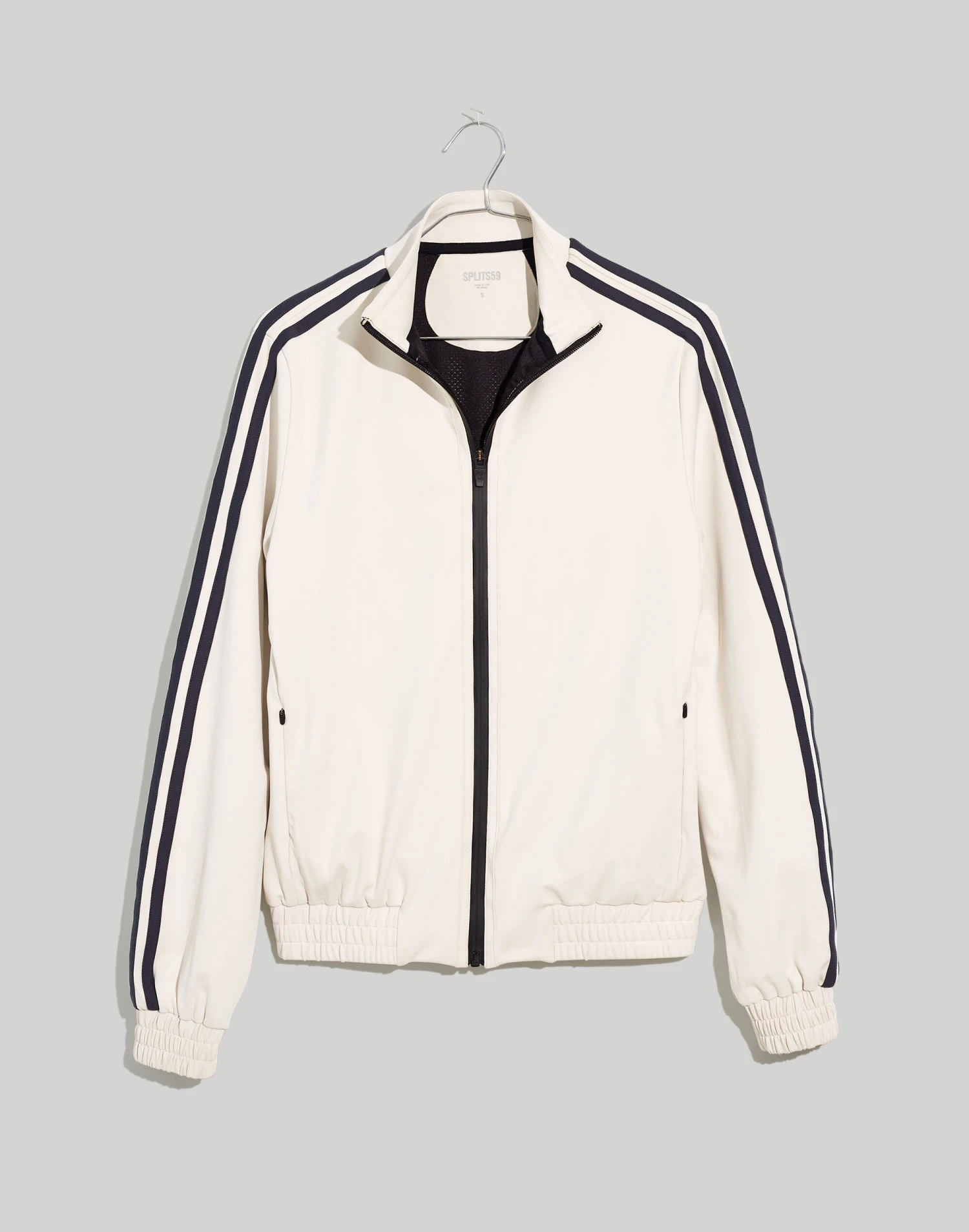 Los Angeles-based Splits59™ makes serious activewear that’s seriously gym-selfie-friendly. Sweat-wicking and quick-drying, this retro Techflex zip-front track jacket has stripes down the sleeves.