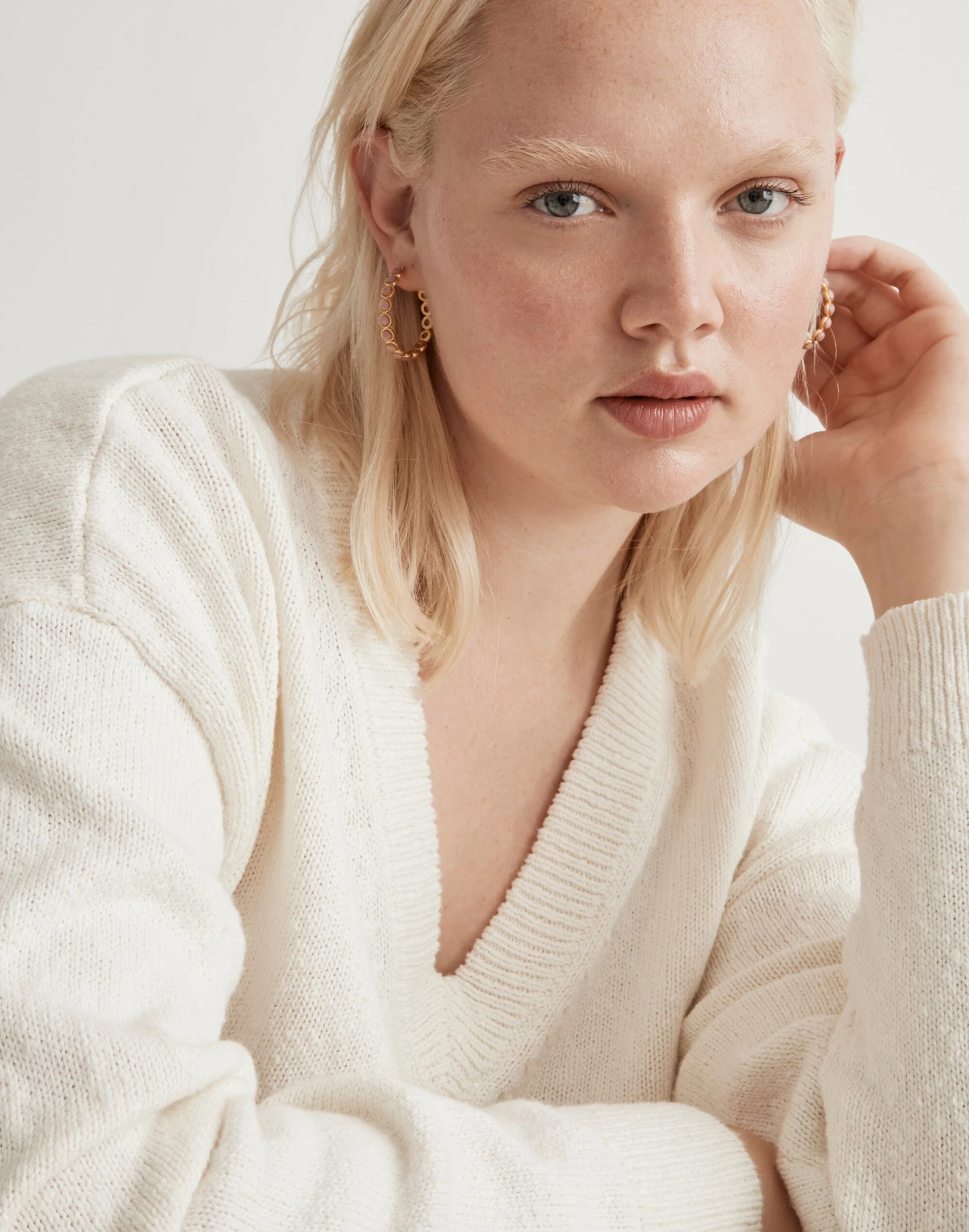 Pretty and powerful, our Stone Collection is made of wearable good vibes. Crafted of gold-plated recycled brass, these hoop earrings are inlaid with bits of semiprecious rhodonite (which, some say, has a grounding and soothing energy).