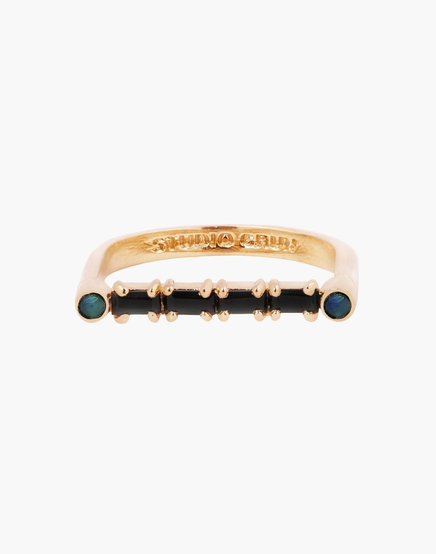 Hand-fabricated in her hometown of Miami, Tanya Gruenberg’s nature-influenced jewelry designs are inspired by the spirit of adventure. Crafted in gold-plated brass, this ring is set with black onyx baguettes and black opal cabochons for a little laid-back sparkle.