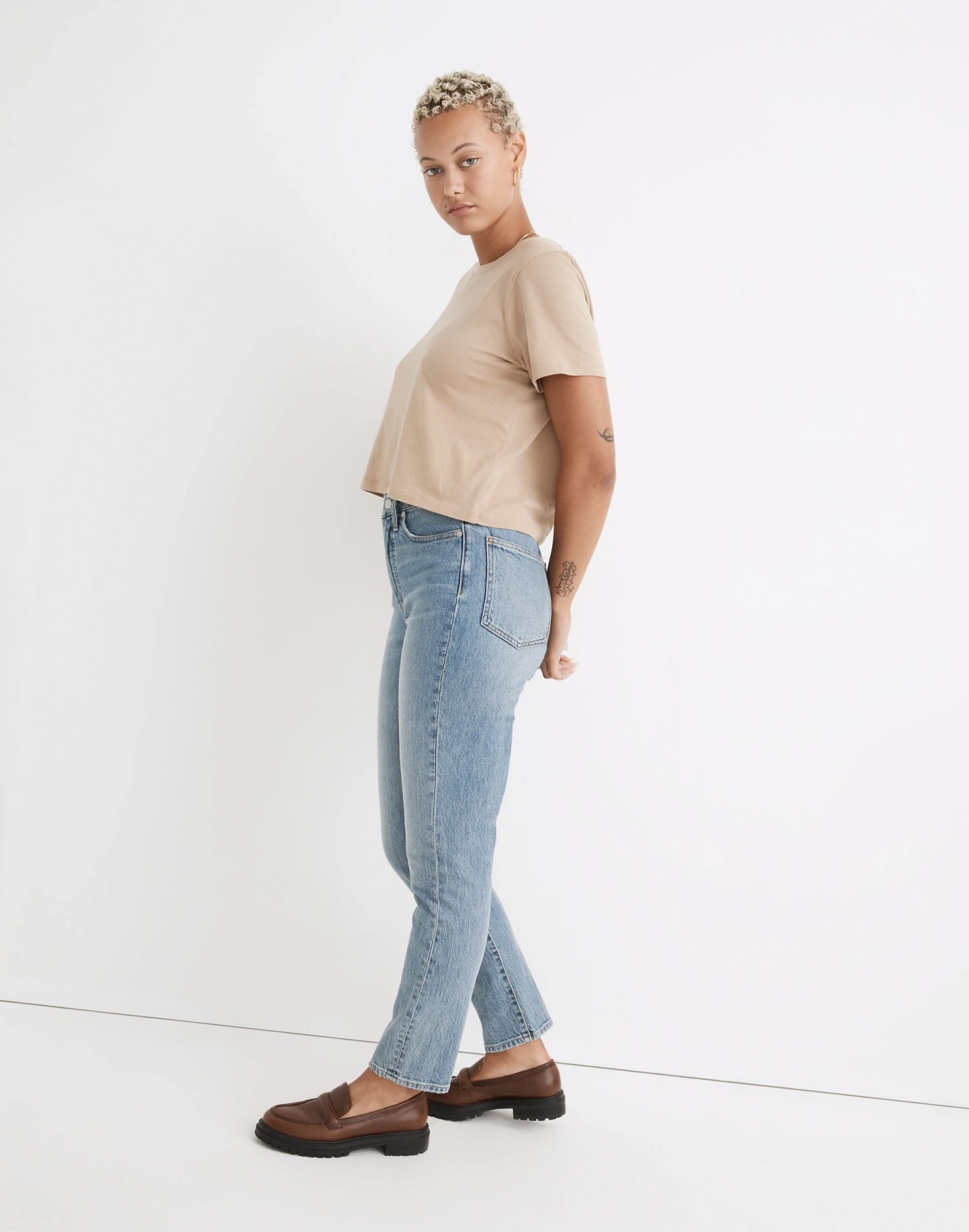 The cut: reengineered for those with an hourglass shape, our tapered ’90s supermodel momjeans have a narrower waist with a contoured band, a longer rise (for a rounder booty) and a little extra room at the hips and thighs. The fabric: premium denim that combines the holds-you-in structure of rigid with a touch of stretch for day-one comfort.