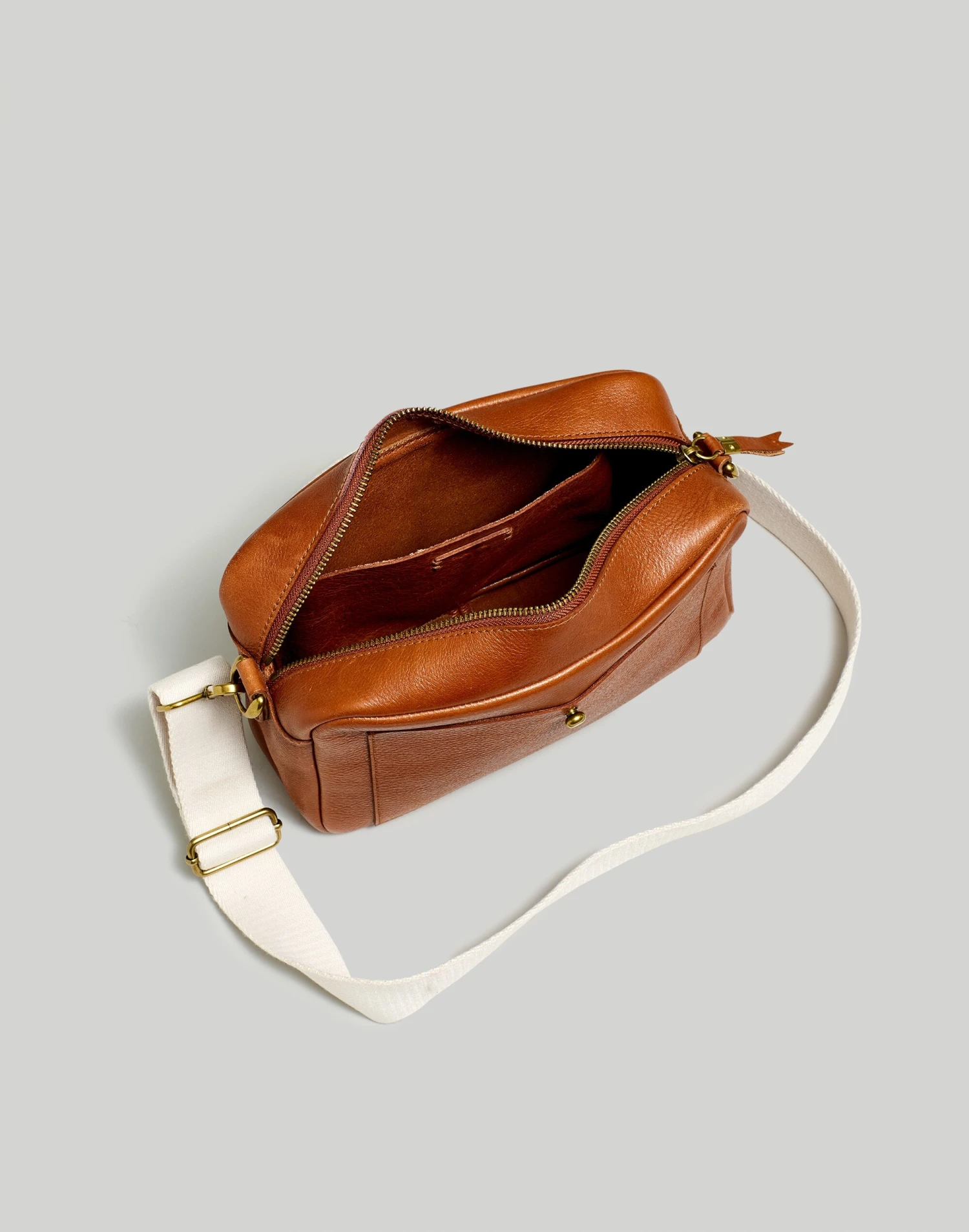A brand-new larger take on our best seller, this structured bag is big enough to fit a book, a water bottle or even your fancy camera. Made of high-quality leather that breaks in beautifully, it’s cool, convenient and customizable with two strap styles to choose from (one’s matching, one’s wide and webbed).