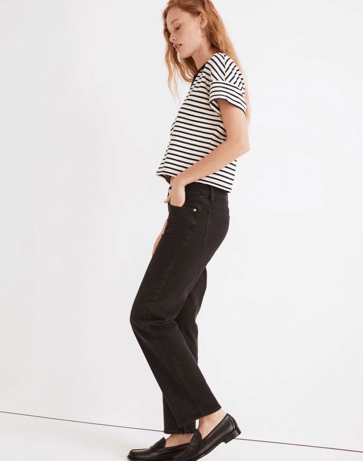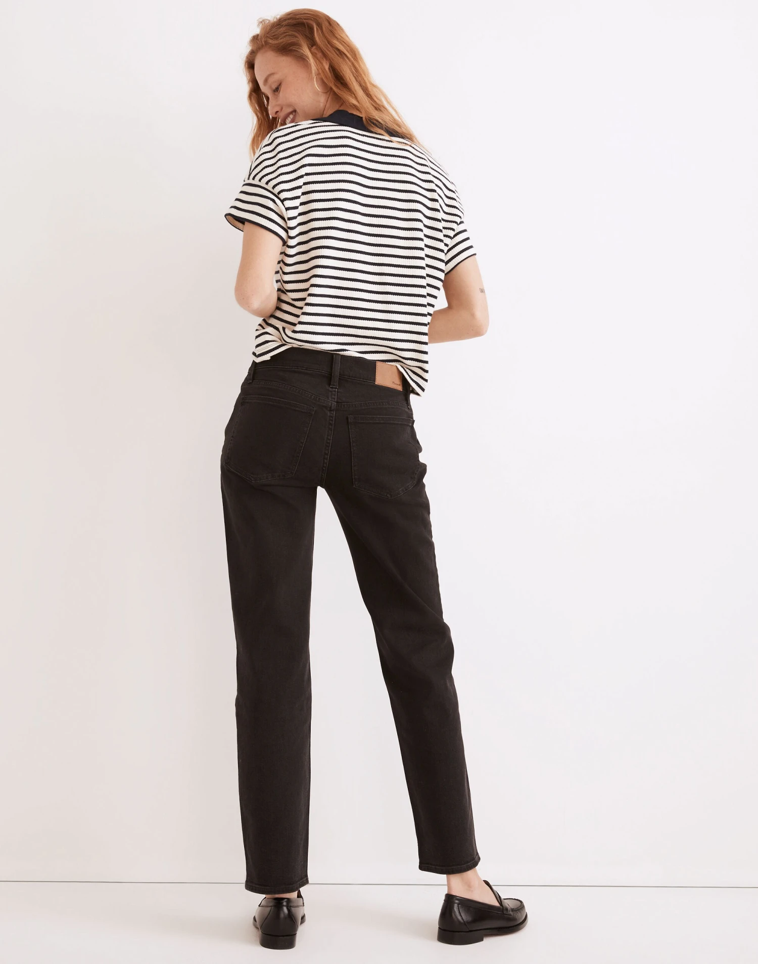 The cut: we reworked our best-selling straight momjeans with a slouchy low rise that sits on the hips (without flashing your undies). The fabric: premium denim that combines the holds-you-in structure of rigid with a touch of stretch for day-one comfort.