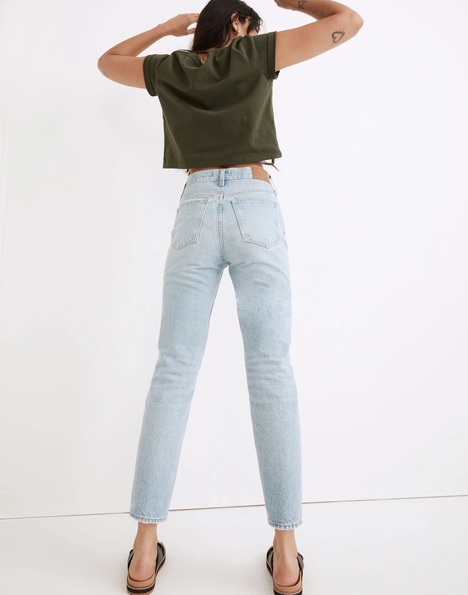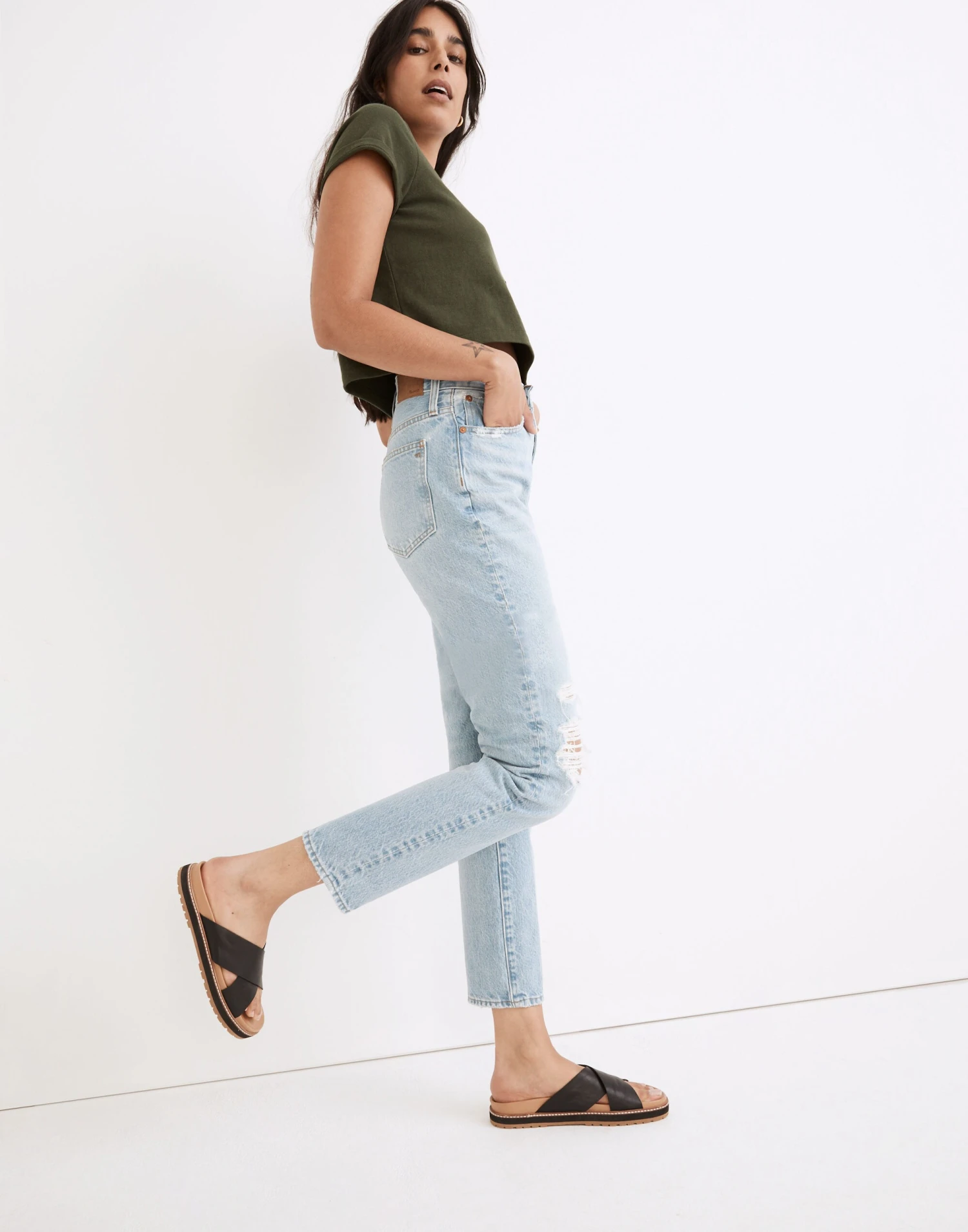 The cut: With their waist-accentuating high rise and tapered legs, these are “mom jeans”…if your mom was a ’90s supermodel. The fabric: Premium 100 percent cotton denim with old-school character and zero stretch. The factory: Saitex Los Angeles brings together the best artisans in the biz and the latest in green tech to make expertly-crafted, eco-friendly pairs right here in the USA.