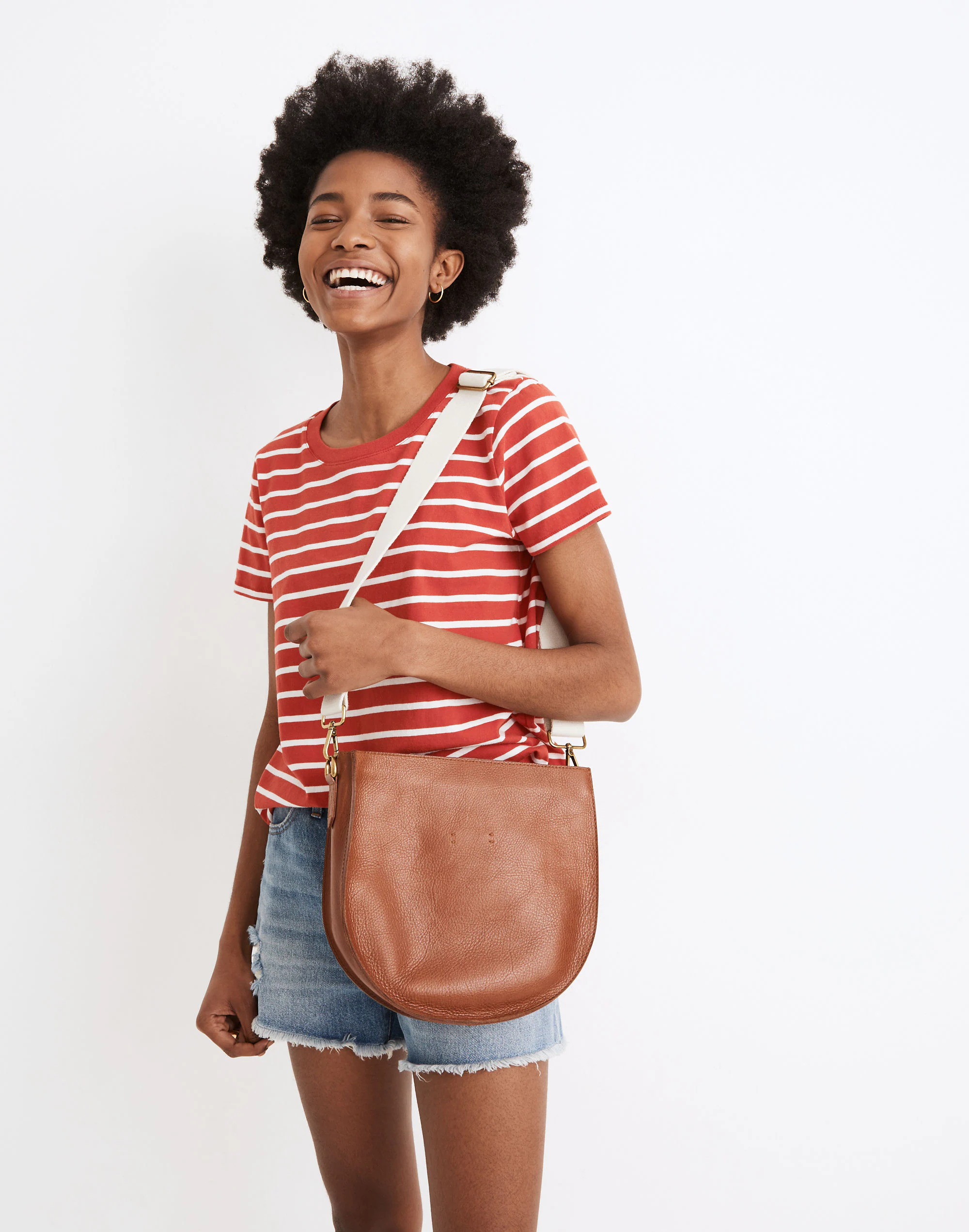 What goes into our very first Transport saddlebag? A tablet, wallet, phone, bottle of hand sanitizer and so much more—the roomy magnetic slide pocket and zippered main compartment make it easy to keep everything organized. Crafted from fine leather, it comes with two adjustable straps (one matching, one webbed).