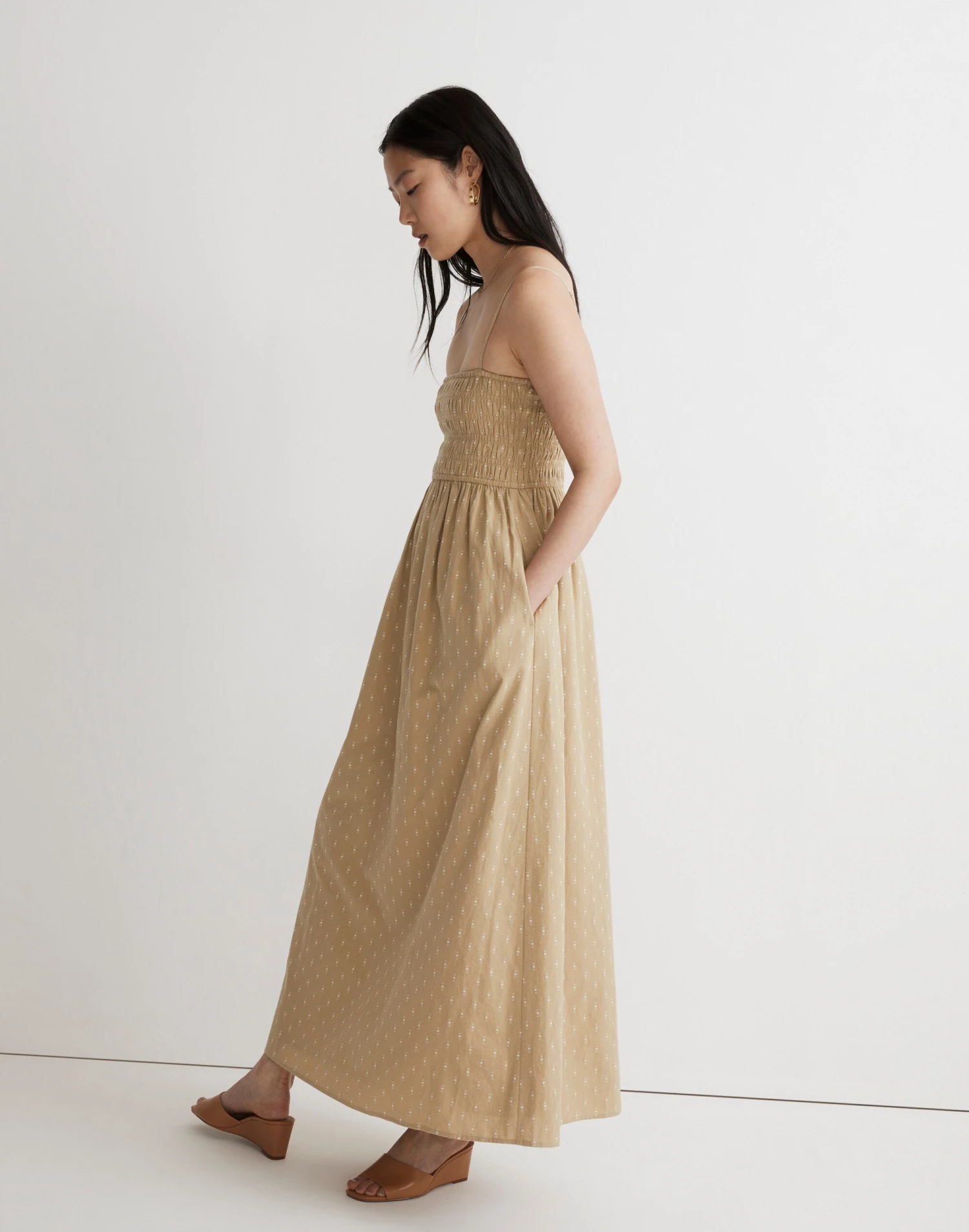 In a geometric jacquard, this sleeveless midi dress is smocked through the bodice with a high empire waist and easy A-line skirt. Light and airy in cotton dobby, just slip it on and go.