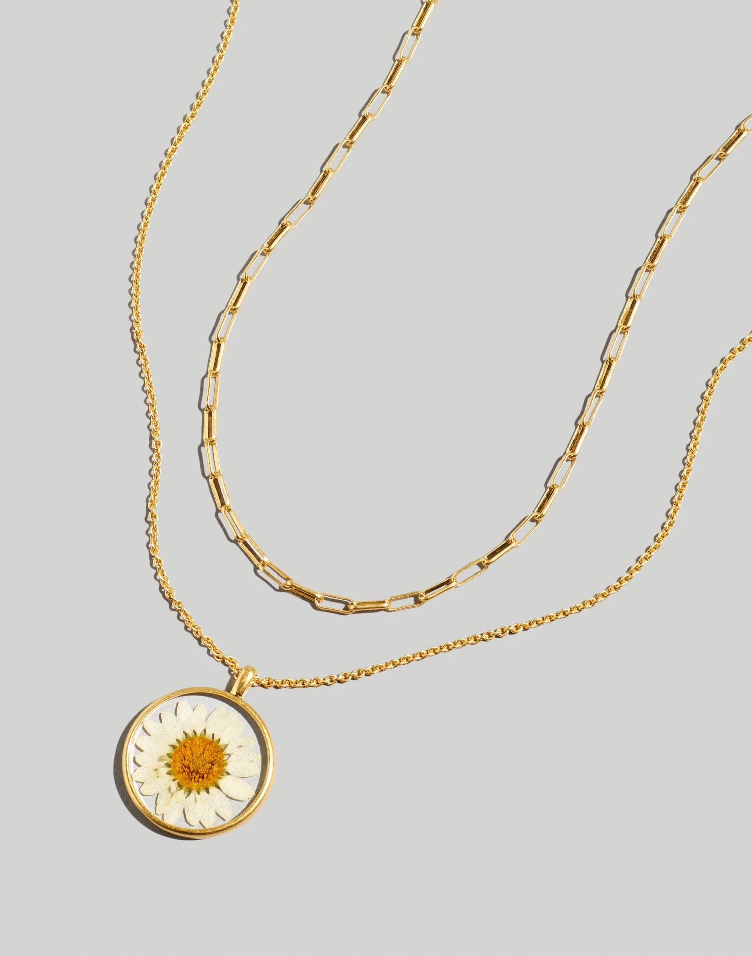 Remember pressing daisies in books? We did it in a pendant necklace as an eternal floral accent for your fingers and added in a classic paperclip chain.