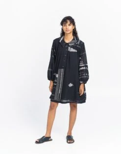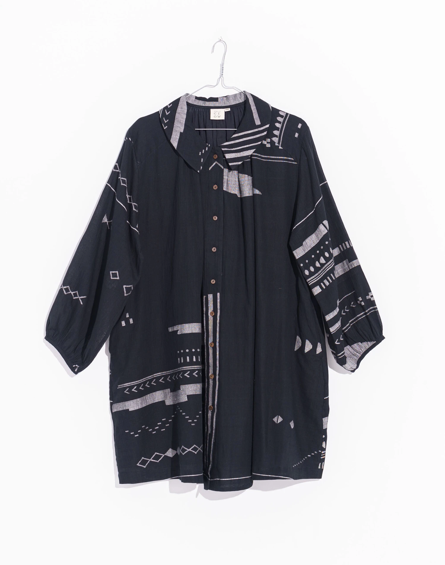 Founded in Ahmedabad, Gujarat, India by designer Shaila Khubchandani, World of Crow brings together contemporary style and traditional artisan-woven fabrics. This vintage-inspired cotton shirt dress has a peter pan collar, gentle gathers at the front and back, relaxed long sleeves with gatherings and a knee-length. The finely woven cotton fabric is hand-detailed with abstract motifs by the weavers of East India. You can style it with minimal jewels and a pair of flats or gladiators to elevate your look.